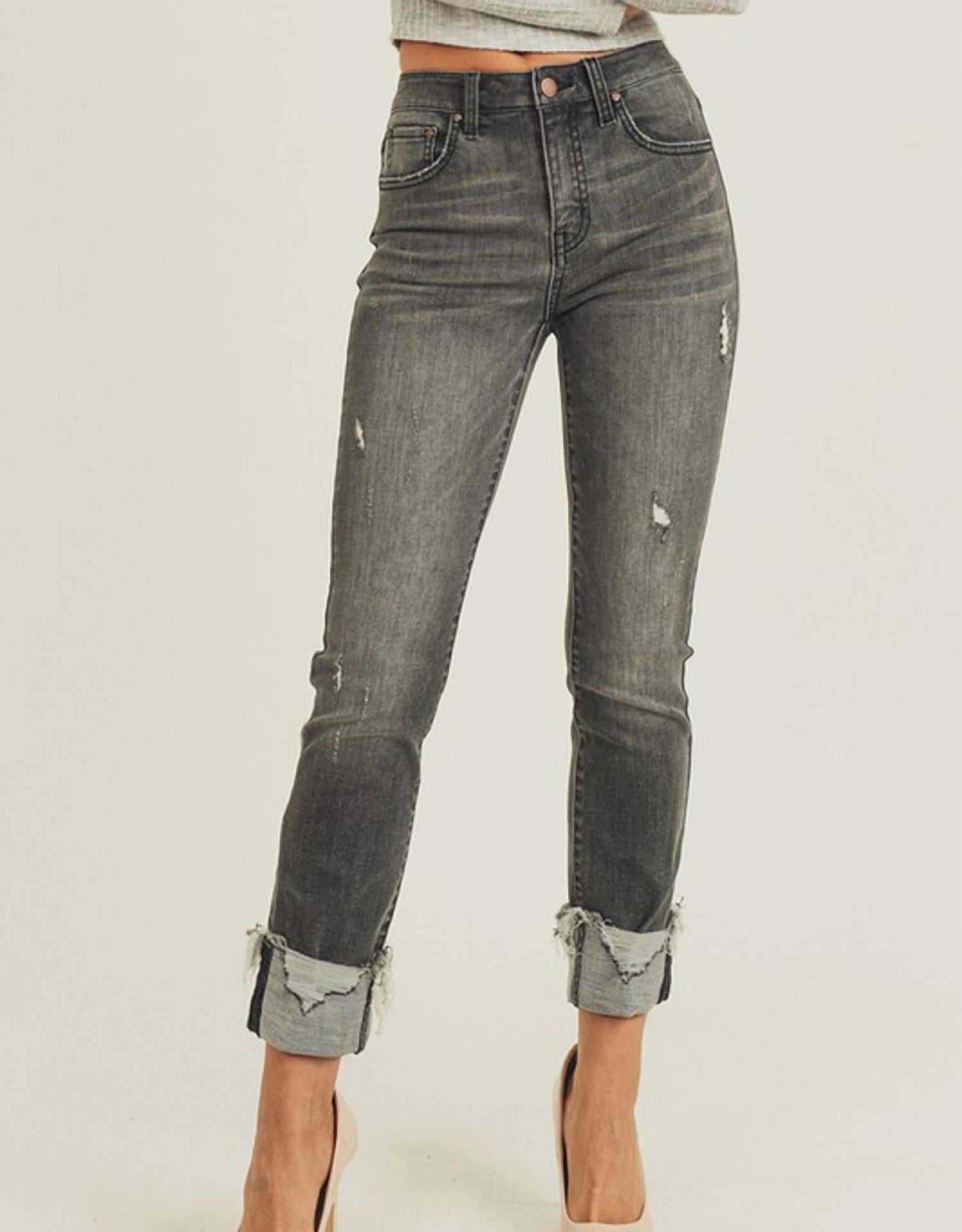 This classic straight leg jean has a perfect fit and goes with just about everything. Step out in style with the Mid Rise Frayed Cuff Ankle Straight Jeans by RISEN, designed for a modern look in dark grey. These women's straight leg jeans offer a regular fit with a comfortable mid-rise, highlighted by frayed cuffs for a trendy touch. Crafted from a cotton blend composed of 74% Cotton, 13% Polyester, 6% Viscose, 5% Elastomultiester, and 2% Spandex, they ensure both flexibility and durability. Closure is secured with a button, and the jeans feature functional pockets, making them both stylish and practical. Dimensions: Waist 26.5", Rise 9.75", Inseam 26.75" in a size 3/26. Model Info: Height 5'9", Waist 24", Hips 36".