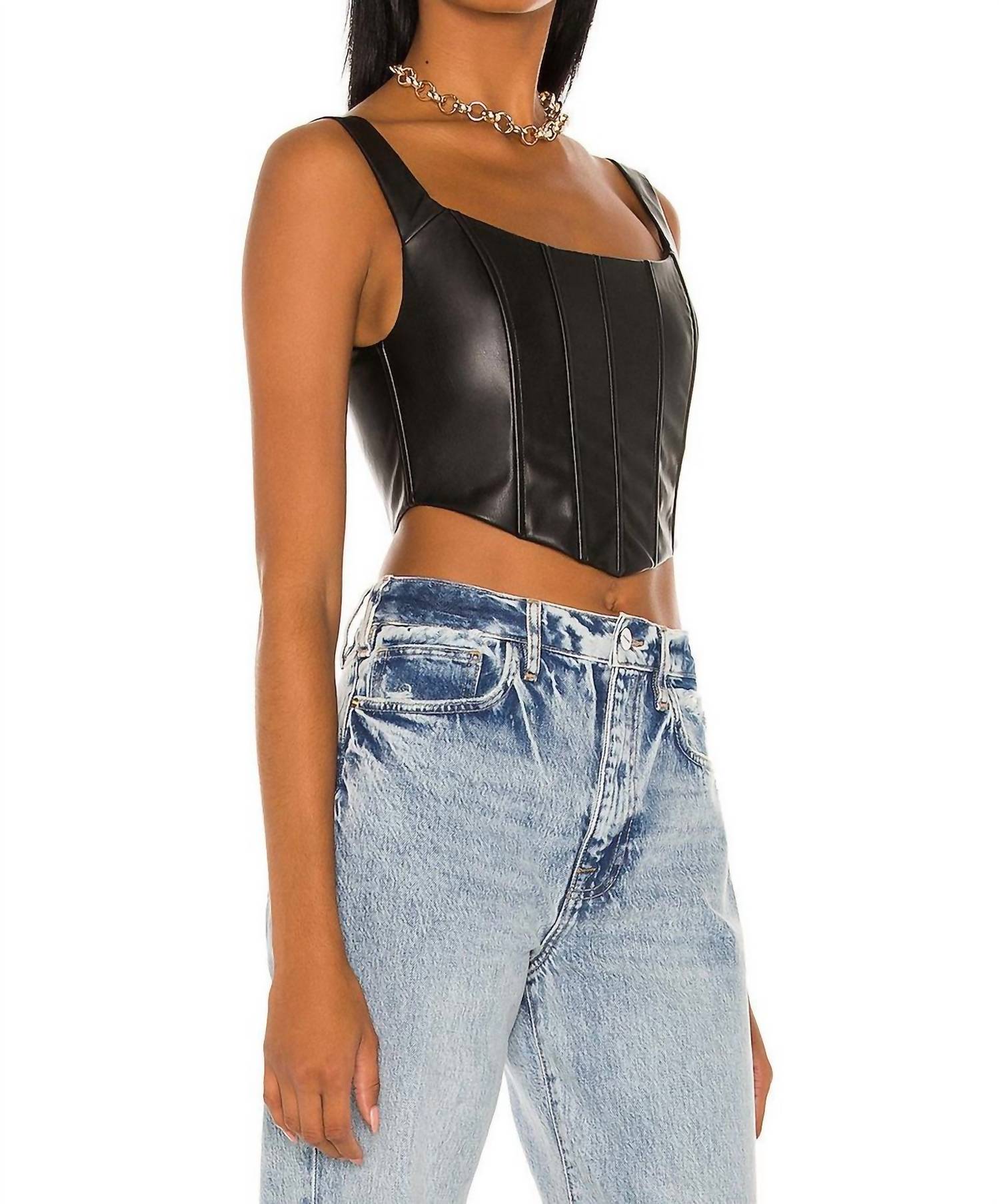 The perfect crop top for those warmer weather days. Discover the Nova Corset Hem Top by MISHA, a striking addition to your spring wardrobe in chic black. This sleek, sleeveless top features a boned bodice with a corset hem and a scoop neckline, crafted from 100% polyurethane faux leather for a modern monochrome aesthetic. The exposed back zipper ensures a secure fit. Care instructions: Spot or wipe clean only.