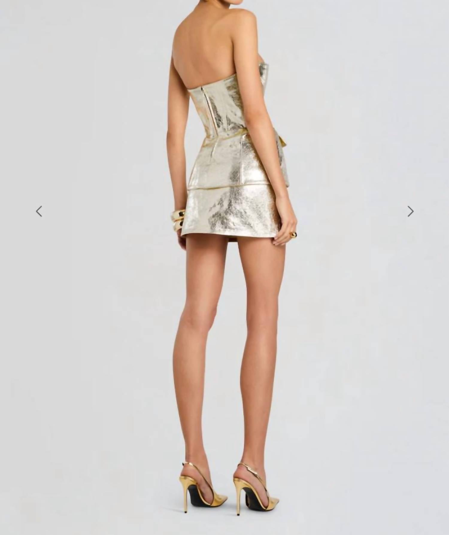 A timeless blouse that will never go out of style. Introducing the Annie Leather Top by RETROFETE, a stunning strapless piece that exudes luxury in an elegant gold hue. Crafted from 100% lambskin, this top is made in India, showcasing exquisite craftsmanship. With its strapless design and solid pattern, it offers a sleek silhouette suitable for both casual and upscale occasions. Model is 5'10" and wearing a size XS.
