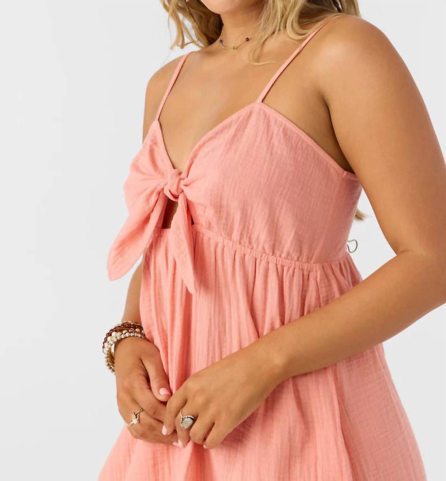 Cute and comfortable, this long sleeve dress has it all. Introducing the O'NEILL Natalya Dress, a boho chic staple in a canyon clay hue. This sleeveless mini dress, made from 100% cotton crinkle double gauze, measures 27 inches in length and offers lightweight comfort for summer. Design features include a v-neck with a front tie detail and keyhole, adjustable shoulder straps, smocked back, and practical side seam pockets. Closure is pull-on, and care is simple with machine washing recommended. Ideal for vacation-ready style with a solid color and shift silhouette.