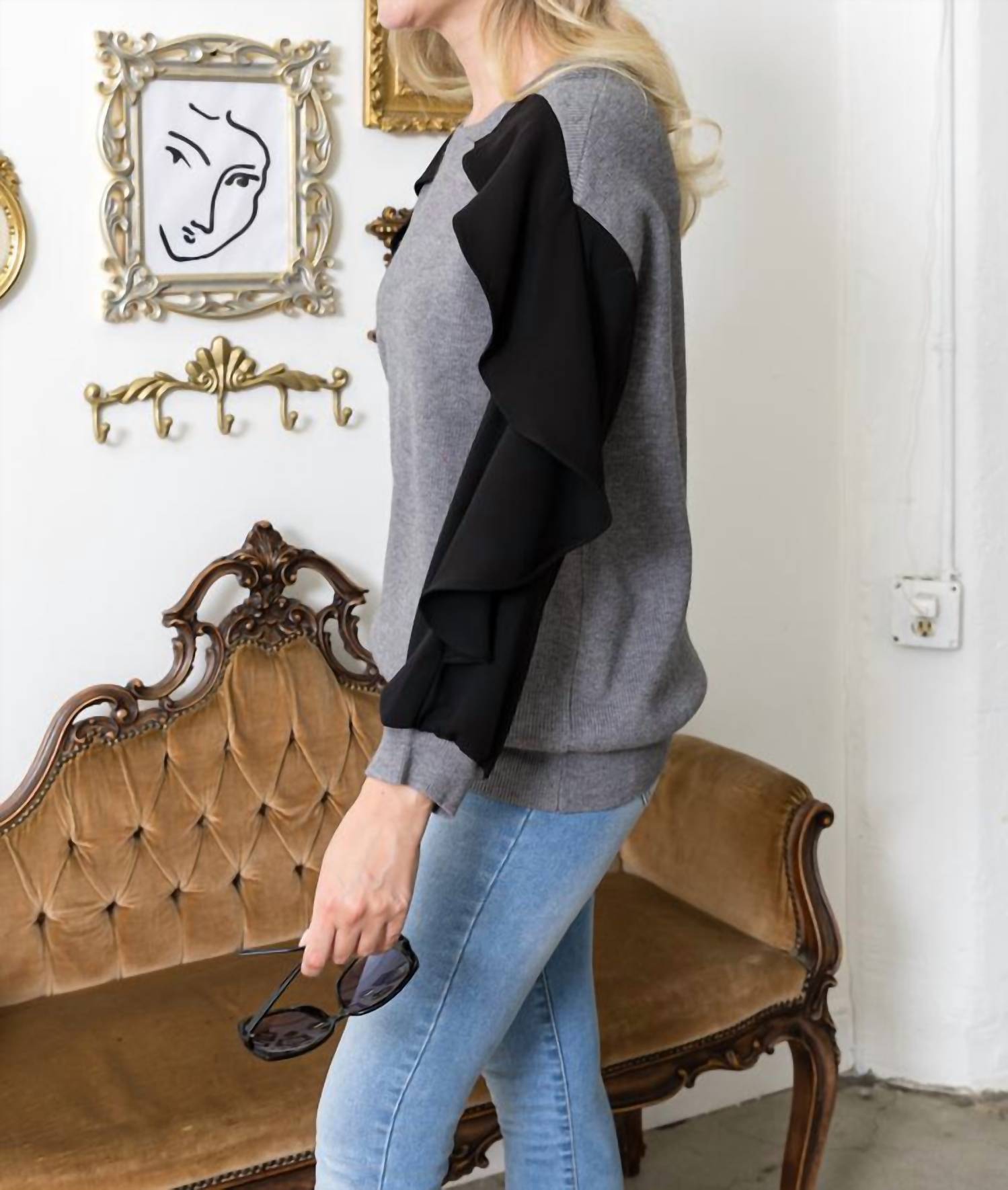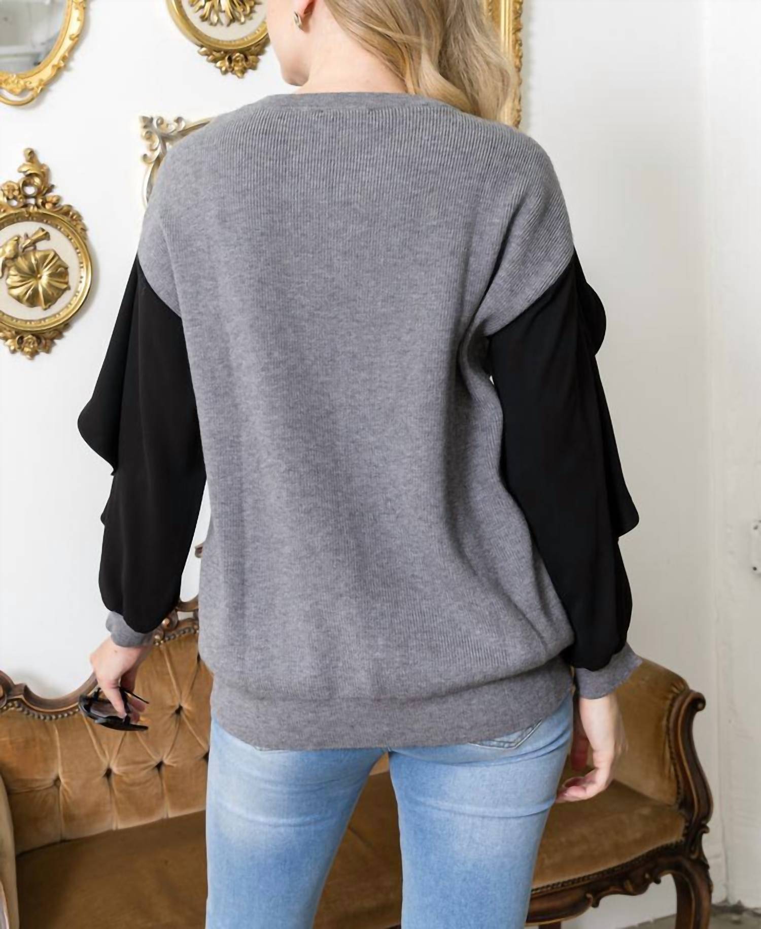 The perfect long sleeve tee that goes with just about anything. Introducing the Shane Top by JOH, a sophisticated addition to any wardrobe in an elegant gray hue. This long sleeve tee is expertly crafted from a viscose blend, featuring a flattering crew neck, contrast flutter sleeves, and ribbed cuffs. Composition includes 35% viscose, 30% polyamide, 19% polyester, and 16% nylon. Ideal for holiday occasions or elevating everyday style.