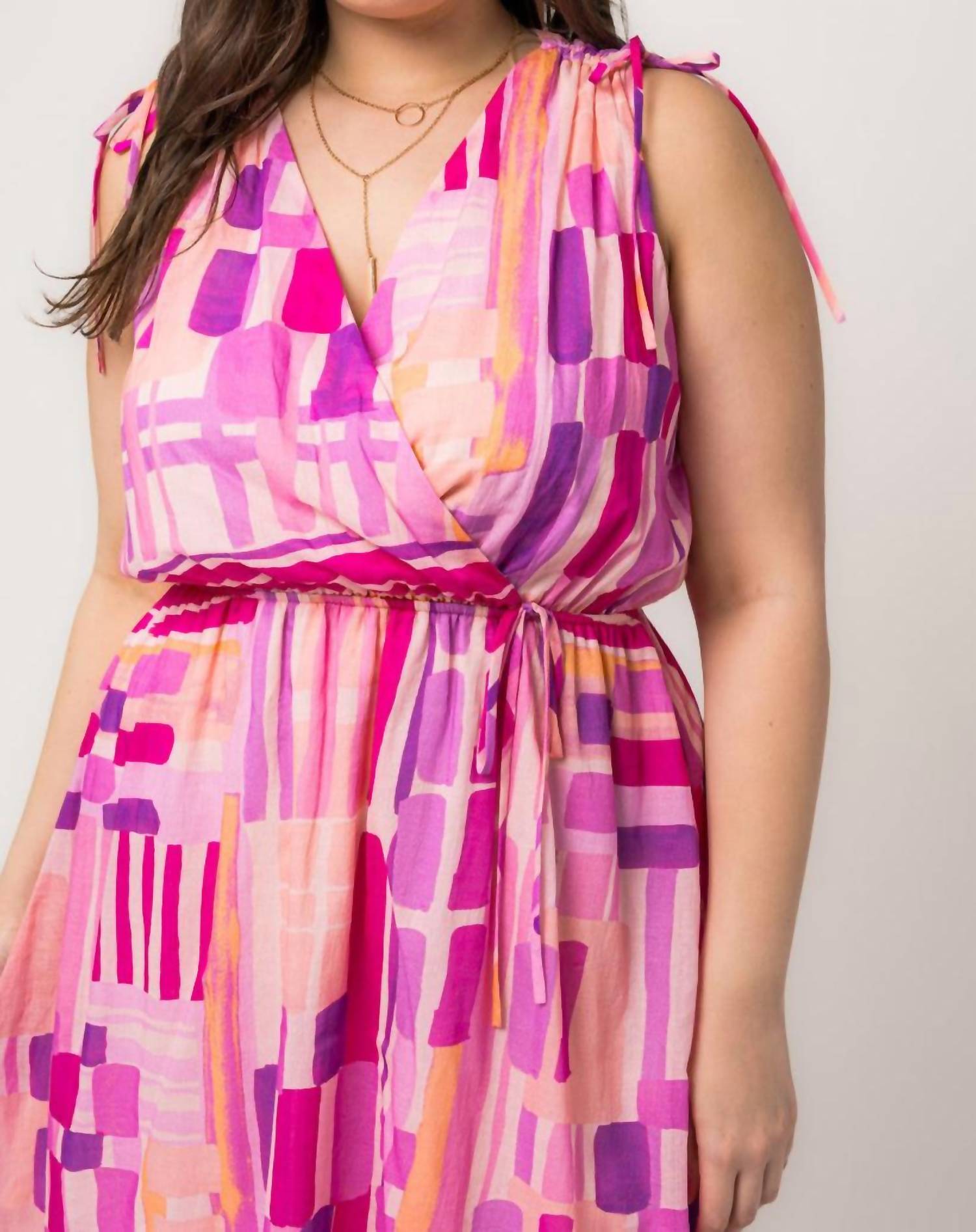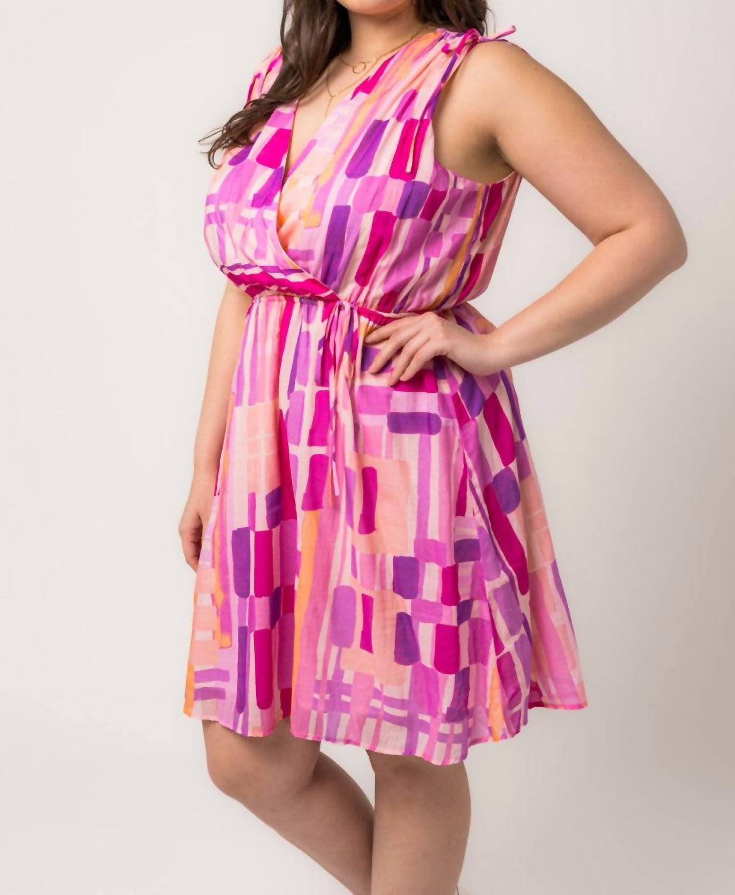 Comfortable and cute, this casual day dress has it all. Introducing the Melissa Curvy Dress by GILLI, designed to enhance your summer style with ease. This sleeveless A-line dress, featuring a flattering elastic waist and V-neck, offers a chic look for any occasion. Made from a blend of 100% rayon and lined with 100% polyester, it boasts a versatile patterned print in playful pink. Enjoy the convenience of a pull-on closure and easy care with hand wash cold and line dry instructions.