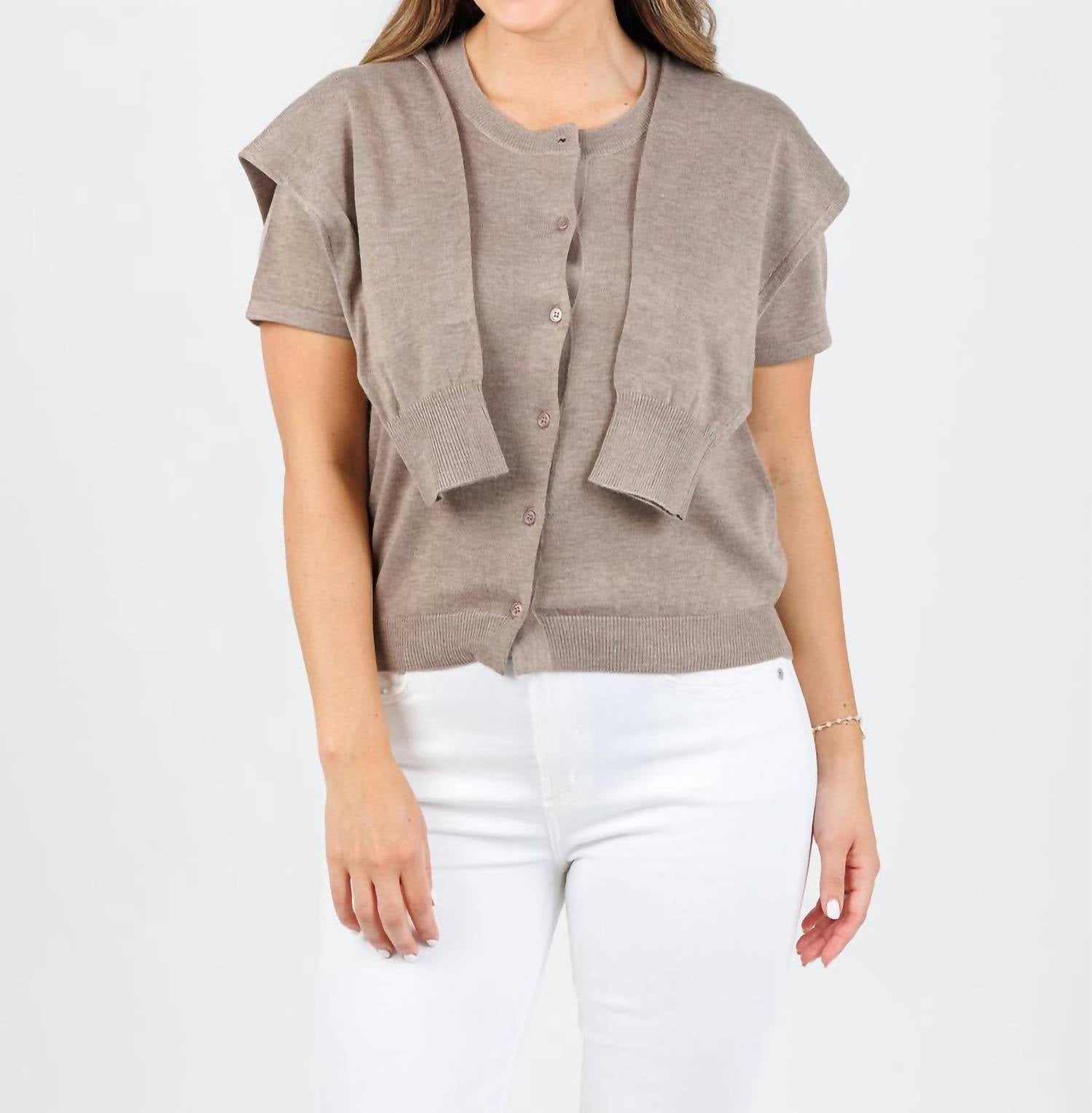 This cardigan will be a sweater-rotation favorite. Embrace playful sophistication with the Suncoo Genna Sweater, a taupe masterpiece perfect for transitional seasons. This short-sleeve sweater is crafted from a luxurious blend of 78% Wool, 20% Polyamide, and 2% Elastane. It features a unique faux-layered look with a draped back and a sweater-over-shoulders effect, all set off by a classic crew neckline. Whether paired with tailored trousers for a polished look or denim for a casual vibe, this versatile piece is your style staple. Model is wearing a size S (5'6" height, 34" bust, 28.5" waist, 31" hip, 29" inseam).