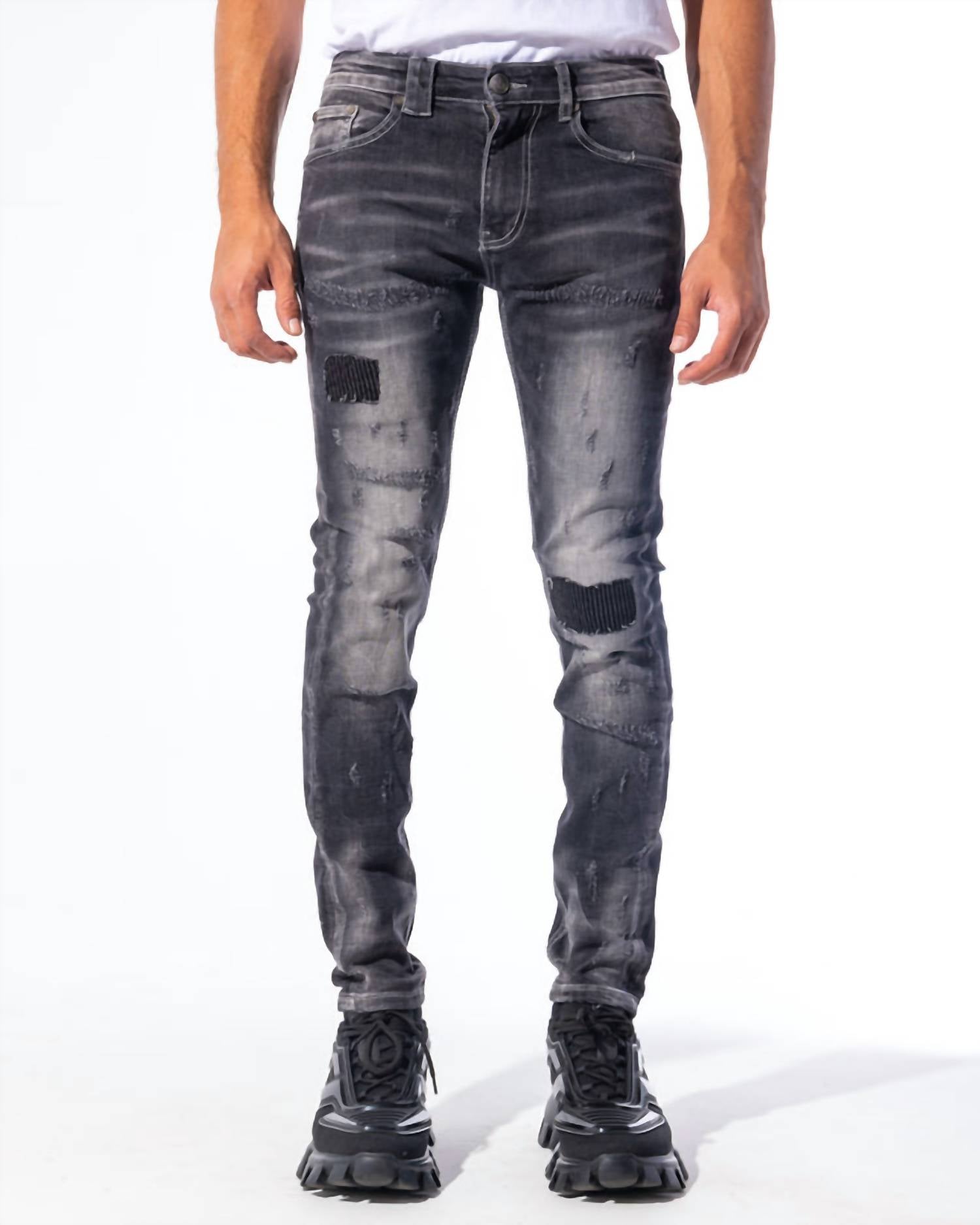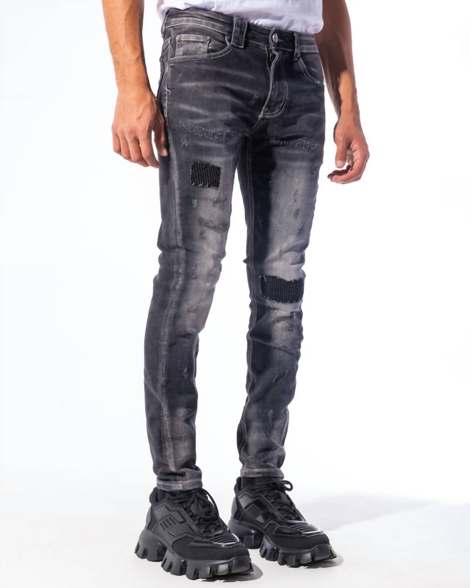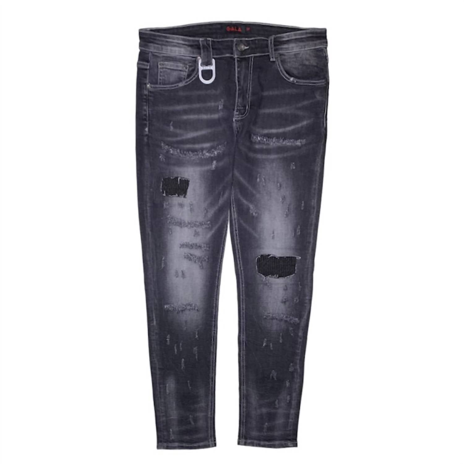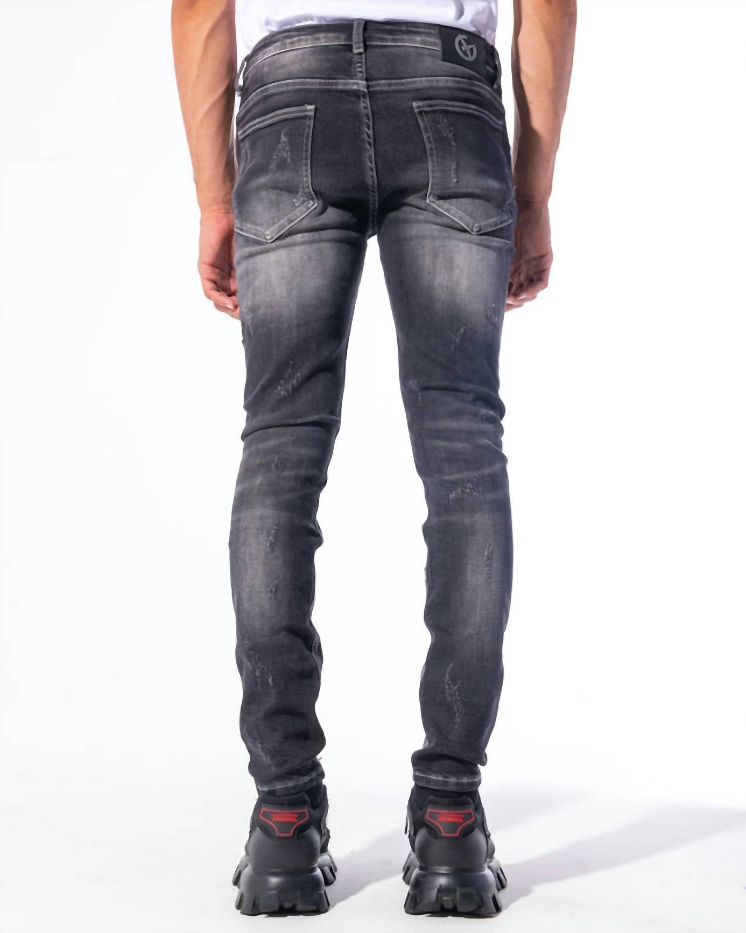 Black wash stretch tapered denim with disordered distressing. Distressed. Skinny fit. Removable key ring. True to size. Model is 6'1" wearing a size 30. Machine wash cold. 98% Cotton, 2% Elastane.