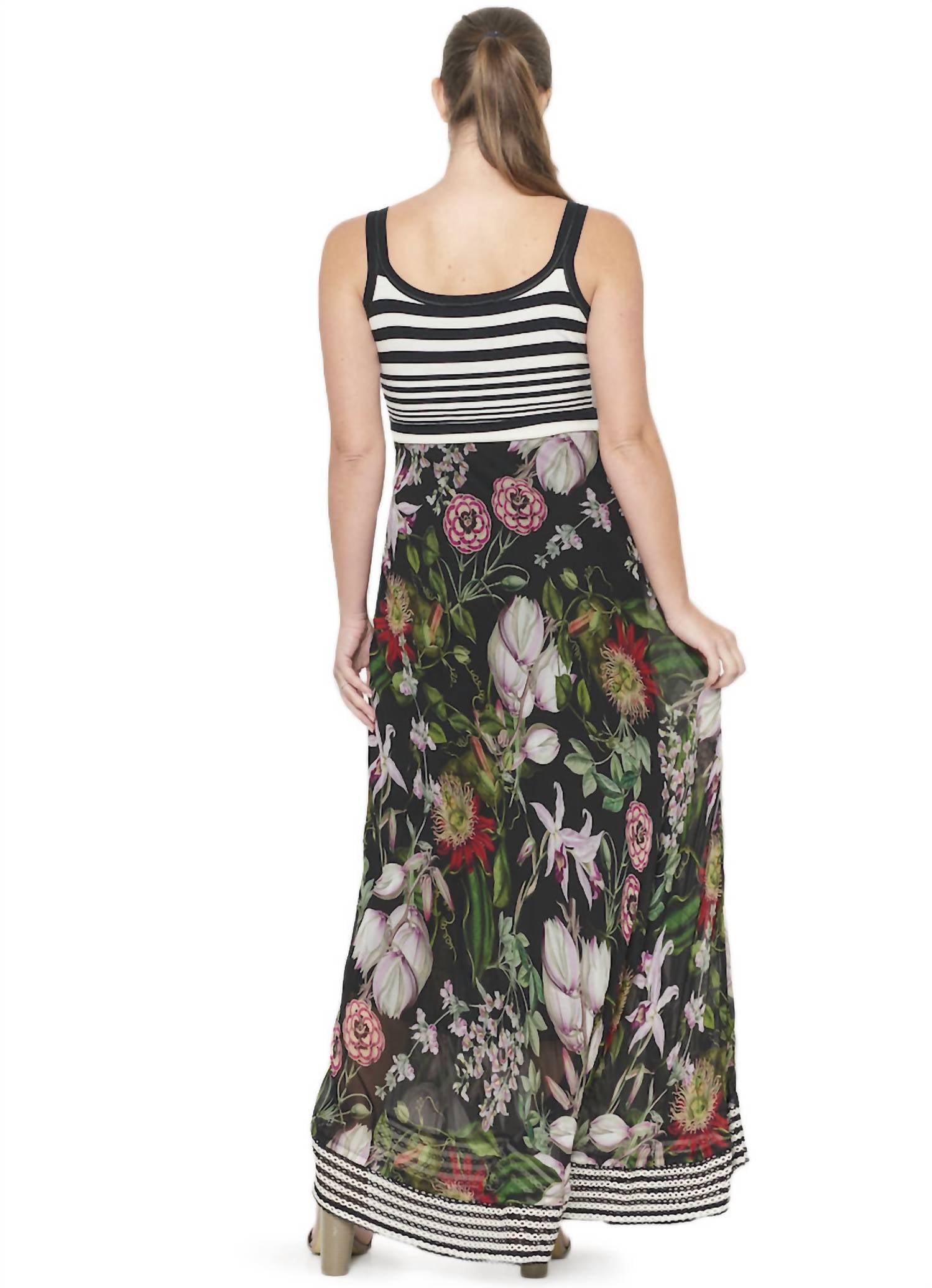 Botanical Maxi Tank Dress is a favorite silhouette from Beate Heymann street couture. This style,always popular and effortless, available in a bespoke floral print with a contrast knit bodice and lingerie staps. Weighted contrast stripe detail at hemline gives some swing to this amazing dress. Maxi length. Perfect for event dressing and weddings or wear as your casual everyday look on the town. 100% viscose chiffon, bodice cotton/elastane
