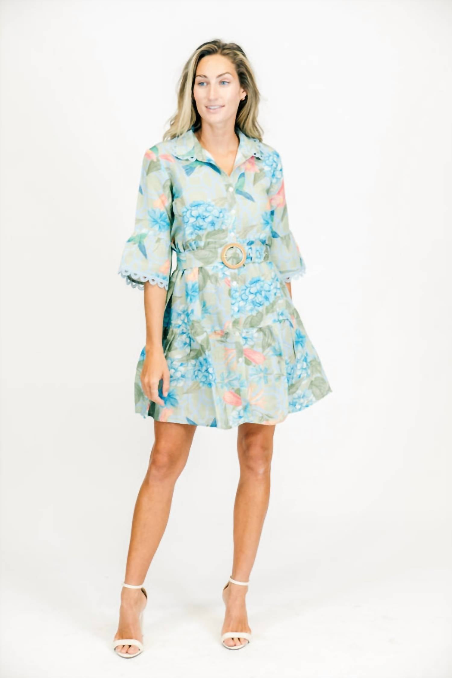 The perfect mini dress for those warmer months. Introducing the Darcy Lotus Mini Dress by Marigold, a vibrant floral piece in multi-color that's perfect for your spring wardrobe. Crafted from 100% linen and hand-crafted by artisans in Jaipur, India, this dress features a V-neck and three-quarter fluted sleeves for a chic look. Its shift silhouette, tiered skirt, and convenient side pockets make it both stylish and practical. Closure: Button closure. Care: Hand wash only, line dry.
