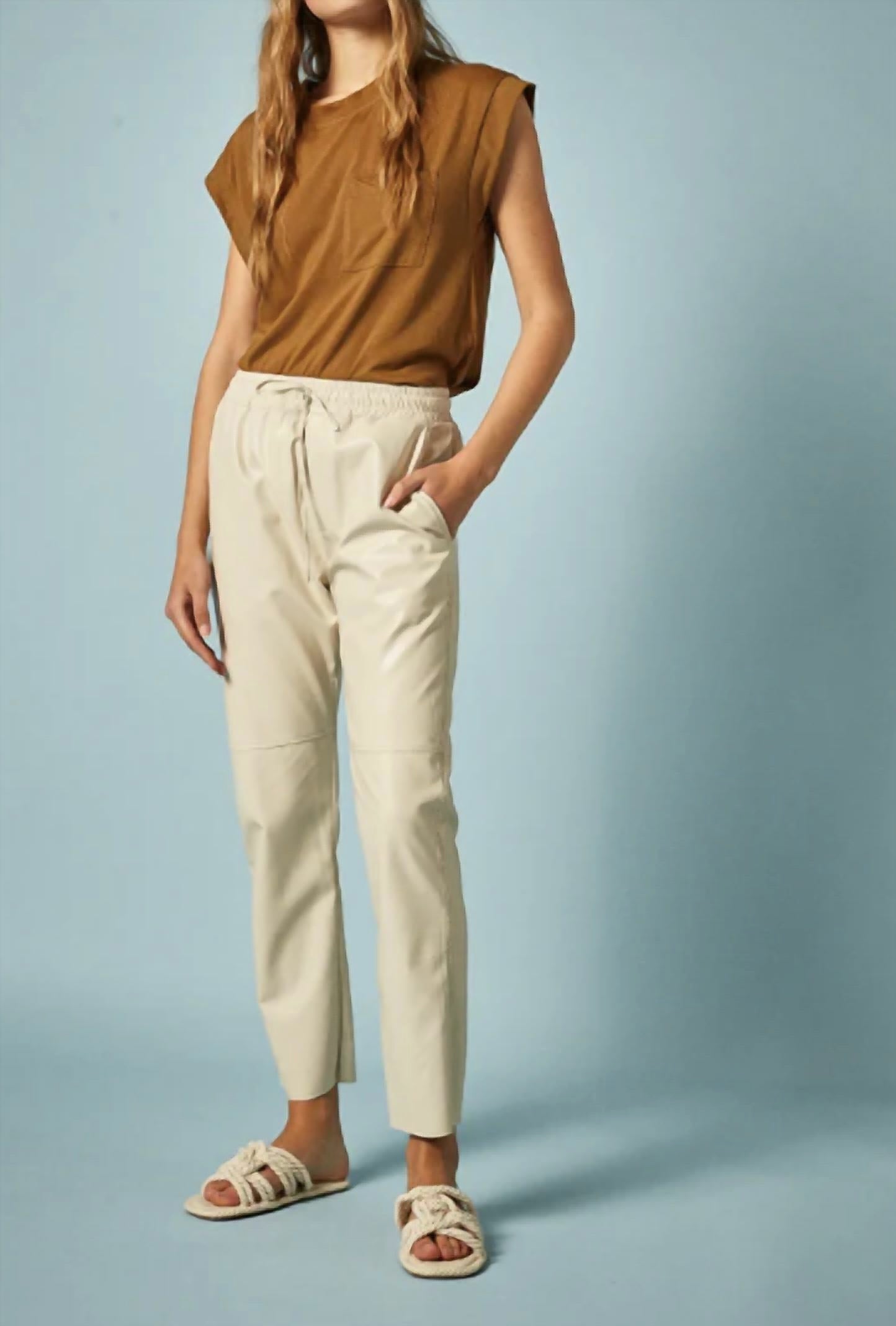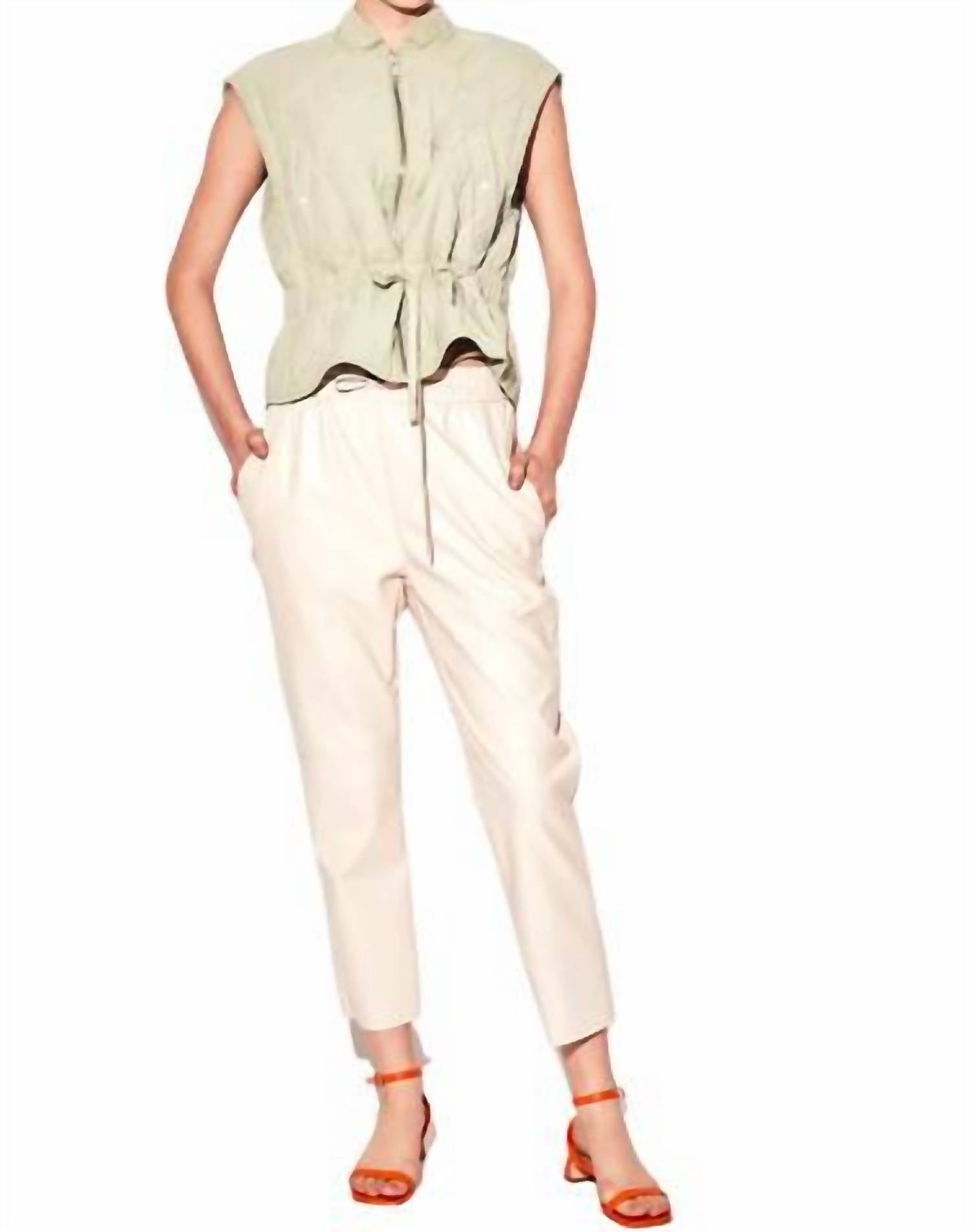 A straightleg pant that workes season after season. Dress these up with your favorite blouse or keep it casual with your go-to tee. Introducing the Vegan Leather Fleetwood Pants by DELUC, a stylish choice for women seeking a chic, solid pattern design. These straight-leg pants are crafted from 100% polyurethane in an elegant pearl hue, featuring a pull-on closure with an elastic waist for comfort. With two convenient pockets, they provide practicality alongside their sleek appearance.