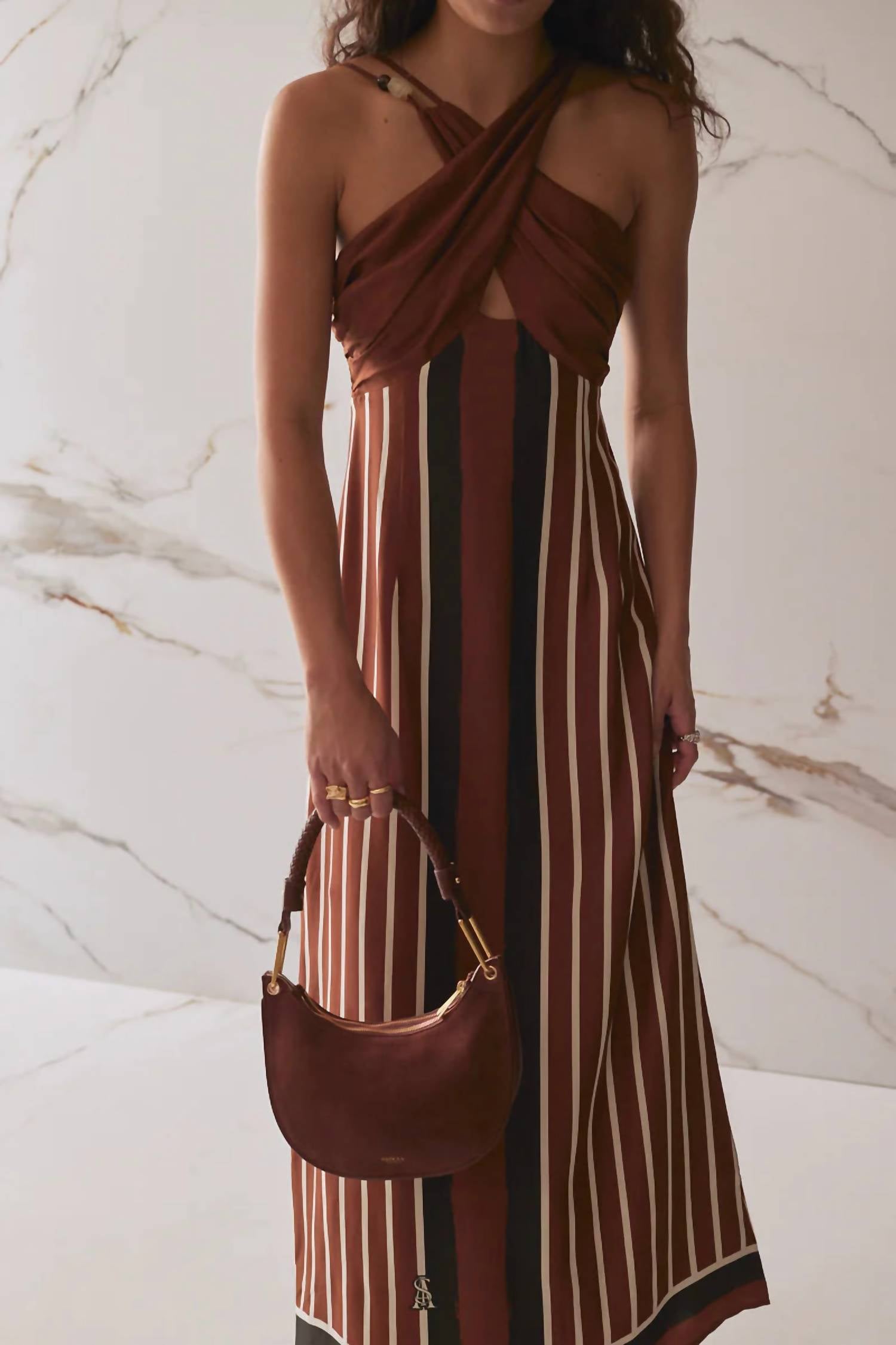 A maxi dress that is just as cute as it is comfortable. Elevate your vacation wardrobe with the Ellery Maxi Dress by Sancia in a striking Cherrywood Stripe. This sleeveless, boho chic A-line dress features a halter neckline and a crossover bust, enhanced by a shirred back panel and delicate resin beading on the strap. Made from 100% Viscose, this dress offers a luxurious drape and comes with a secure zip closure. Care for this piece by hand washing and line drying to maintain its vibrant summer allure.