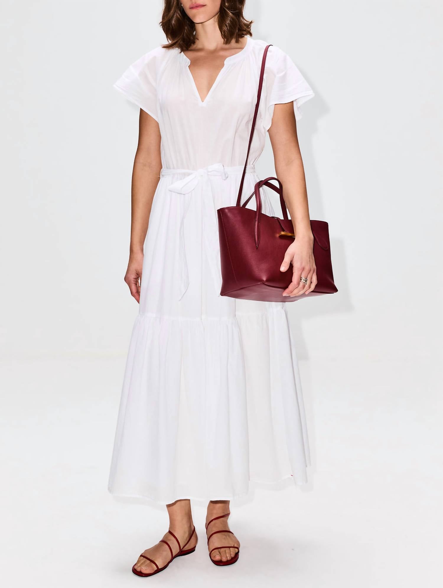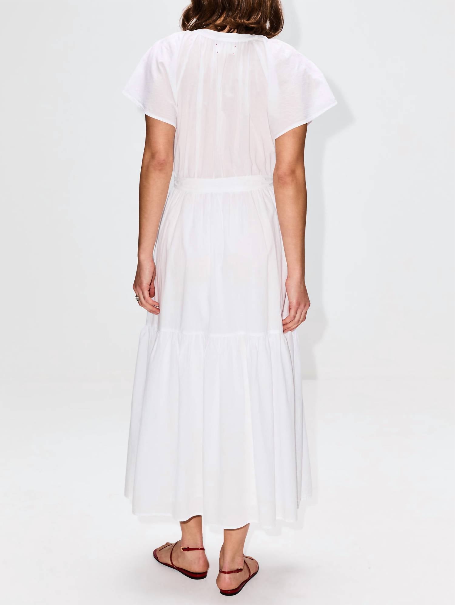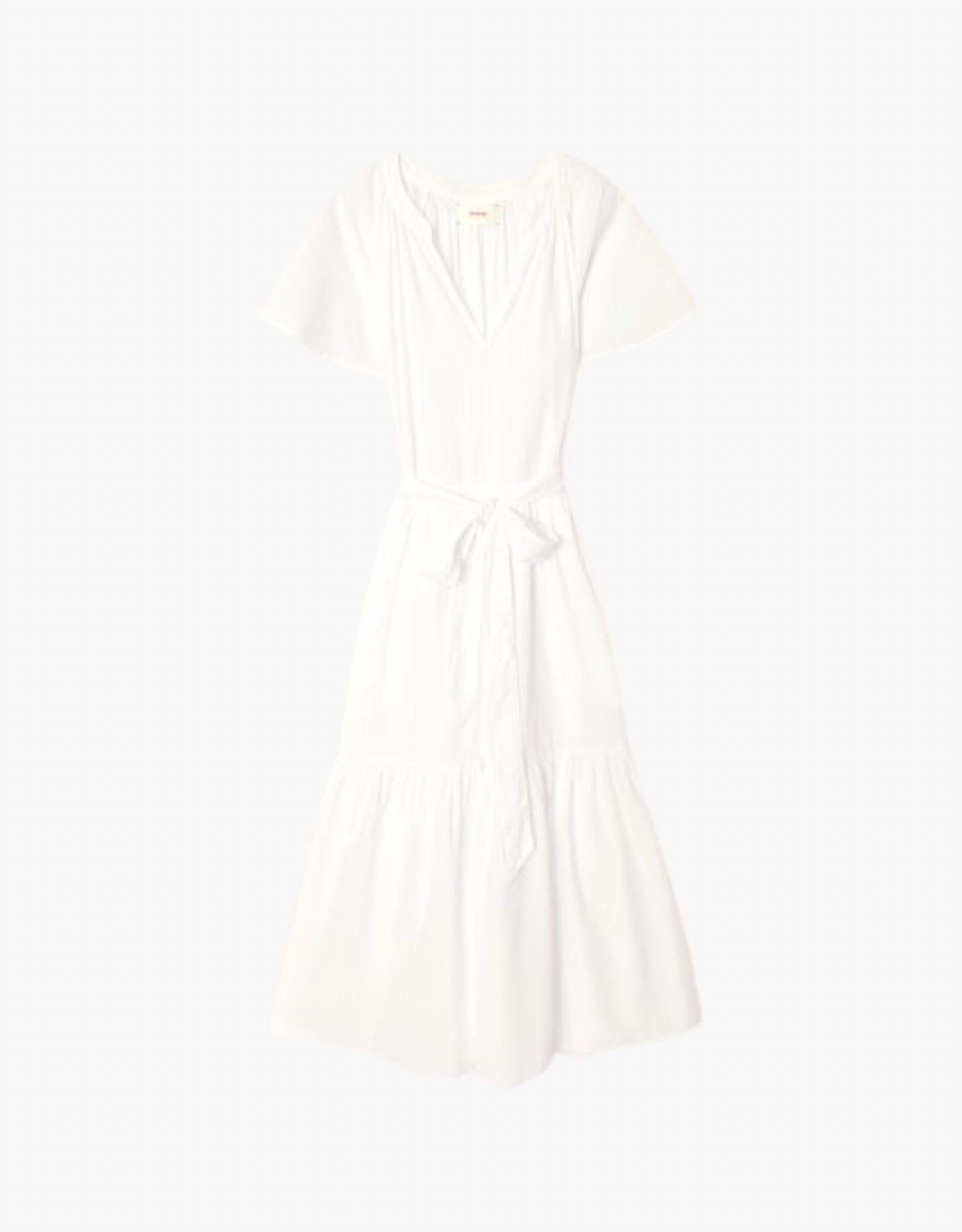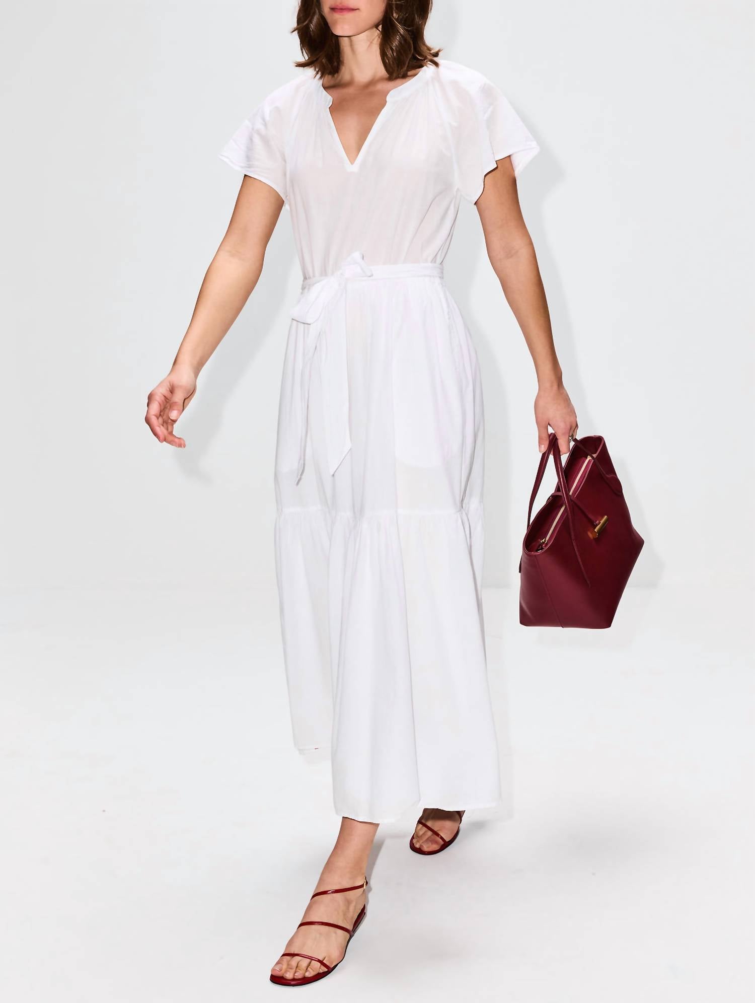 Who doesn't love a good maxi dress? This one you'll be reaching for season after season. Meet the Joy Dress by XIRENA, a maxi dress that embodies both comfort and elegance in pure white. With short sleeves, this 100% cotton dress offers a flattering fit and is made in the USA. It features a feminine v-neck, a waist tie, and classic tiers to elevate your look. Care for this solid pattern piece with a machine wash in cold water with like colors.