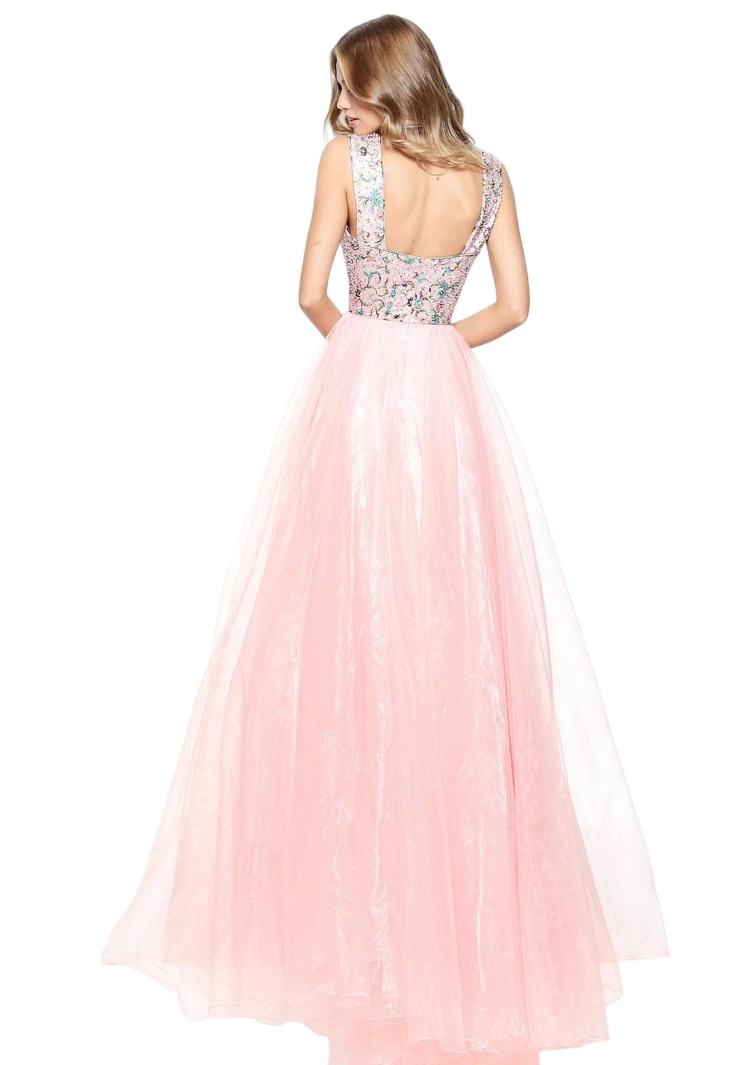 Features a plunging V-neck. Beaded bodice. A-line. Full length.