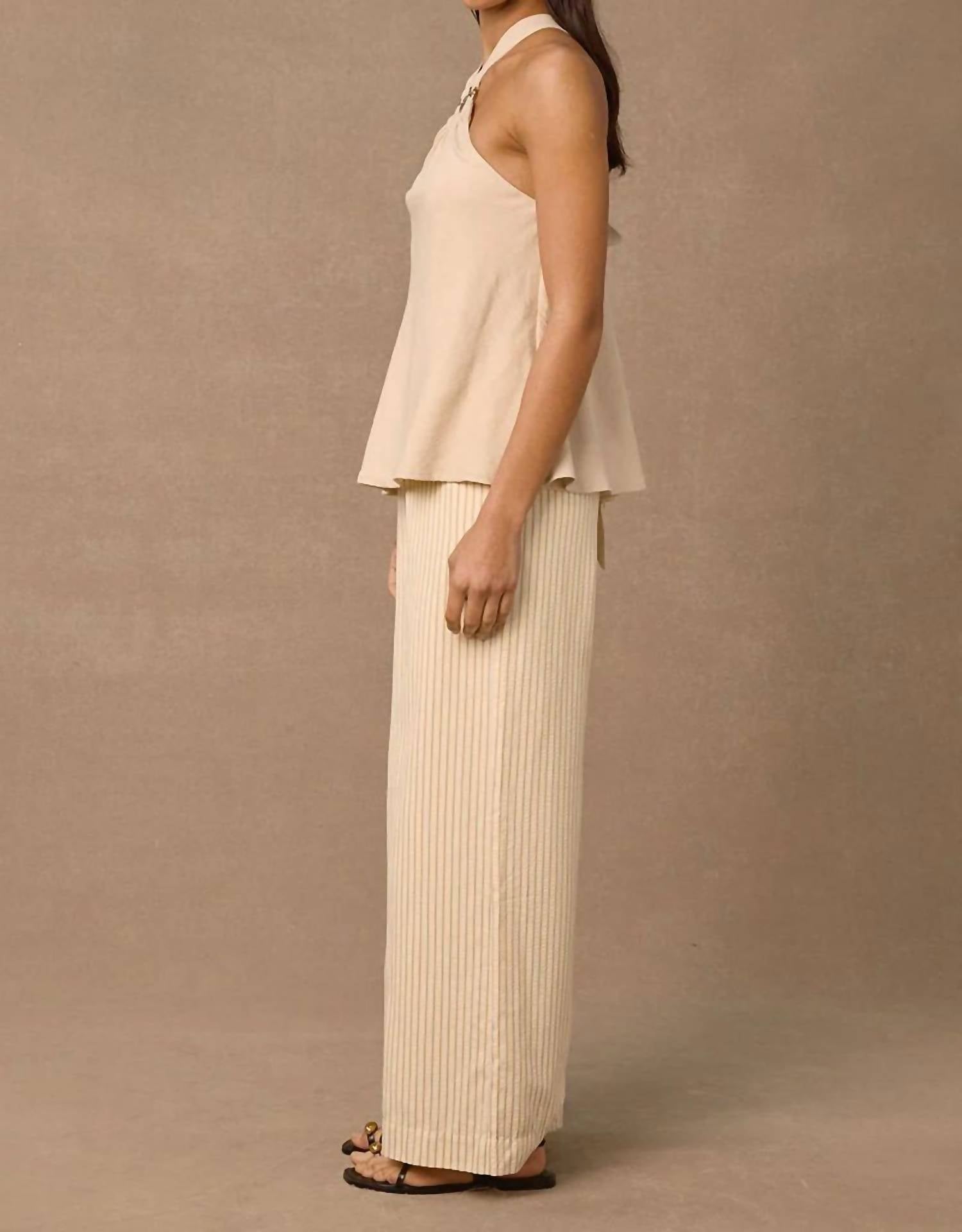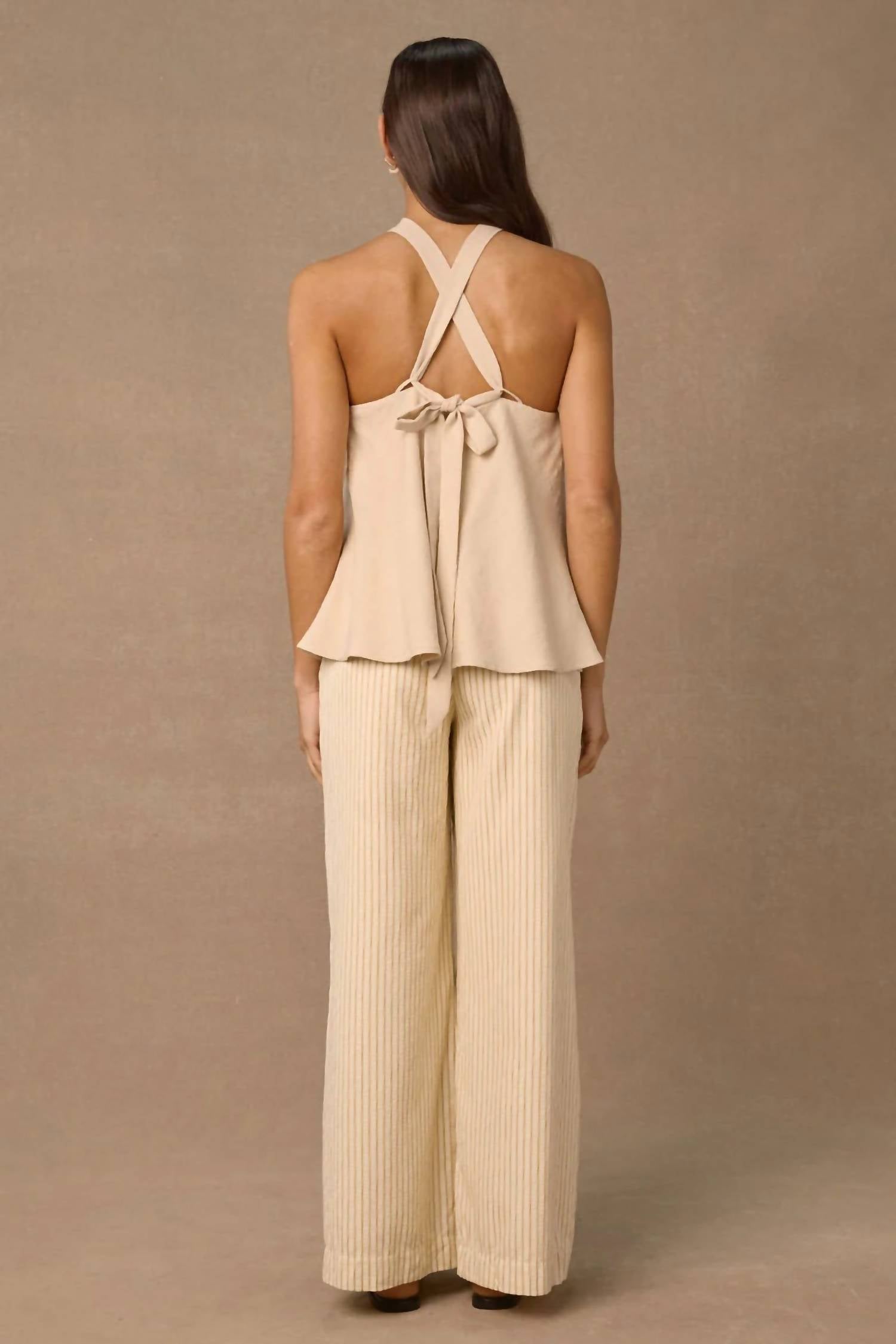A versatile blouse that works from desk to dinner! Embrace minimalist elegance with the Aelia Sleeveless Top by MON RENN in a sophisticated sand hue. This blouse showcases a halter neckline with a striking ring detail and versatile straps that can be styled in multiple ways. Crafted from a blend of 55% Rayon, 35% Polyester, and 10% Linen, it features a relaxed A-line fit with an invisible zipper closure at the side seam. Ideal for spring dinner parties or Thanksgiving gatherings.