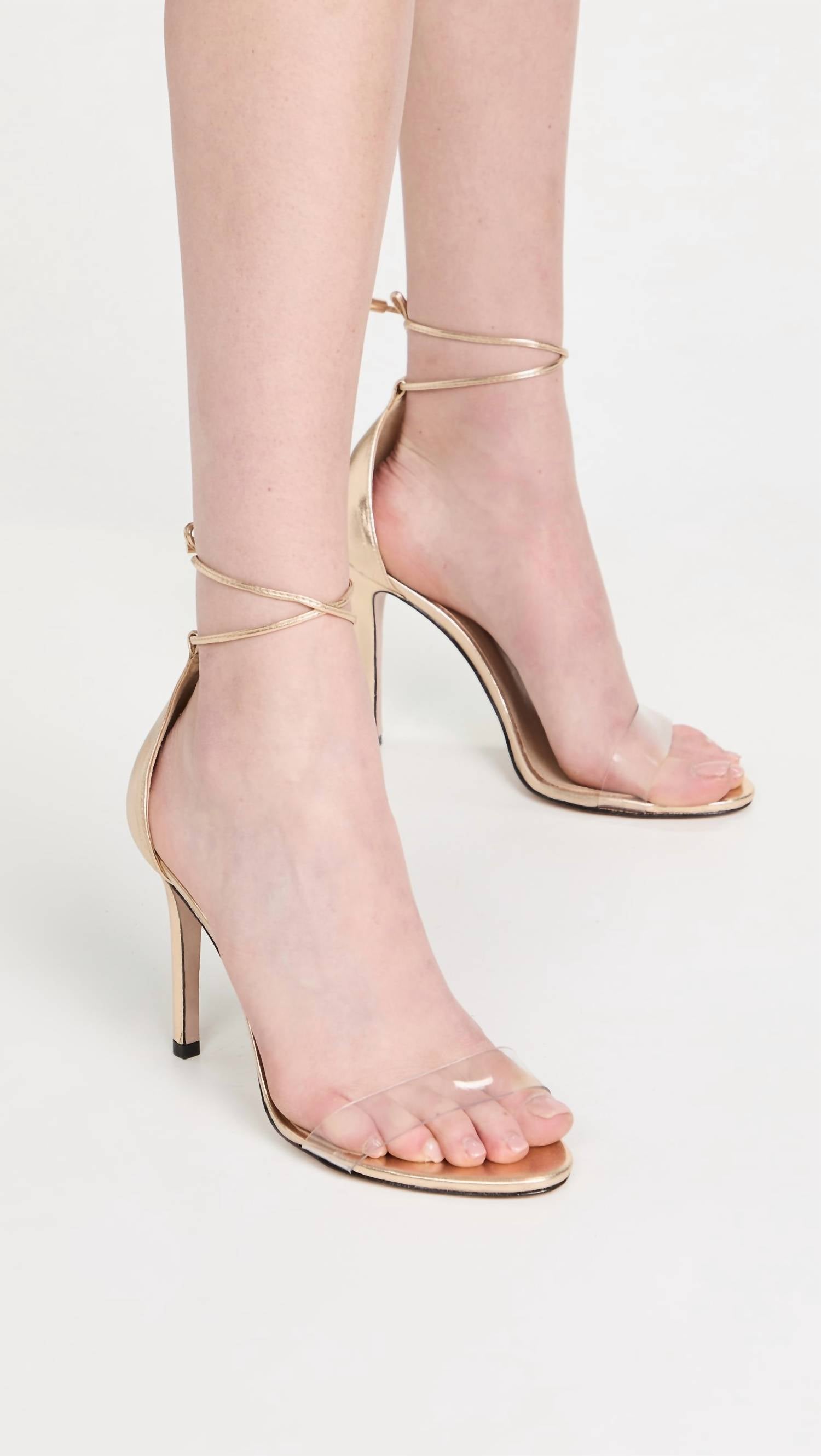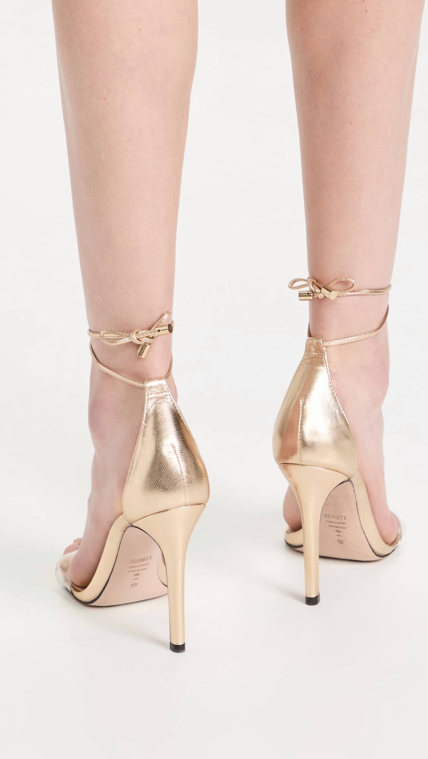 Don't be deceived, these heels are comfy as can be. Step into elegance with the Josseana Sandal by SCHUTZ, where metallic Nappa leather meets clear vinyl for a striking, mixed-media design. Featuring a unique strap upper and a 4.1-inch stiletto high heel, these sandals bring sophistication to any dinner party look. They showcase a lace-up closure with a closed counter, perfect for achieving a secure fit. With a rubber patch at the heel for added comfort, these Brazilian-made sandals are crafted to impress.