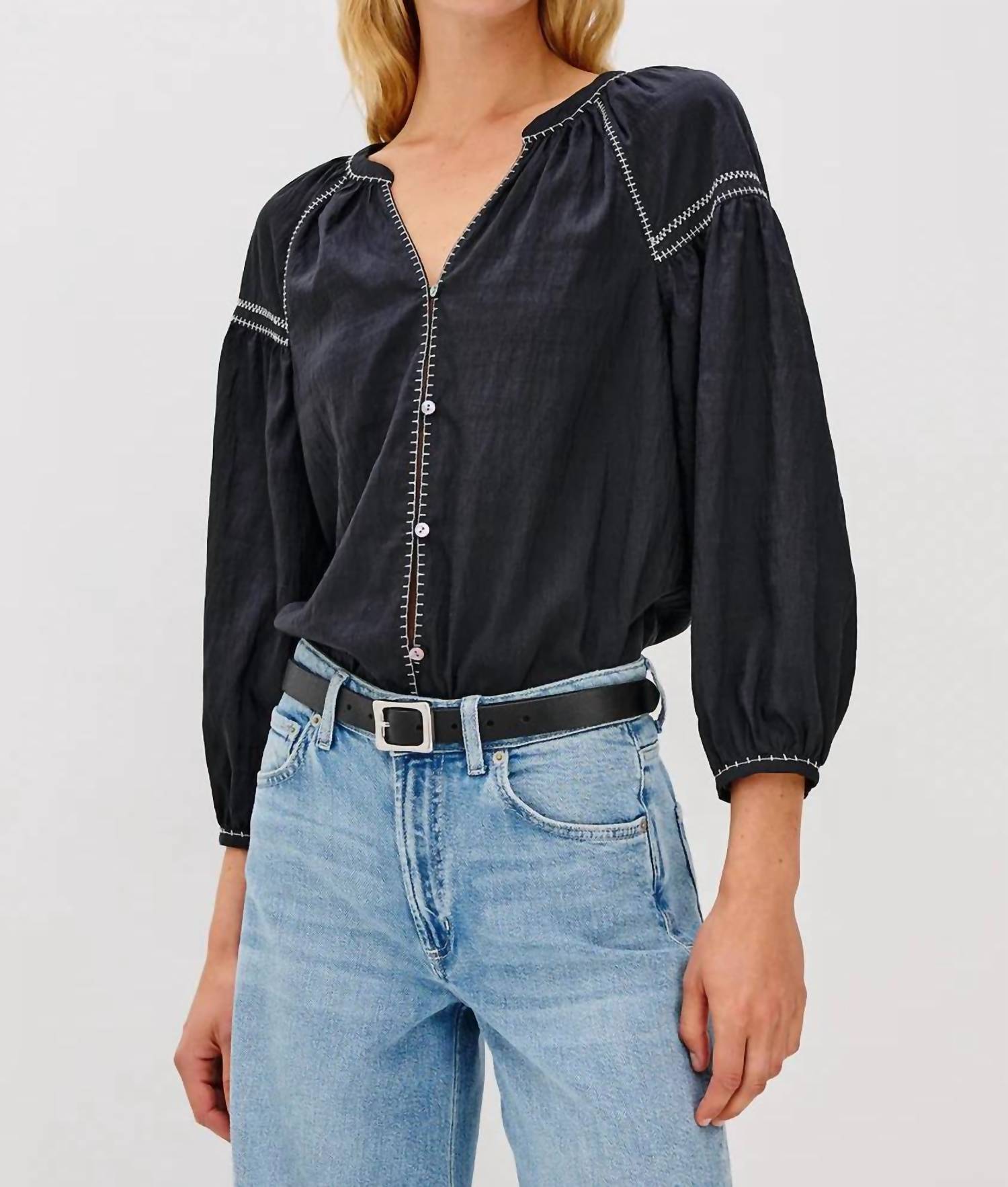 Pair this with your favorite jeans and slides for your next girls night out. Discover the Vasia Raglan Sleeve Top by Rails, an understated yet chic addition to any wardrobe. This black blouse is made from a crisp, crinkled cotton poplin blend featuring three-quarter raglan sleeves and seaming details for a relaxed fit. Composition: 86% Lyocell, 14% Nylon. Closure: Button closure. Care: Hand wash cold, line dry in the shade, cool iron or dry clean if needed. With a front body length of 24.5", this top is perfectly tailored for effortless style.