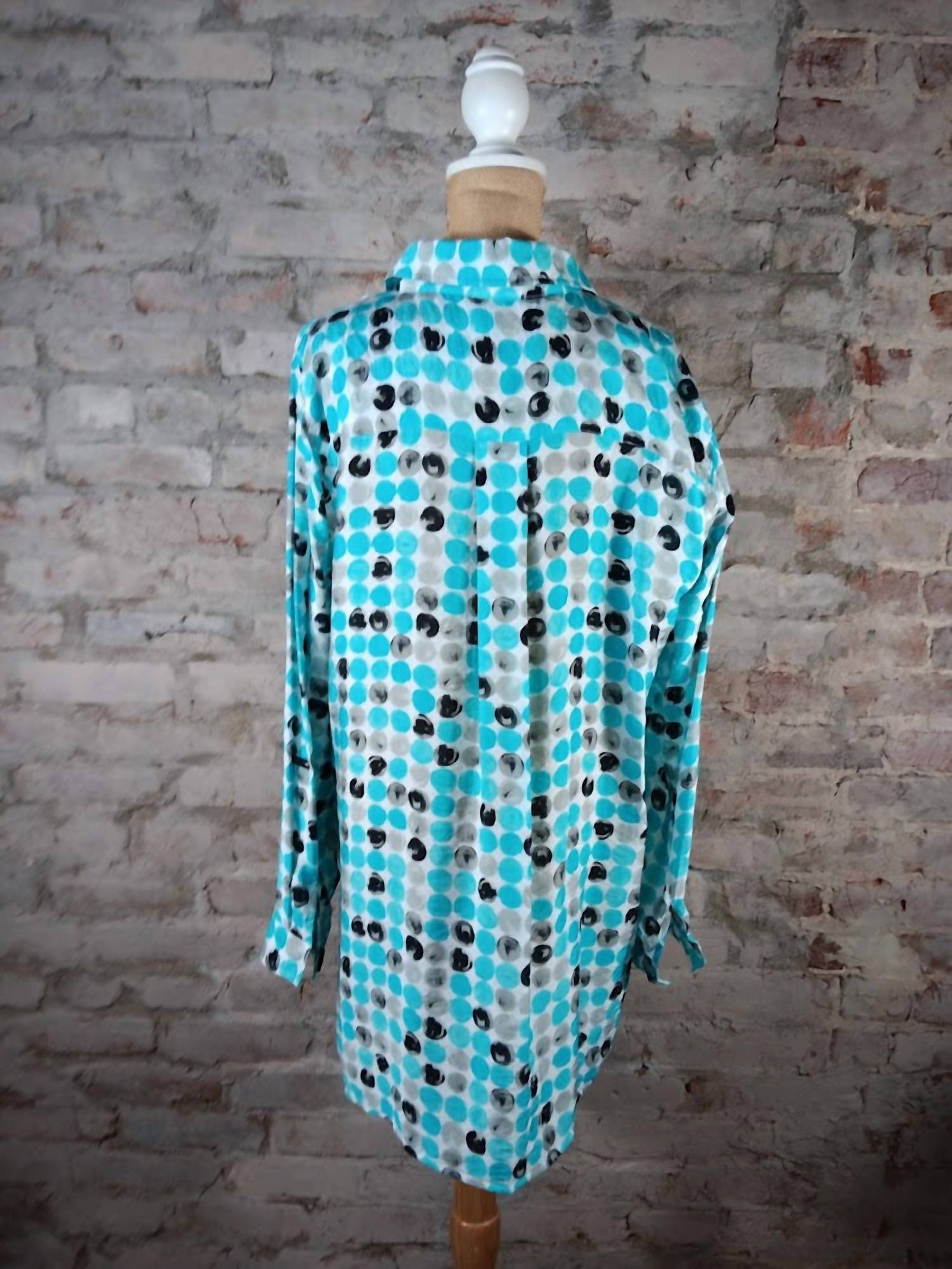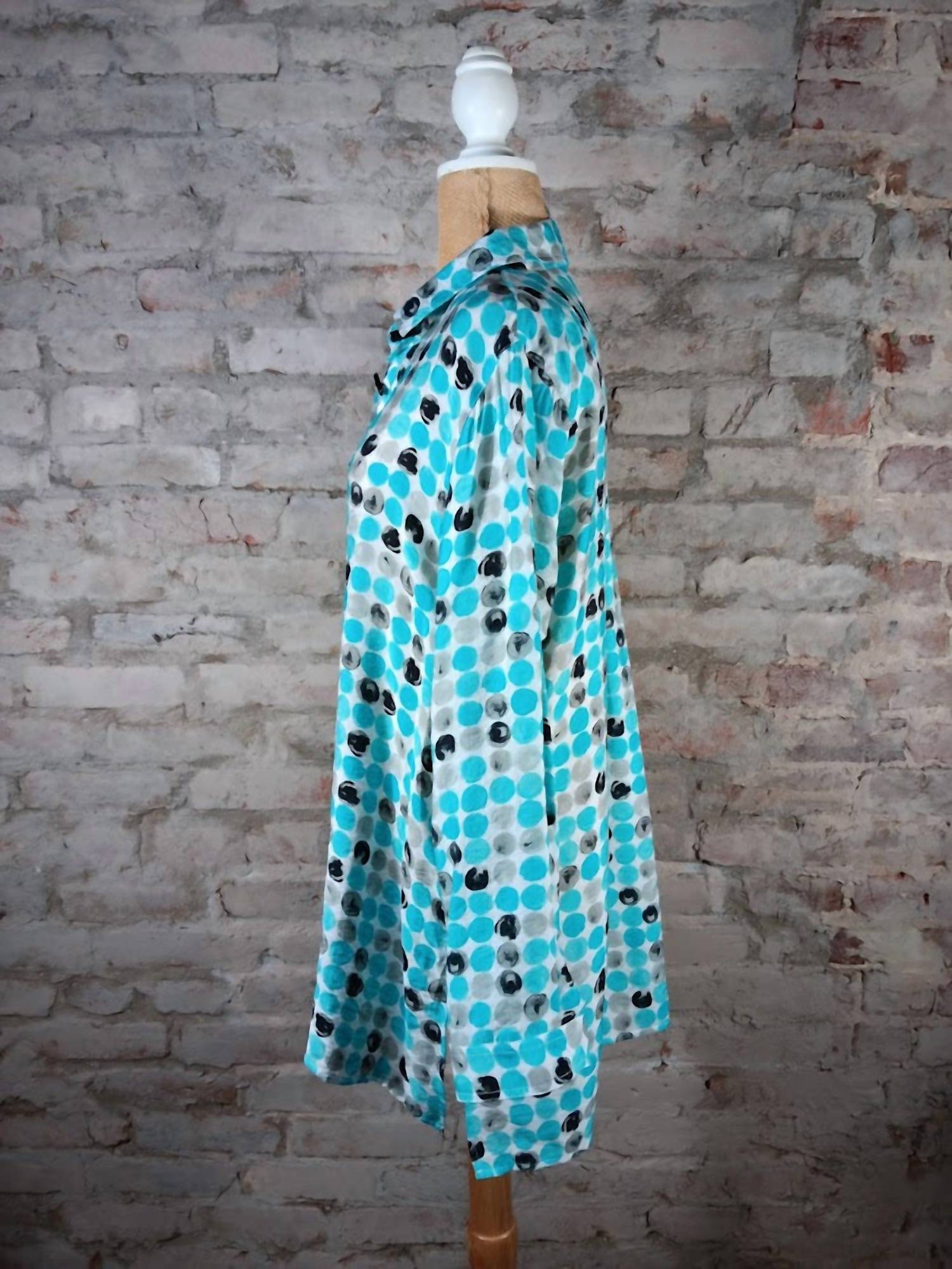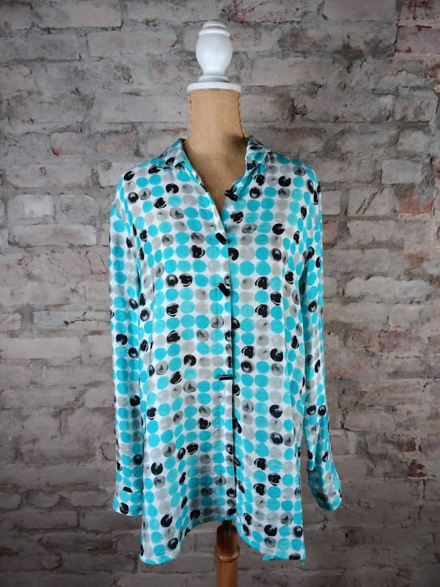 The perfect long sleeve tee that goes with just about anything. Embrace playful style with the Women's Dotted Hi-lo Top by Multiples, a vibrant addition to your spring wardrobe. Crafted with a fun polka dot pattern in eye-catching turquoise, this top features long sleeves and a boho chic flair for vacation-ready outfits. Designed with a fashionable hi-lo hem and a classic collar, it closes with convenient buttons for easy wear. Perfect for adding a pop of color and personality to any look.