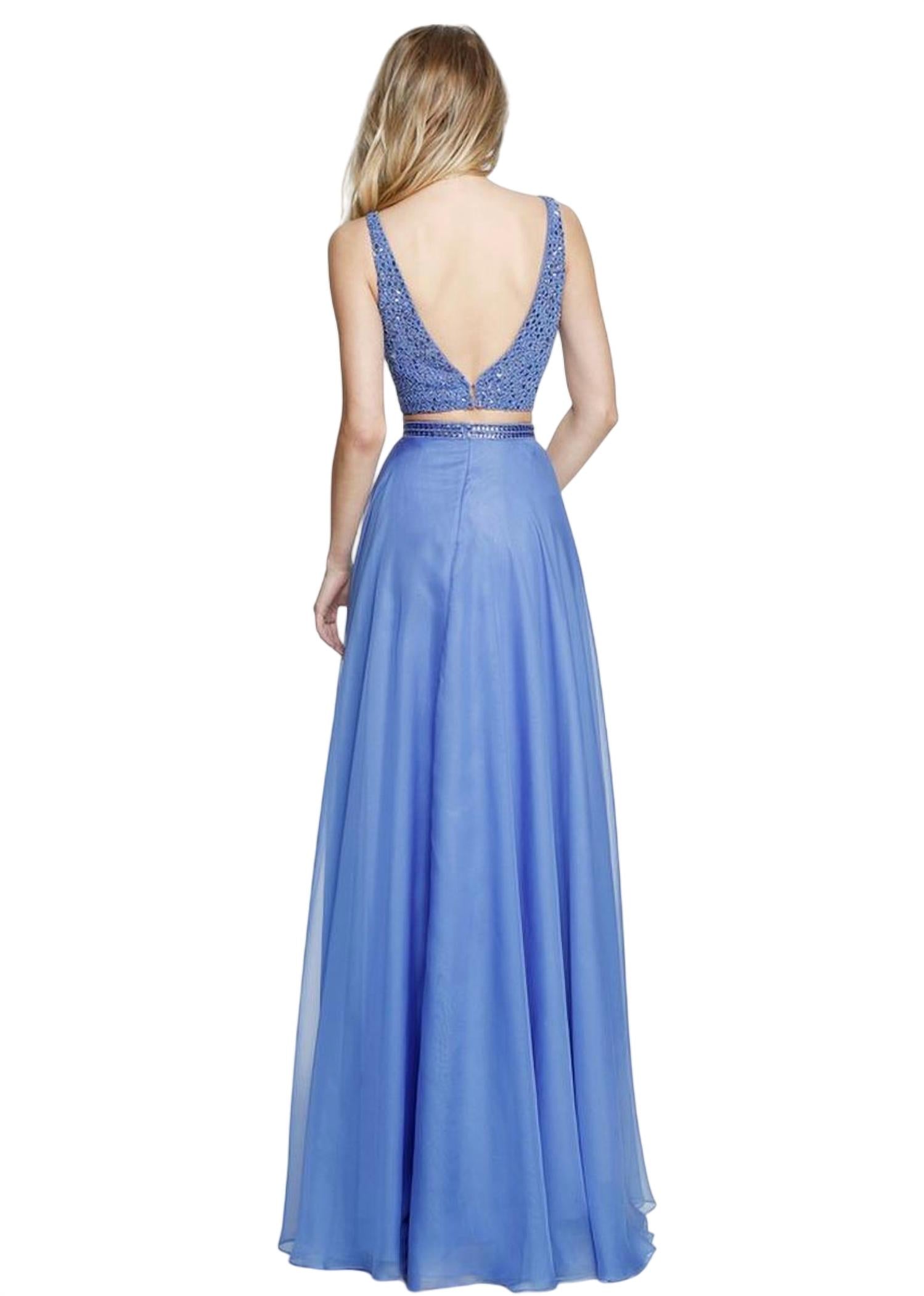 Features a two piece set. Cropped bodice. Sleeveless. Beadwork. Plunging V-neck. Sheer mesh paneling. Full-length skirt. High-waist. Beaded detail on the waistband.