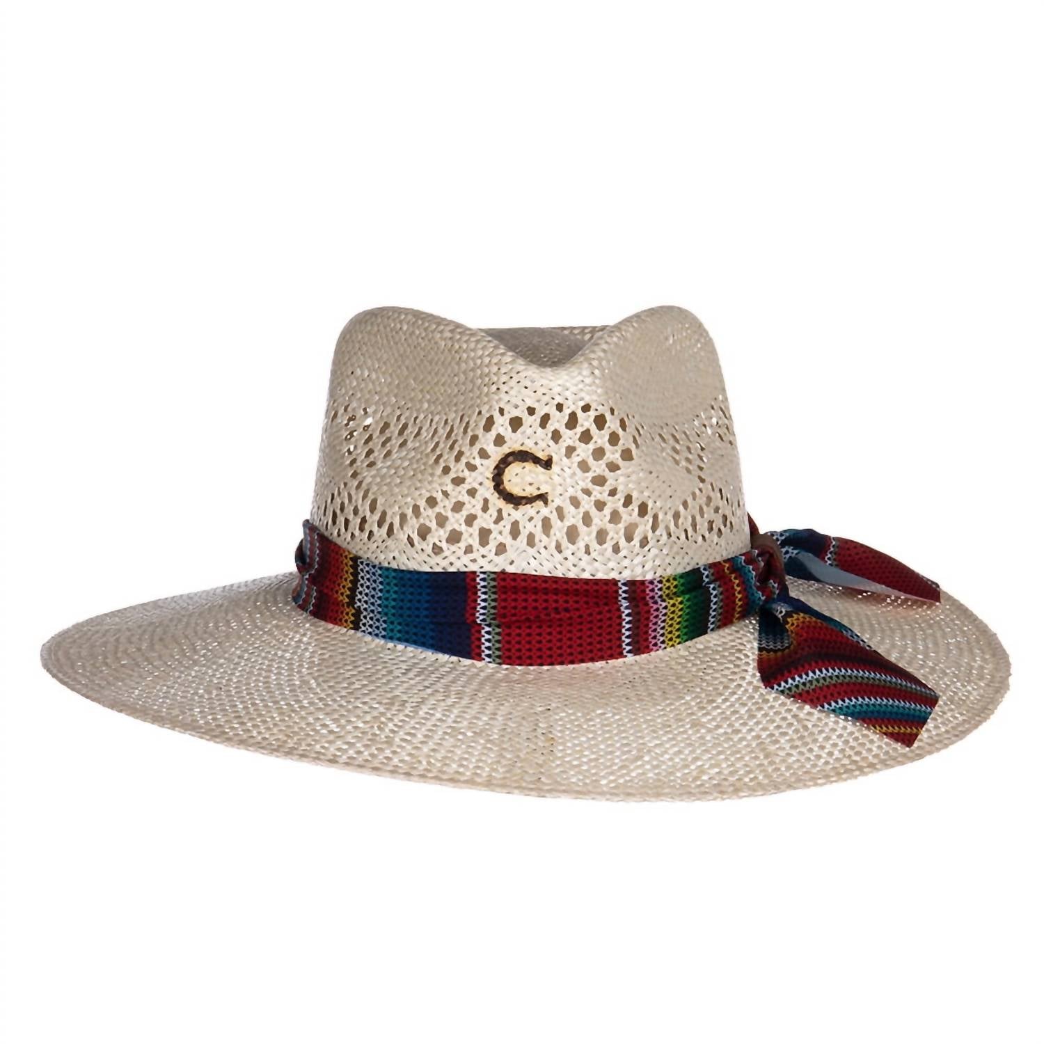 Not only will this hat get you tons of compliments, but it will also keep the sun out of your face which is a must! Wear it with any outfit for the perfect finishing touch. The Women's Charlie 1 Horse Fiesta Straw Fashion Hat by Resistol is a celebration of style and craftsmanship. Made from high-quality sisal straw, this hat features a 4" crown and a 3 3/4" brim, perfectly incorporating a serape printed ribbon outside band for a vibrant touch. Designed with venting details around the crown, it ensures comfort and breathability, complemented by a pinch crease front for a classic silhouette. Elevate your accessory collection with this hat that promises a chic and colorful addition to any outfit.