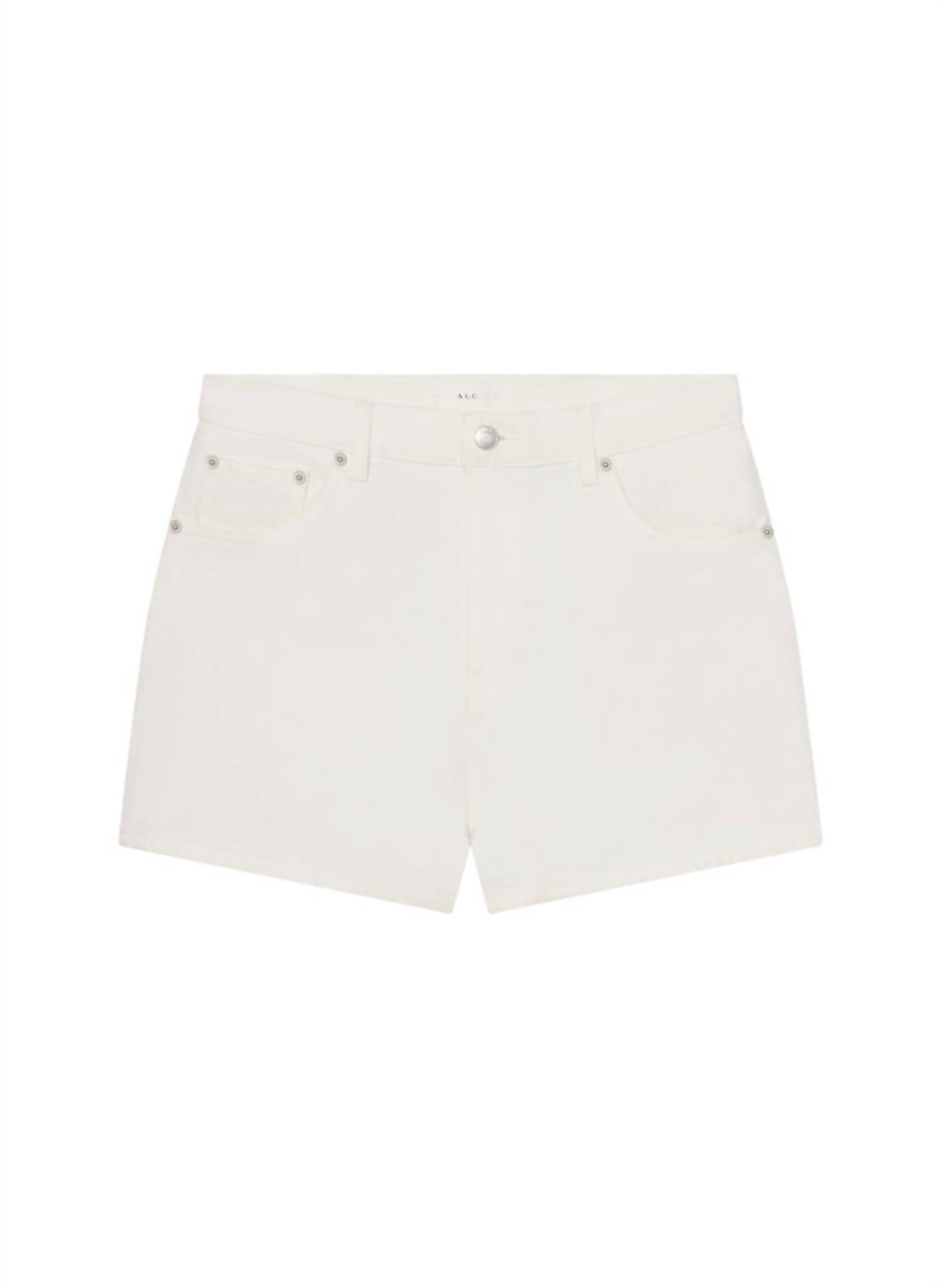 Tuck your favorite tee into these high-waist shorts for a more casual-cool feel. Introducing the 110 High Waist Denim Short by A.L.C., a summer staple for laid-back styling. Designed in a solid white hue, this short is crafted from 100% cotton denim with a high-rise fit and button closure. Featuring a slightly longer inseam with a relaxed fit through the hip and thigh, it offers classic five-pocket construction for practicality. Proudly hand-processed in Los Angeles, this minimalist piece is perfect for vacation wear.