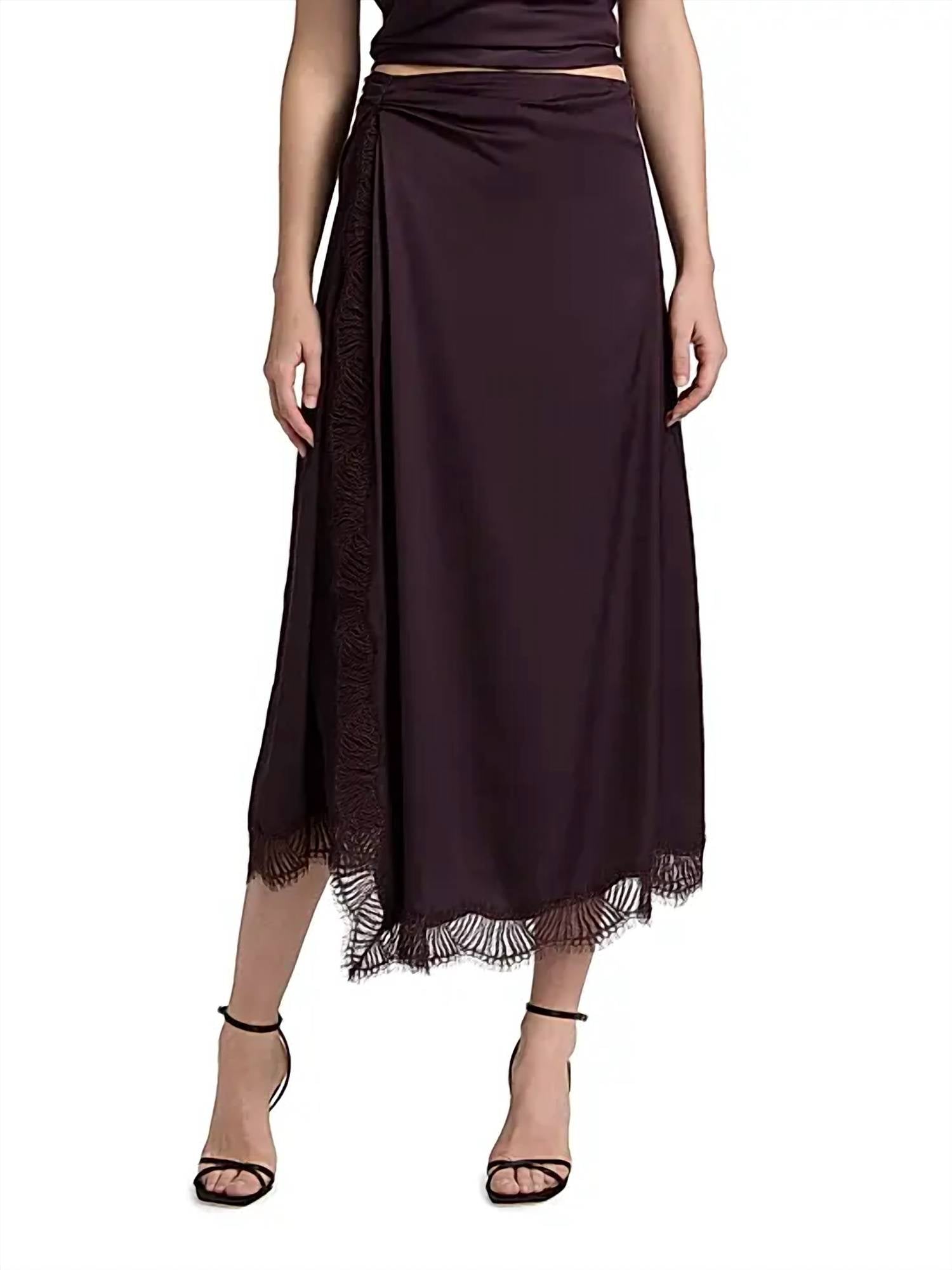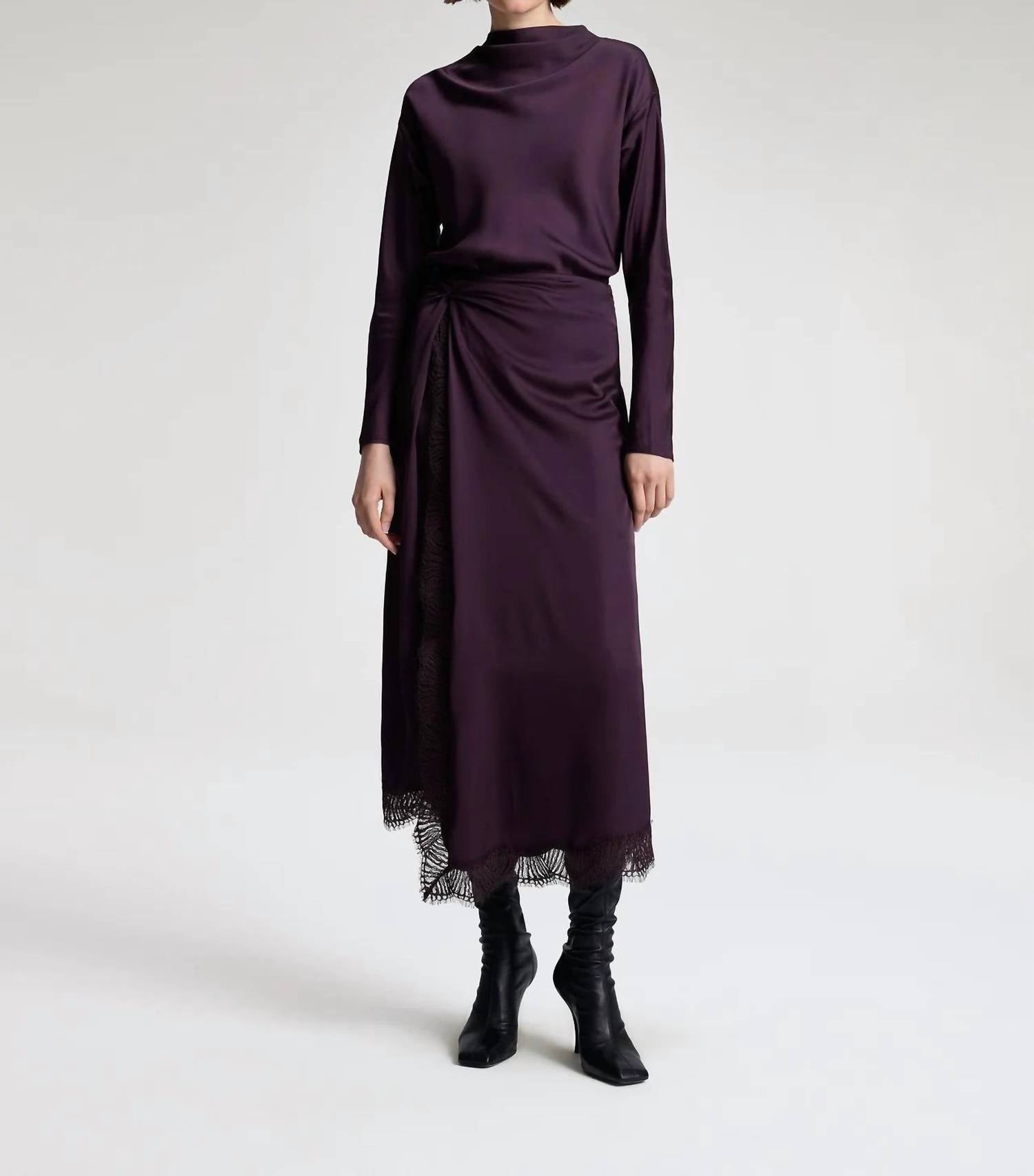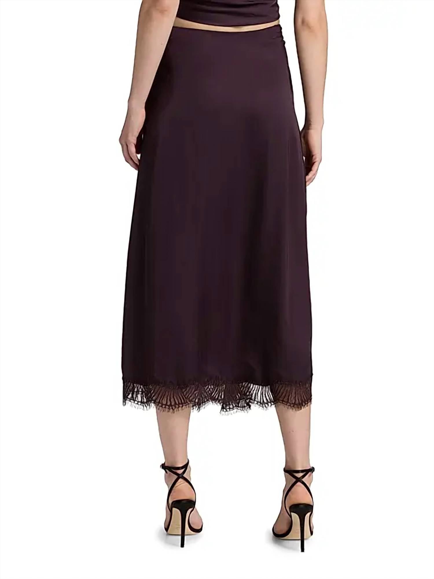 Tuck your favorite tee into this midi length skirt for an effortlessly cool look. The A.L.C. Bella Skirt in Deep Plum offers a strikingly elegant design perfect for an evening event. This women's midi skirt is made predominantly from 100% Viscose with a contrast of 100% Polyester, and it features an eye-catching asymmetrical shape with ruching at the hip. The zip closure ensures a seamless fit, and the dramatic fishtail hem imparts a sophisticated touch. For best results, dry clean only.