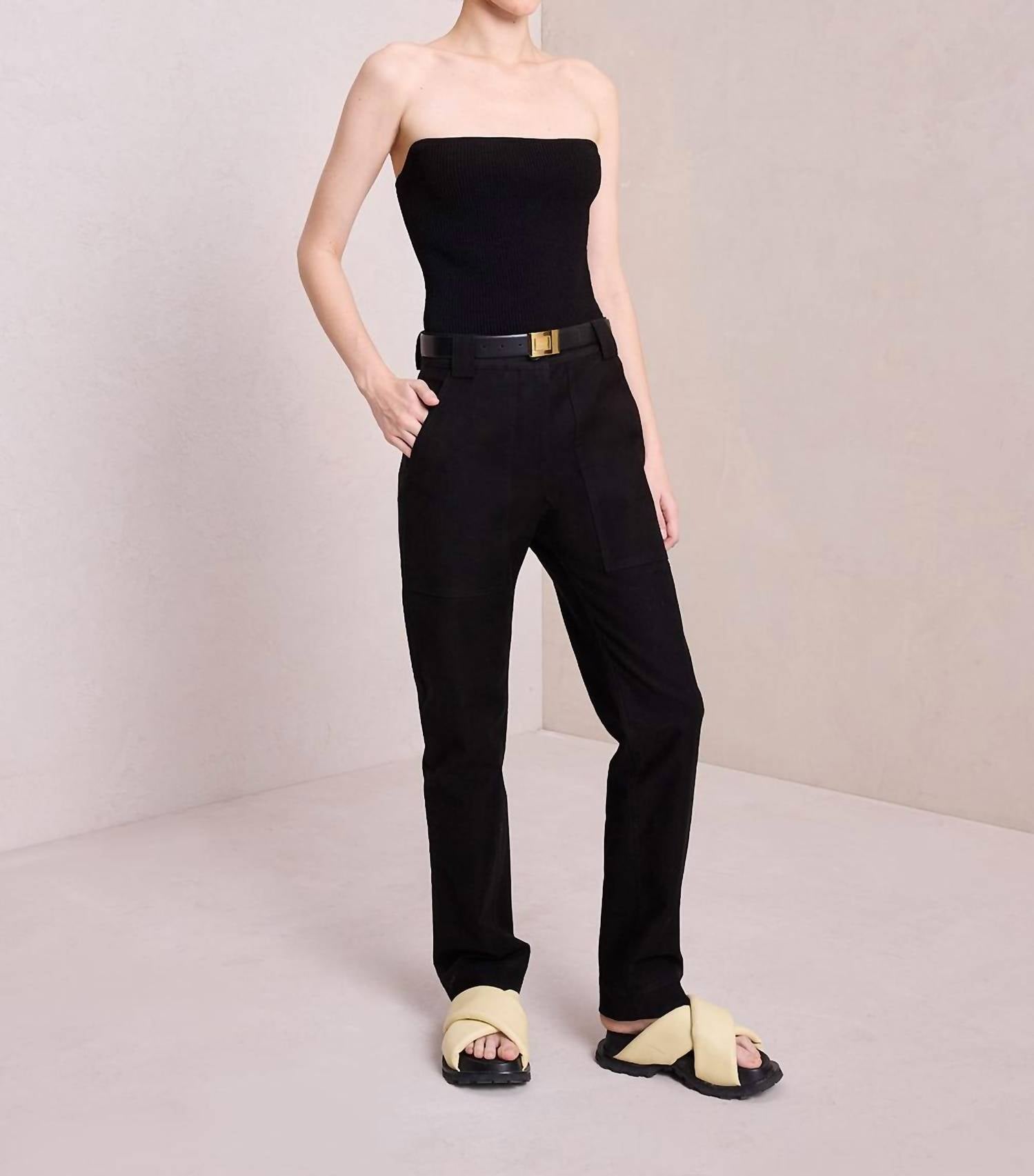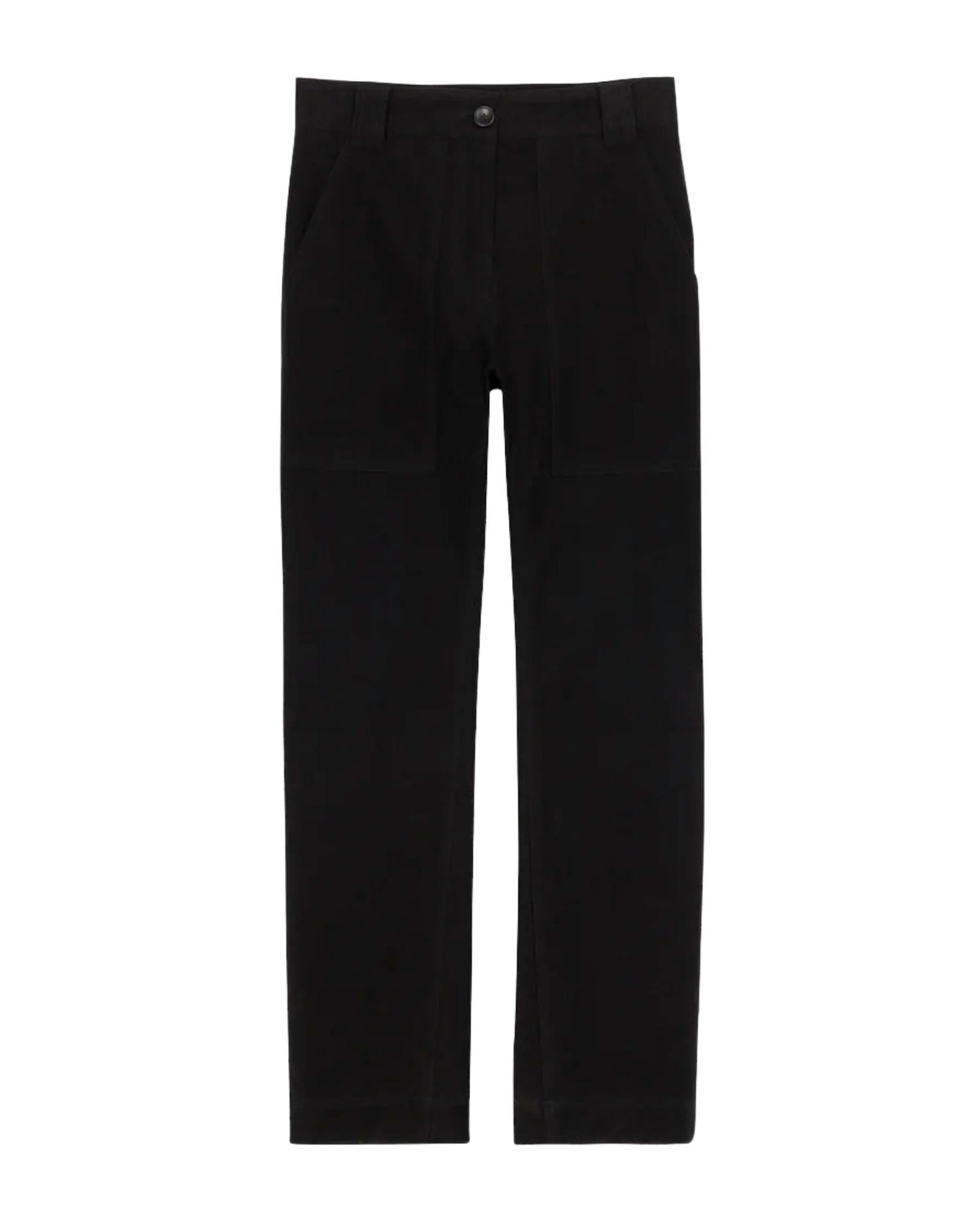 A perfectly tailored straight leg that you'll want in every color! The Halston Pant is crafted from a compact stretch cotton blend fabric in essential black. This mid-rise utility-inspired silhouette features a slim, flat-front leg with functional hip pockets for a modern yet feminine take on workwear-inspired dressing. 95% Cotton, 5% Spandex. Dry clean only