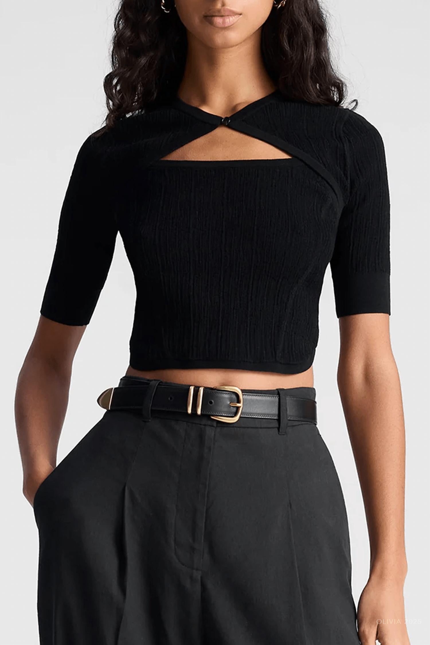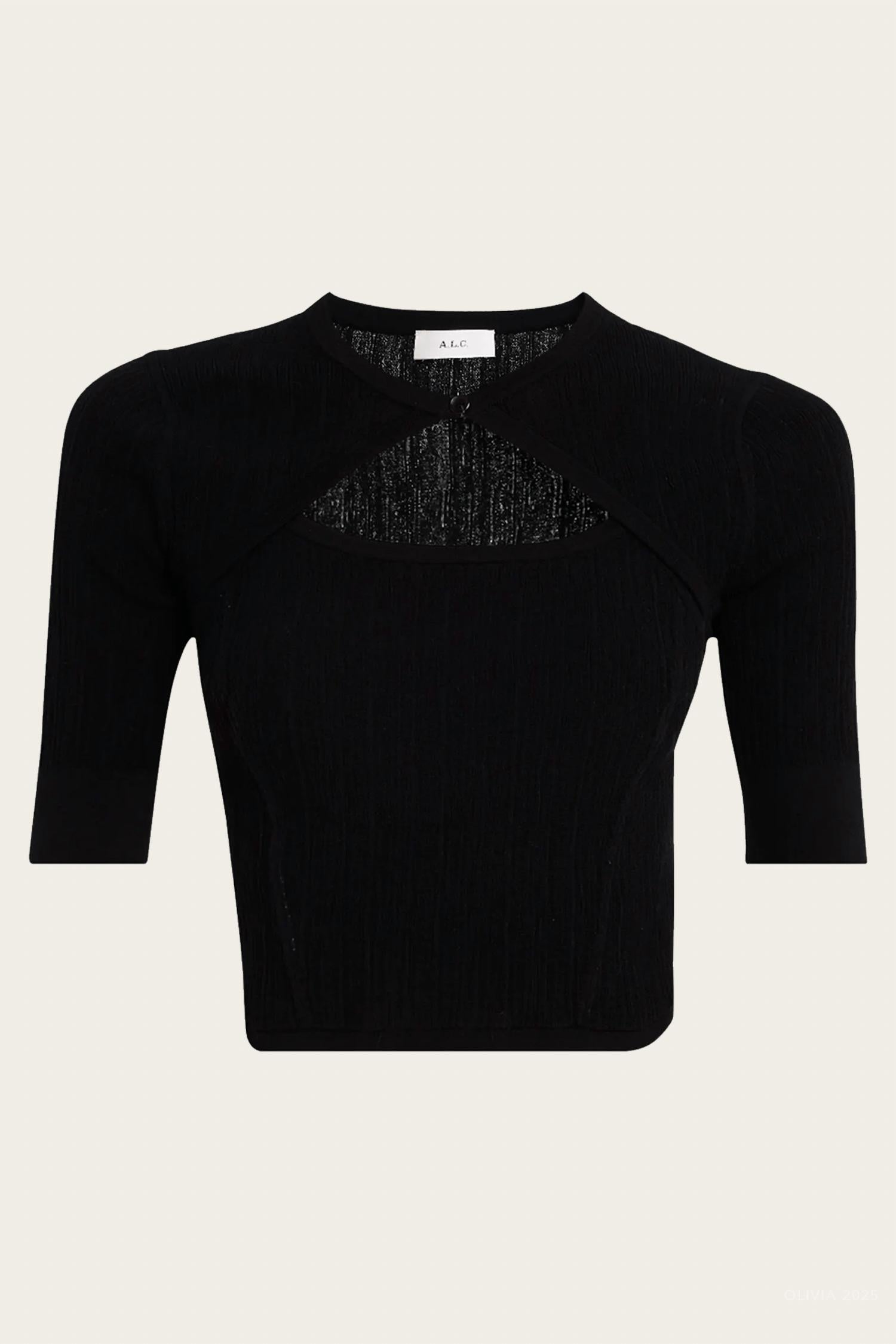 Look no further, you just found your perfect tee! The Loma Fine Cotton Knit Top by A.L.C. is a chic, versatile addition to your wardrobe. This women's short sleeve top, crafted from a breathable cotton blend (78% Cotton, 22% Nylon), offers a sleek silhouette in classic black. With a cropped length of 19 inches, it features a single button closure and back ties for optional styling. Made for minimalist style, this top is ideal for a vacation-ready look and requires dry cleaning.