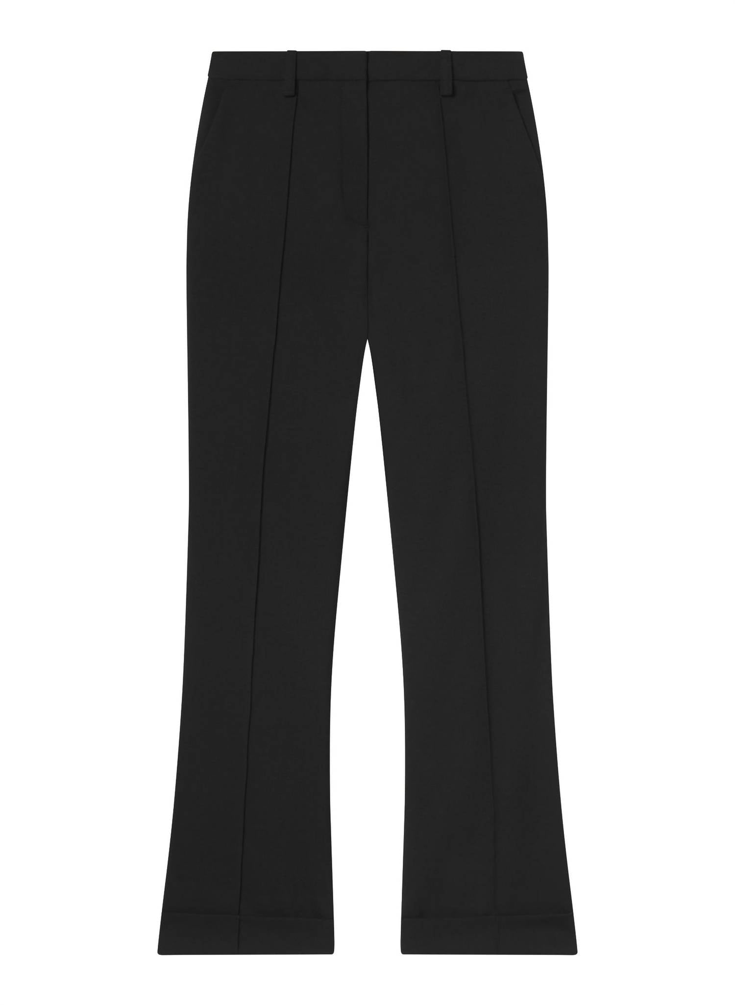 Elevate your workwear wardrobe with the Max Tailored Pants by A.L.C., offering a sophisticated slim fit and flared leg design in timeless black. Crafted from 70% Triacetate and 30% Polyester, these trousers feature a high-rise waist, a 32.375" inseam, and a convenient zip closure. Designed with a floor-length cuffed hem, they provide a subtle flare and a structured yet fluid drape. Care instructions are simple with a dry clean recommendation, perfectly complementing their elegant style. Model is 5'9.5" and wearing a size 2, with measurements of 30.5" bust, 23" waist, and 34" hips.