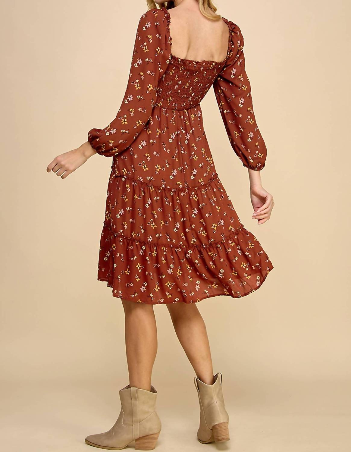 The kind of easy and flattering dress you'll be reaching for all season long. Introducing the Tiered Floral Dress by A.U.W., a quintessential boho chic piece in a warm rust hue. Designed with long sleeves and crafted from 100% polyester, this mini dress showcases a patterned tiered silhouette and smocked bodice for a flattering fit. Simply pull on for effortless style, whether you're heading to a spring getaway or celebrating Valentine's Day. Care is a breeze with hand wash instructions provided, making it a perfect addition to any free-spirited wardrobe.