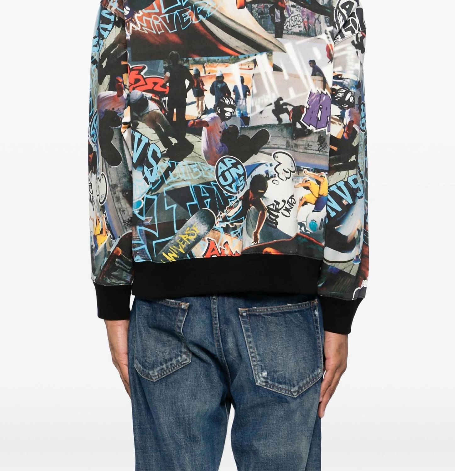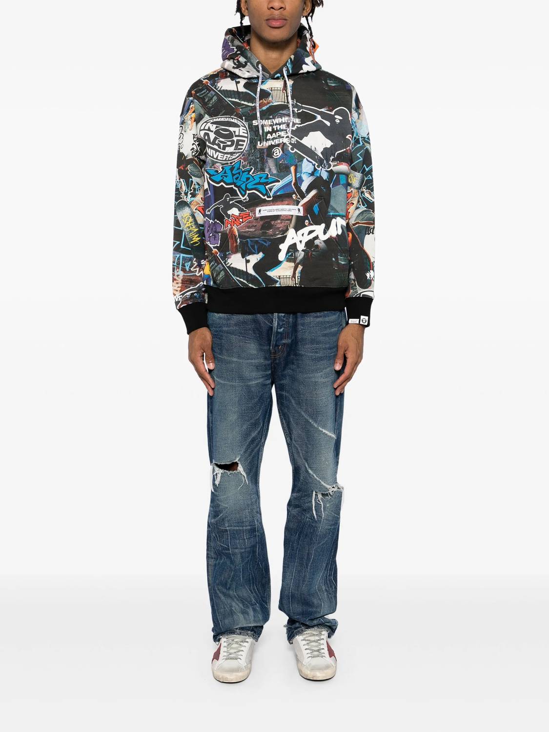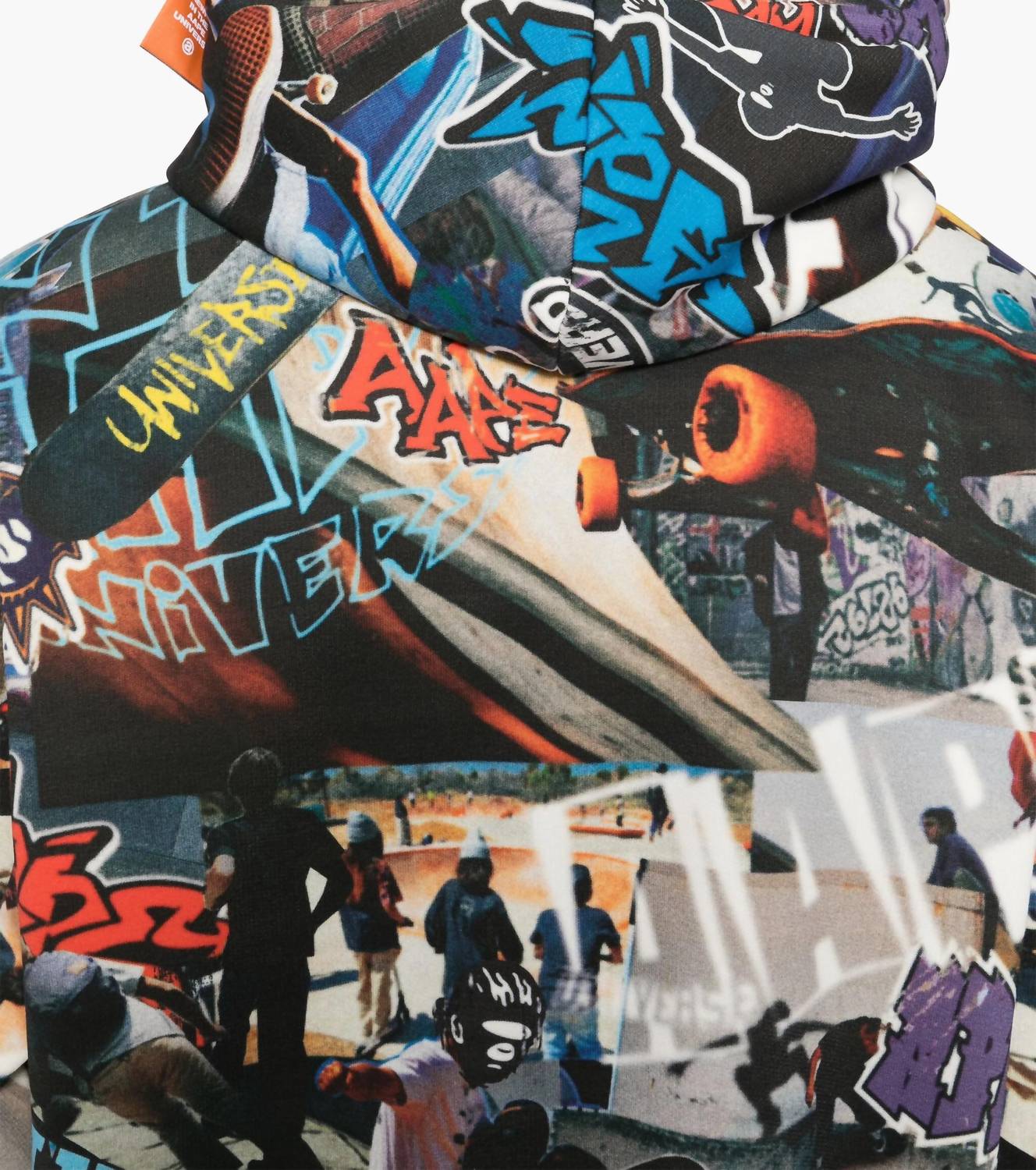 Discover urban style with the Moonface Logo Graffiti Print Hoodie by Aape, featuring long sleeves and a cotton blend composition for comfort. This hoodie boasts a slouchy drawstring hood and an all-over graphic print, completed with a logo patch at the front. It includes a front pouch pocket and ribbed cuffs and hem, with a cozy fleece lining. Designed as a pull-on closure piece, it’s perfect for fall and thrives in travel settings with its streetwear appeal. Care: Hand wash. Body: Cotton 74%, Polyester 26%.