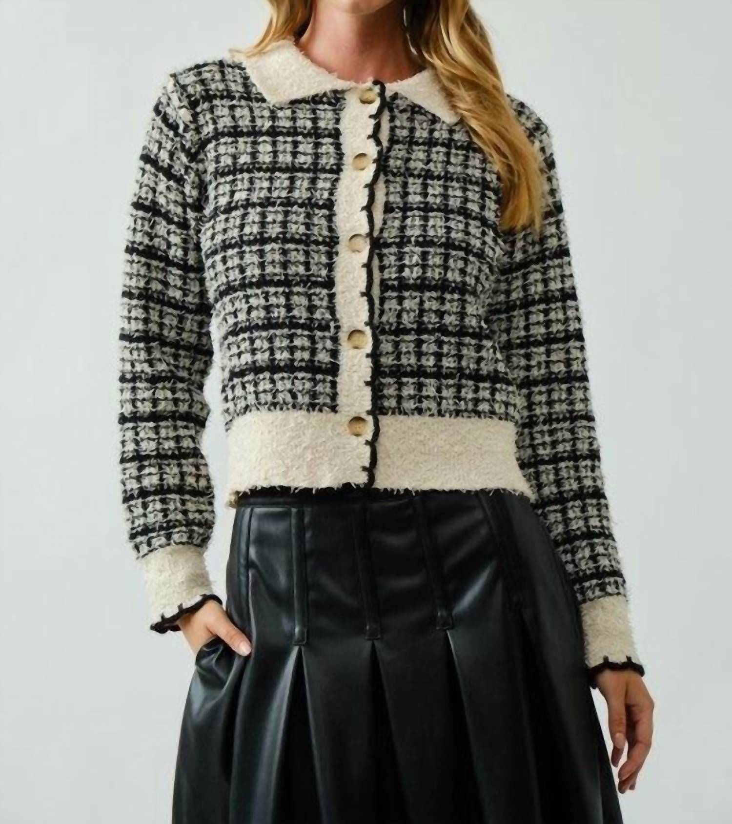 Throw this adorable cardigan over any cami or tank top. Elevate your wardrobe with this timeless tweed cardigan, designed in a classic button-down silhouette for enduring sophistication. Delicate scalloped edges lend a subtle feminine finish, while the textured weave adds depth and refinement. Crafted from 100% polyester, it offers structure with lightweight comfort—an effortlessly polished layer for both day and evening styling.