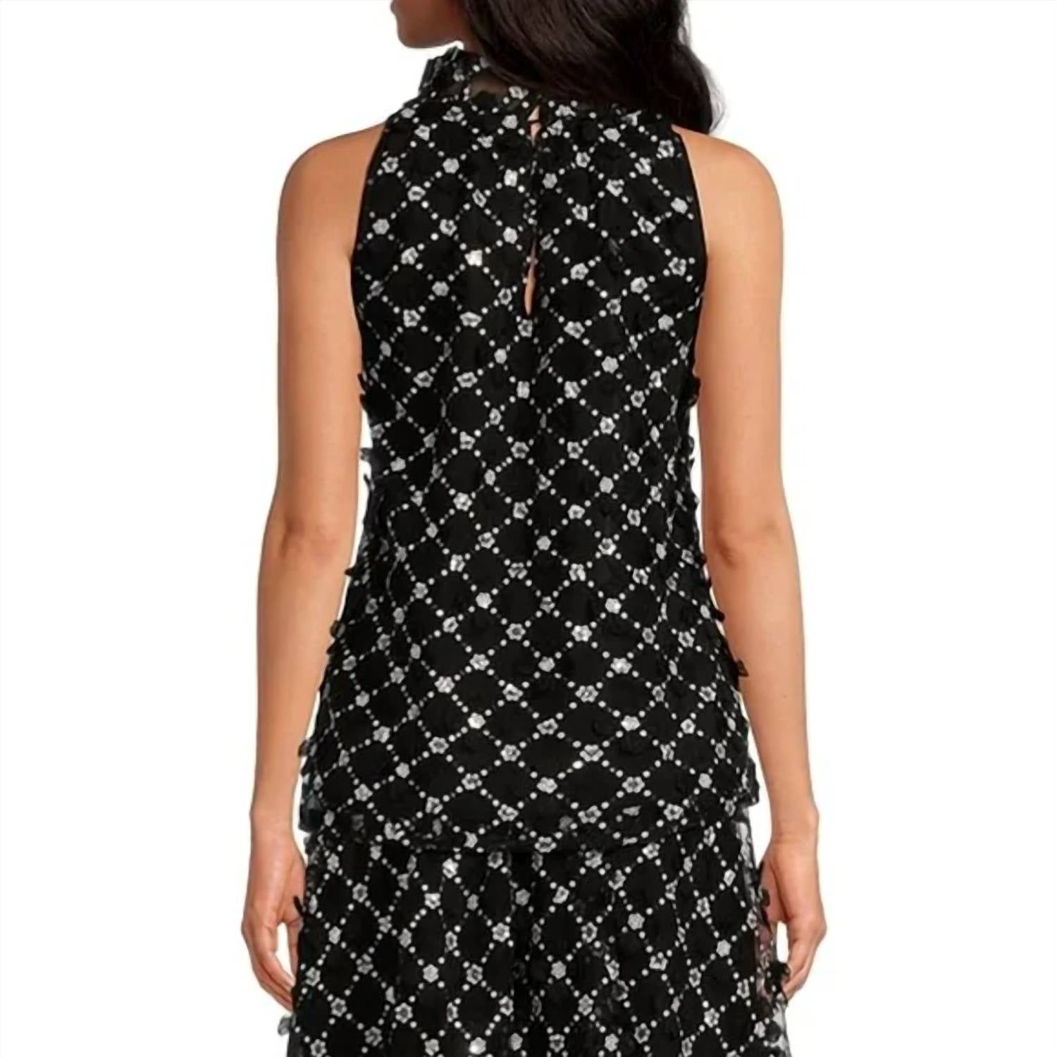 The perfect tank top for those warmer weather seasons. From Abbey Glass, this top features: Mock ruffle neckline Sleeveless Sequin lattice lace details 1 button back with keyhole Pullover construction Approx. 23.5" in length Polyester Dry clean Imported