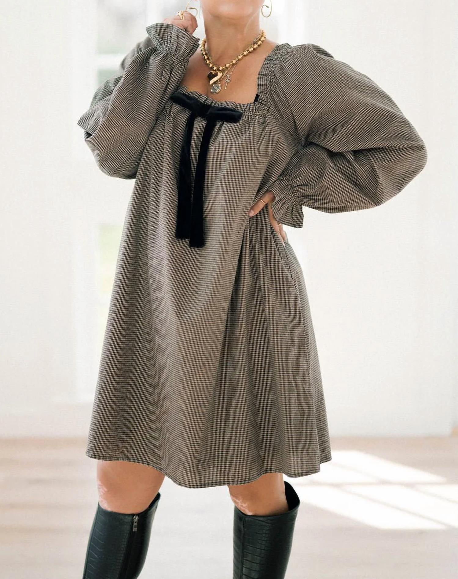 A short and breezy dress for those warmer days. Discover the Tiny Plaid Dress by ABLE, a chic choice for your fall holiday parties. This brown plaid mini dress features long sleeves and a sophisticated shift silhouette, adorned with a stylish black bow and ruffles around the squareneck collar. Closure: Pull-on design. Perfect for embracing this season's Western trend.
