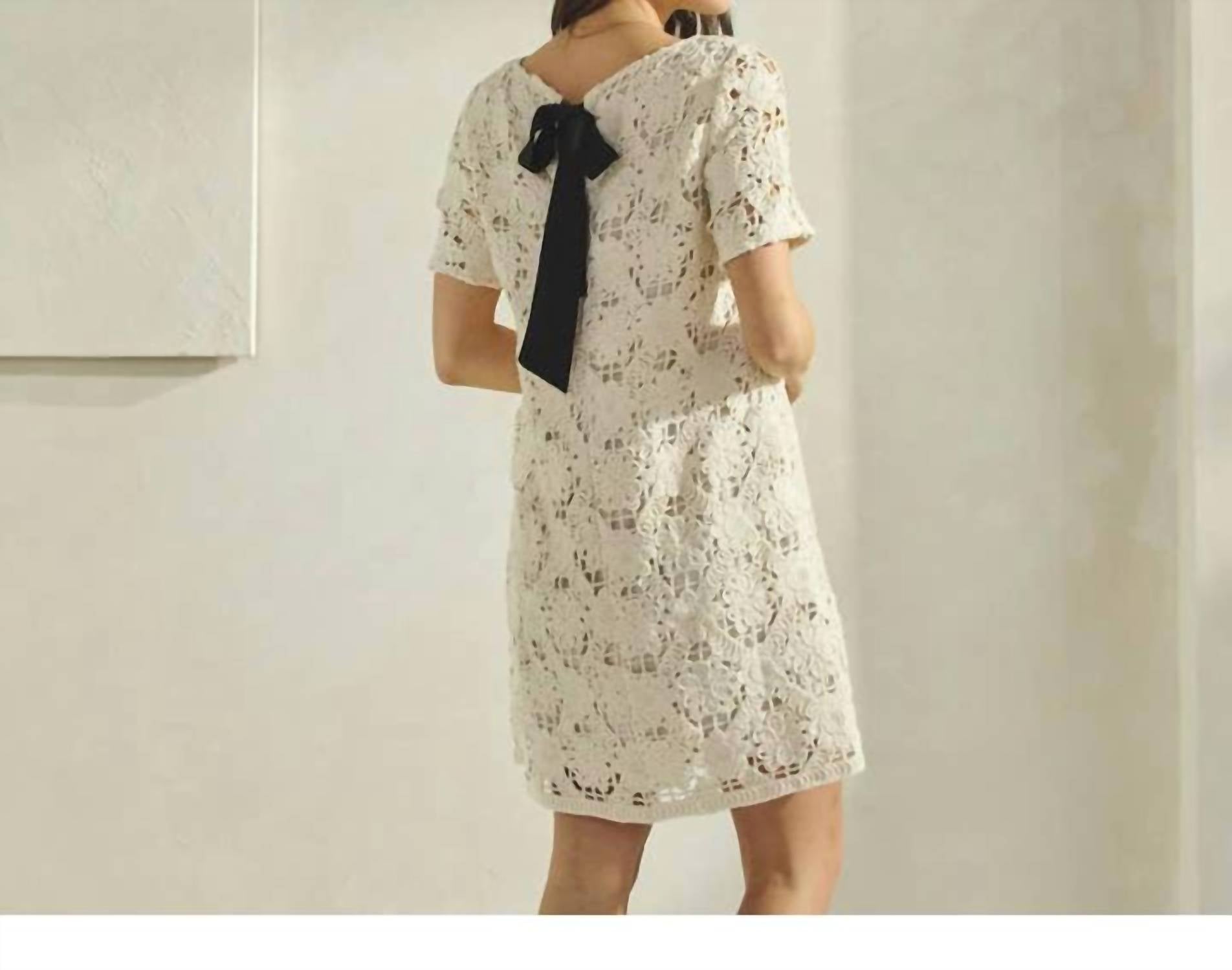 A short and breezy dress for those warmer days. Introducing the Women's Floral Lace Mini Dress by ABLE, a charming piece that captures vintage elegance in crisp white. This mini dress features short sleeves and a softly fitted sheath silhouette, perfect for warm spring gatherings and holiday parties. Made with a delicate cotton blend comprising 98% cotton and 2% polyester, the textured floral lace adds a timeless touch. Designed with a contrasting bow detail at the back and a classic crewneck, it offers a pull-on closure for ease. Care for this piece by hand washing and line drying, with low iron if needed, to maintain its graceful allure.
