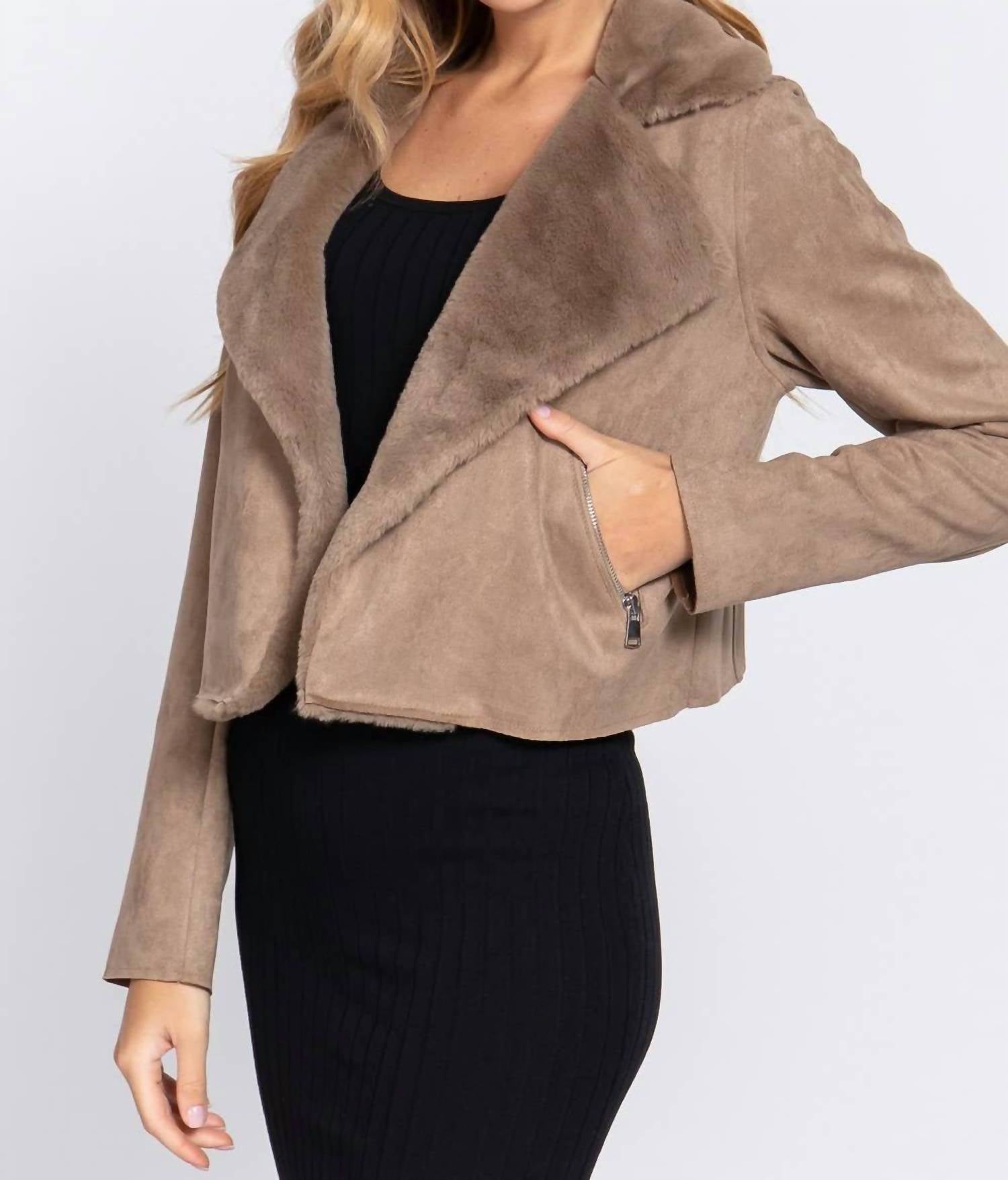 A casual yet cool jacket that every closset needs. Introducing the Women's Lapel Collar Fur Detail Faux Suede Biker Jacket by Active Basic, a chic taupe piece perfect for fall fashion. With long sleeves and a V-neck adorned with charming fur trim, this textured jacket expertly combines style and functionality. Crafted from 95% polyester and 5% spandex, it features practical pockets and sleek silver zippers. Closure: Zip closure. Ideal for music festivals, this minimalist jacket is your new go-to for cozy, stylish outings.
