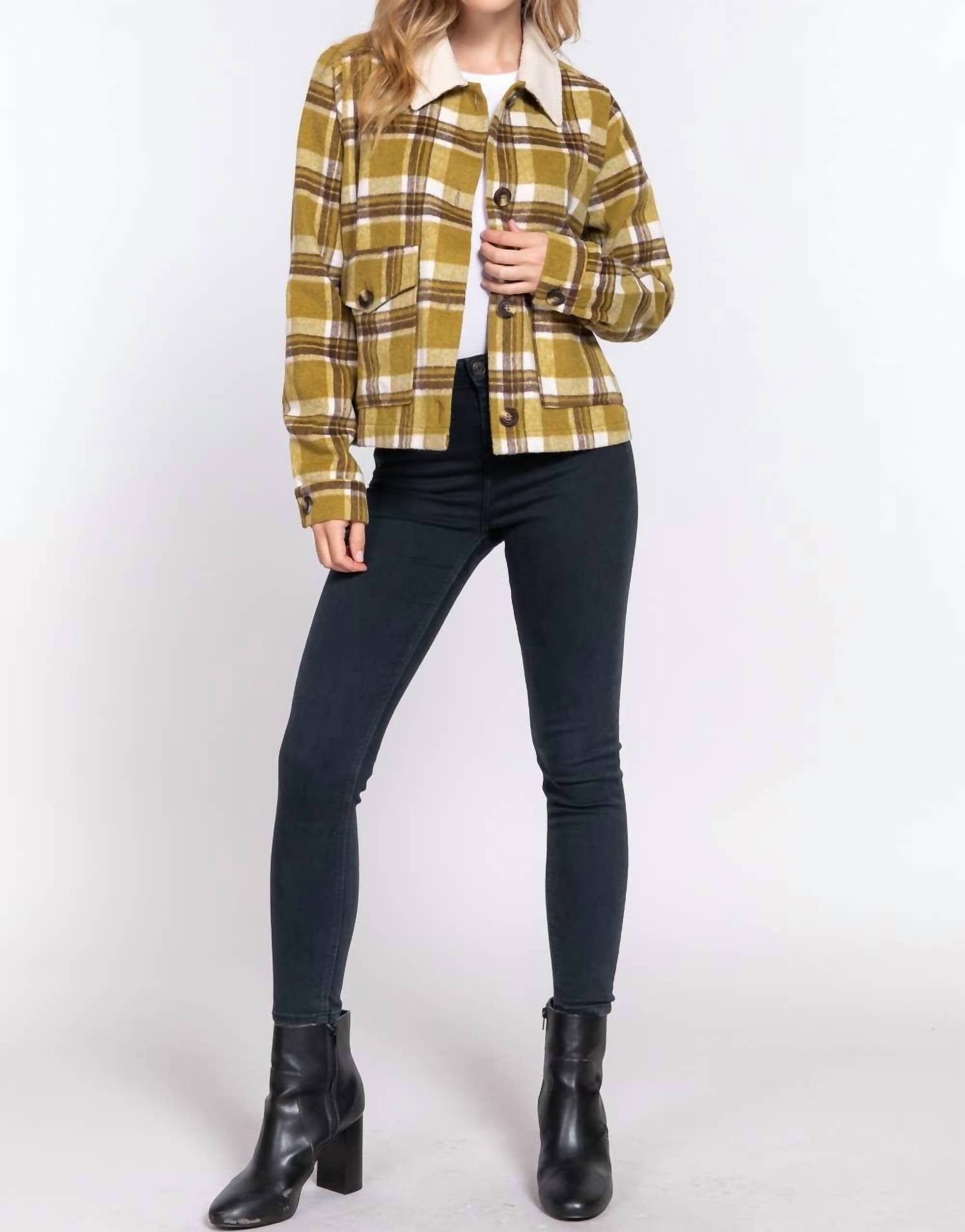 A classic button down shirt that will never go out of style. Embrace the season with the Active USA Faux Fur Collar Plaid Shacket in a sophisticated Olive/Brown. This women's outerwear features long sleeves and boasts a plush faux fur collar accentuated by a timeless plaid pattern, crafted from 95% polyester and 5% wool for that perfect blend of warmth and style. Designed with utility in mind, it includes practical pockets and secures with a button closure, making it as functional as it is fashionable. Effortlessly versatile for travel and transitional fall weather, this shacket seamlessly aligns with workwear trends and adds a touch of elegance to your Thanksgiving wardrobe.