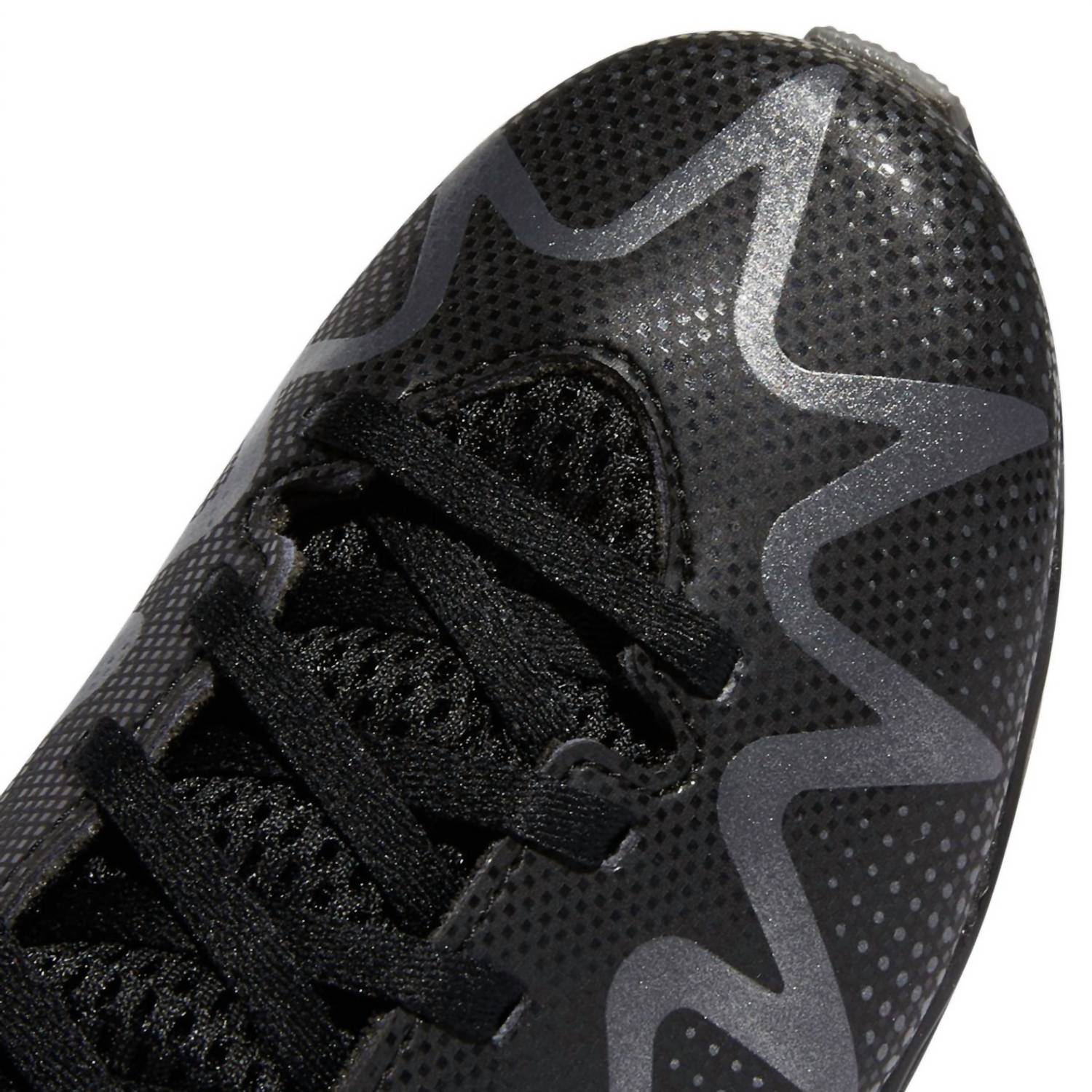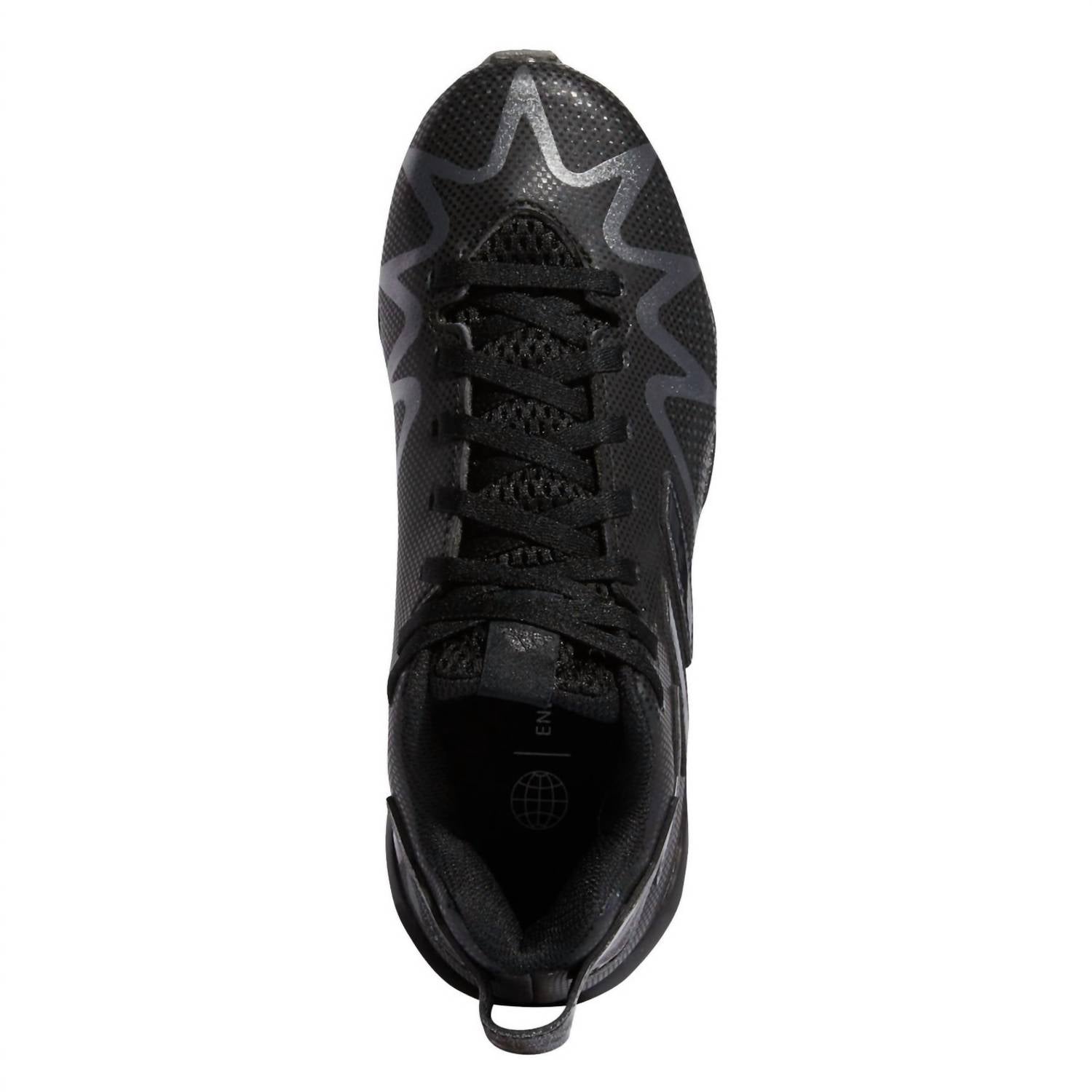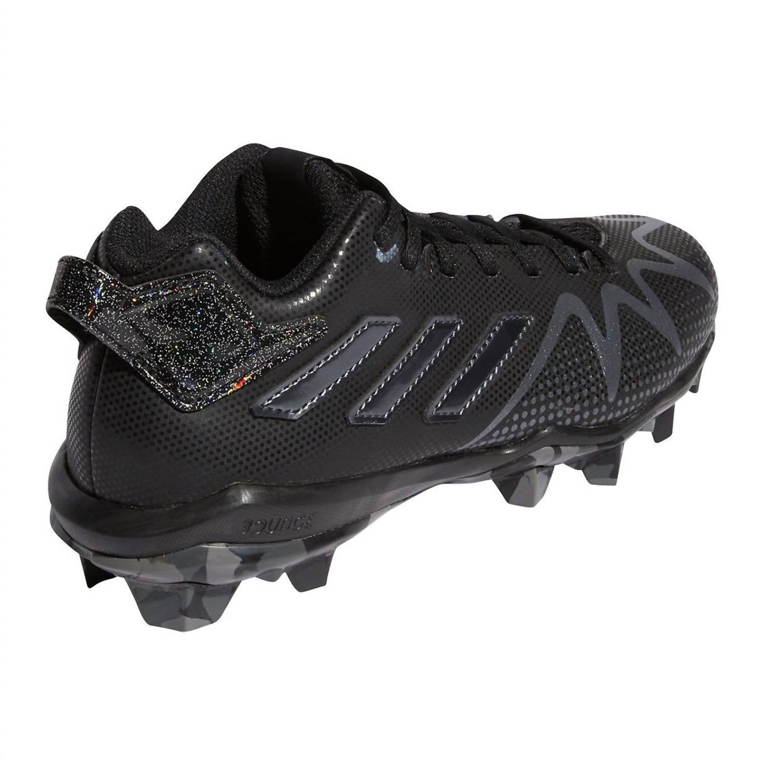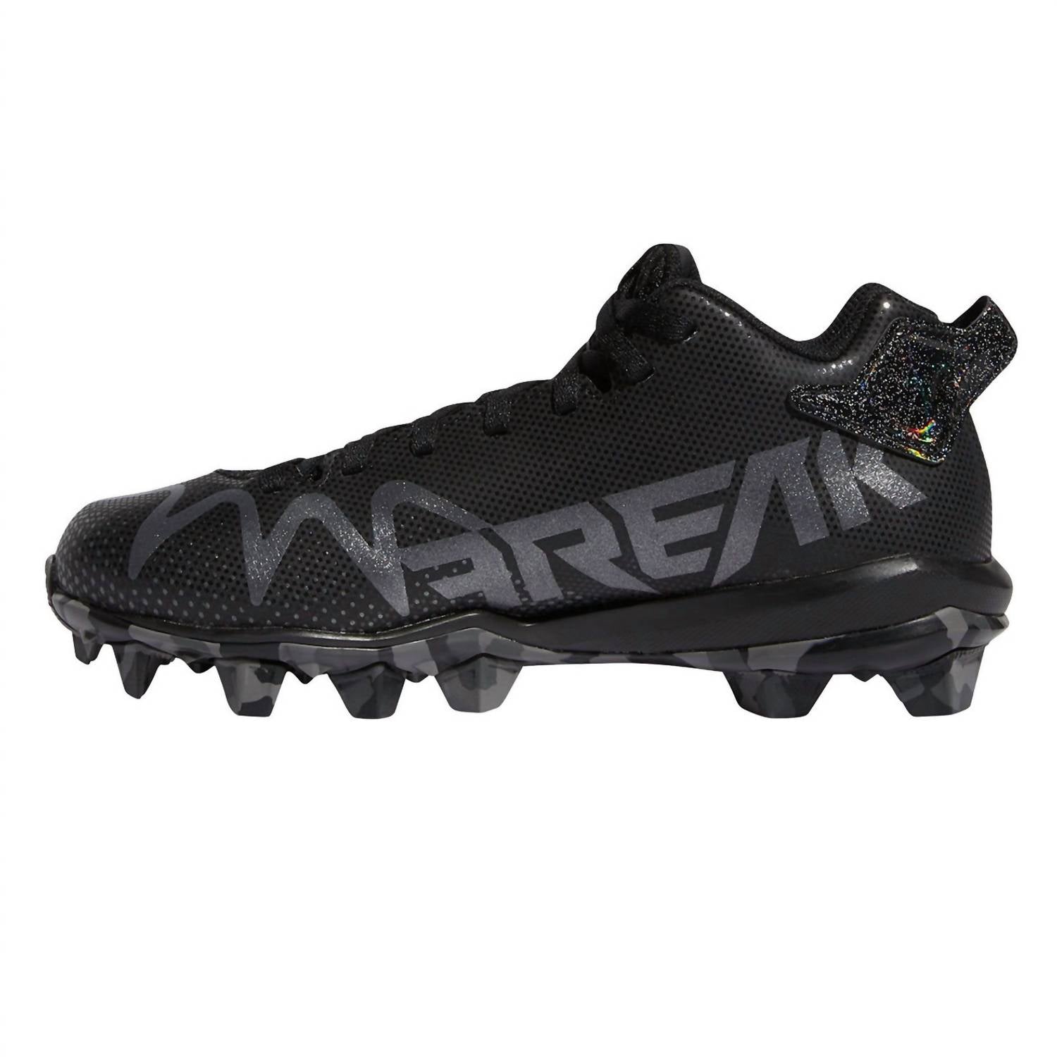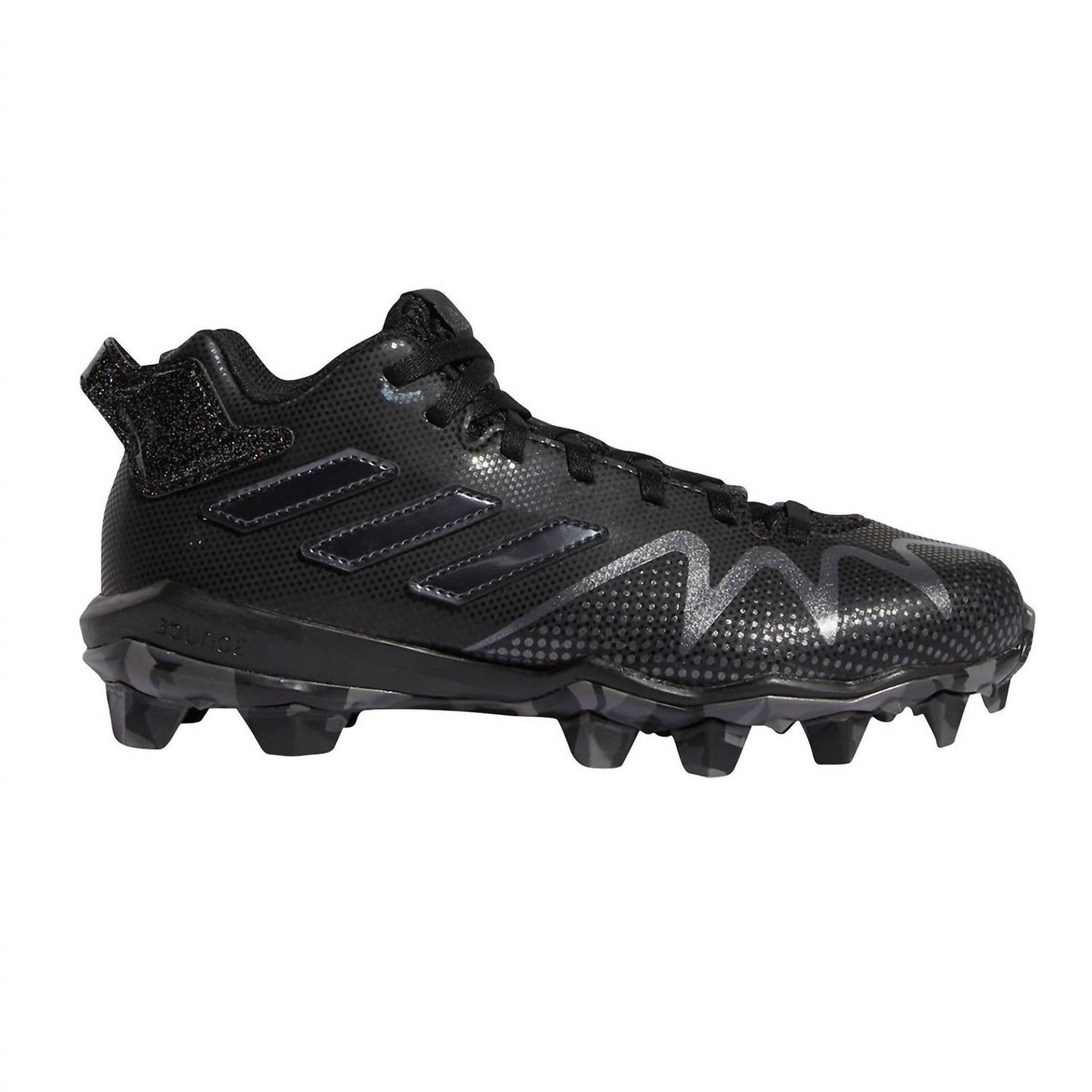 Equip your young athlete with the Kids Freak Spark Md J Football Shoe from adidas, designed for optimal performance. These black sneakers feature a snug synthetic upper with 25% of components crafted from at least 50% recycled content, ensuring both stability and environmental consciousness. The lace closure and heel and tongue tabs enable quick on-and-off, while the open mesh tongue provides strategic padding for comfort and breathability. A Bounce midsole and molded lugged rubber outsole offer reliable traction and support, perfect for energetic game day action.