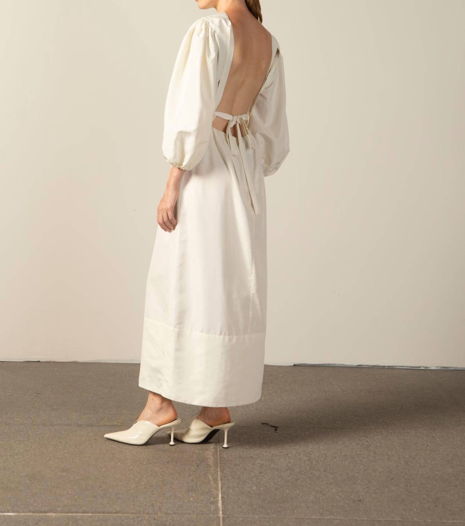 A midi dress so versatile, your options for wearing it are endless. Experience architectural elegance with the Geometric Puff Sleeved Maxi Dress by Adriana Degreas, an exquisite choice for your holiday party. This off-white dress features three-quarter sleeves and is crafted from solid polyester in an A-line silhouette. Cloaked in minimalist charm, it includes a tie closure, adding a touch of sophistication. Care instructions advise machine wash and tumble dry, ensuring effortless maintenance. Model is 5'11" and wearing a size small, with measurements: 32.3" bust, 23.6" waist, 36.2" hips. Perfect for those spring evenings where art meets fashion.
