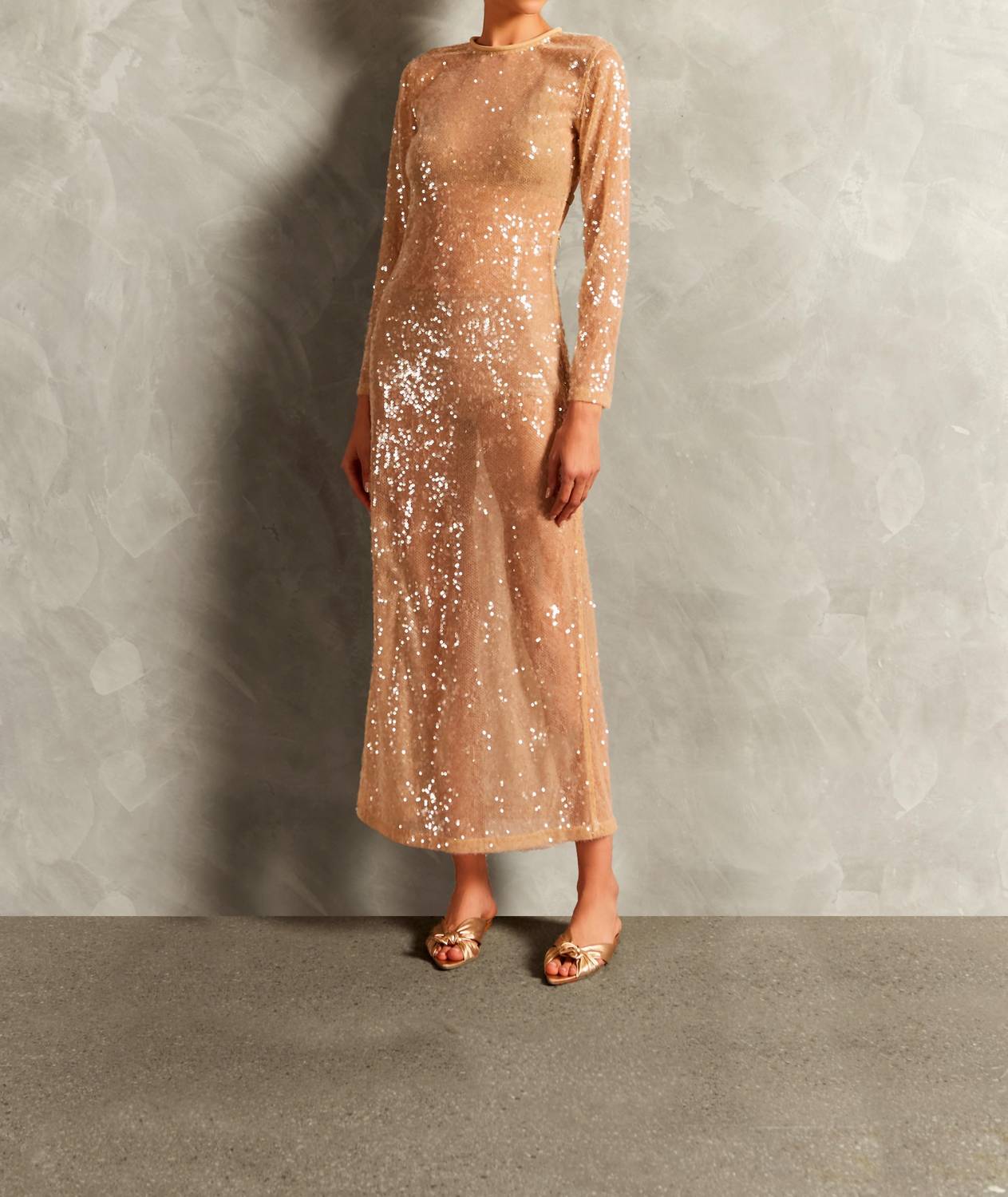 Style this maxi with your favorite statement necklace and sandals for the perfect look. Introducing the Sequins Open Back Maxi Dress by Adriana Degreas, a stunning beige piece designed for unmatched elegance at evening events. This sheath silhouette dress features long sleeves and a captivating open-back design with a crewneck neckline, blending minimalist trends with a touch of sensuality. Crafted from polyester, it incorporates a button closure for a secure fit. Perfect for spring gatherings, whether at a gallery opening or under swaying palms, this textured maxi dress is your go-to for a Thanksgiving holiday look.