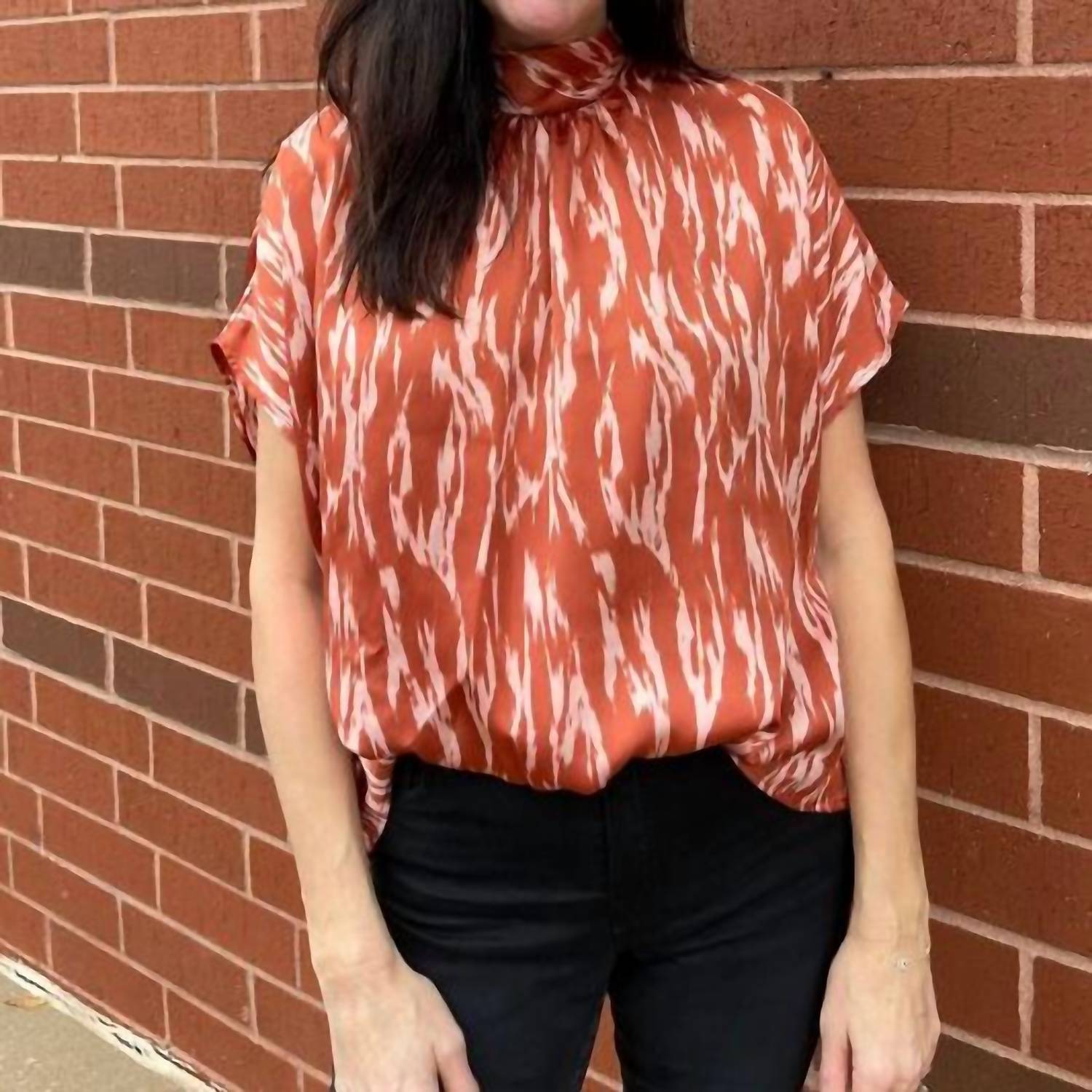 Pair this with your favorite jeans and slides for your next girls night out. Introducing the London Bubble Hem Top by ADRIENNE, an elegant addition to any wardrobe with its short sleeves and distinctive mock neck. This top is crafted from 100% Polyester, ensuring a comfortable fit in the Prairie Winds patterned fabric. Designed with a pull-on closure for easy wear, this versatile piece is perfect for your Boho Chic style, especially during spring or for a Thanksgiving holiday party. Elevate your look with its unique bubble hem and sophisticated flair.