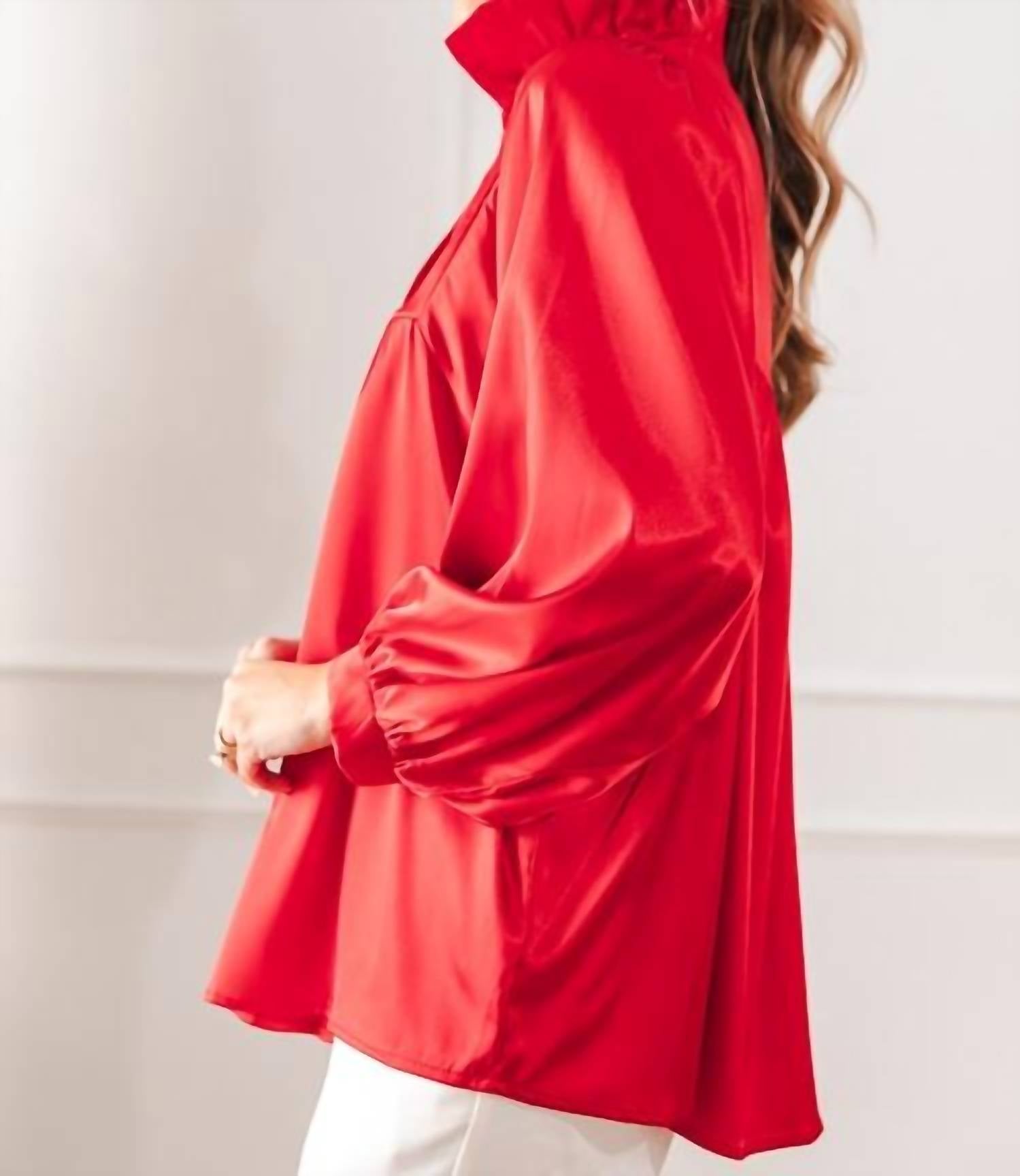 A timeless blouse that will never go out of style. Elevate your wardrobe this holiday season with the Morgan Ruffle Collar Satin Blouse by ADRIENNE, rendered in striking Chili Pepper. Featuring a luxuriously crafted three-quarter sleeve design, this blouse showcases an elegant standing ruffle collar for a sophisticated, high-end appeal. Made from a premium blend of 97% Polyester and 3% Spandex, this top ensures a perfect drape without stretch. Designed for effortless elegance, it boasts a pull-on closure and is styled for minimalist lovers of fashion.