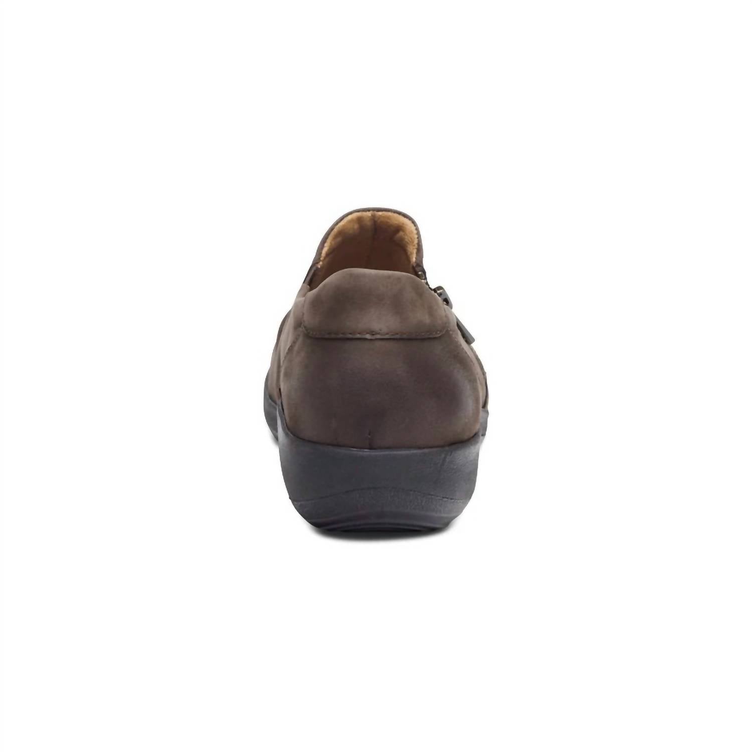 Loafers so versatile you can wear them with just about anything. Step into unparalleled comfort with the Women's Katie Zipper Monk by Aetrex, a stylish slip-on in Dark Earth leather. This casual yet sophisticated shoe features a side zipper and stretchy gore for effortless adjustability. Crafted with a genuine leather upper and built with a durable rubber outsole, it includes the Aetrex Orthotic System for arch support, pressure relief, and odor control. The 1.3” heel and round toe design make it perfect for a minimalist look at your next dinner party.