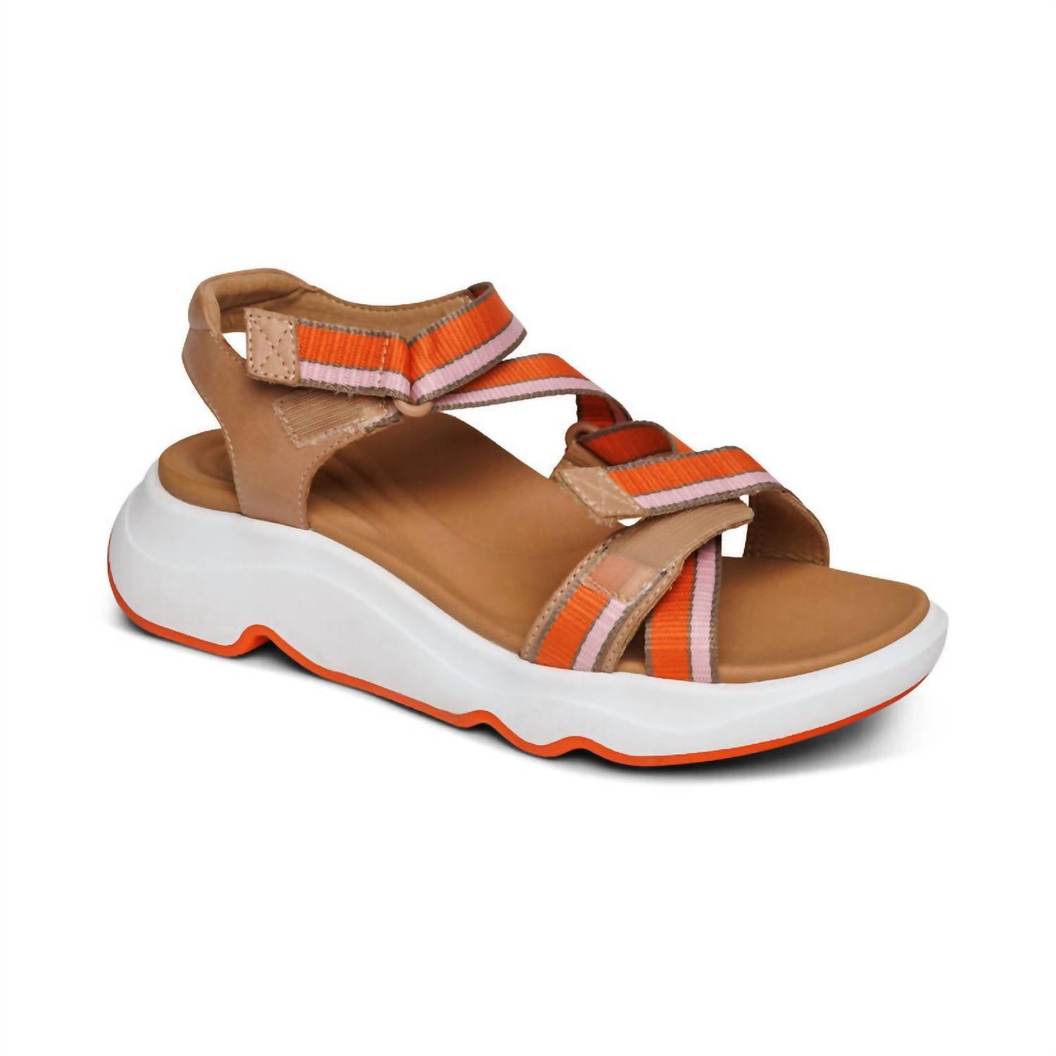 Classicly cute and all-day-wearable. We love this sandal. Step into stylish comfort with the Aetrex Women's Marz Adjustable Quarter Strap Sandal in chic camel. Designed with lightweight faux leather, these sandals feature a water-friendly build and hook & loop closures for adjustability. The UltraSky™ midsole offers superb cushioning, paired with a 1.85" platform heel for a subtle lift. Crafted for the minimalist at heart, these sandals ensure all-day comfort with built-in arch support and a padded collar, making them ideal for a dinner party or Thanksgiving gathering.