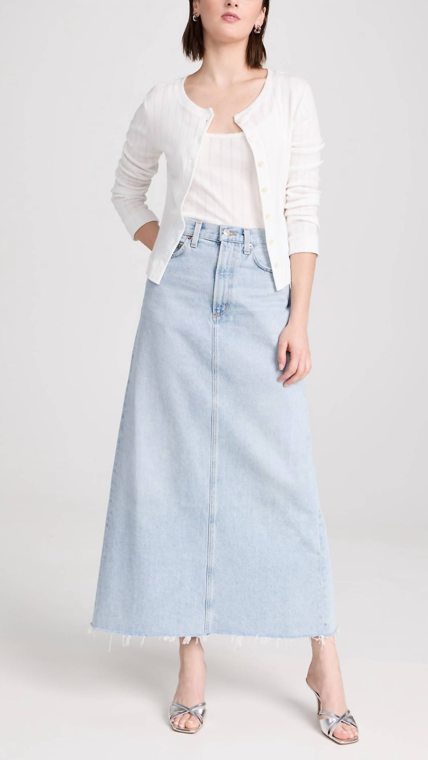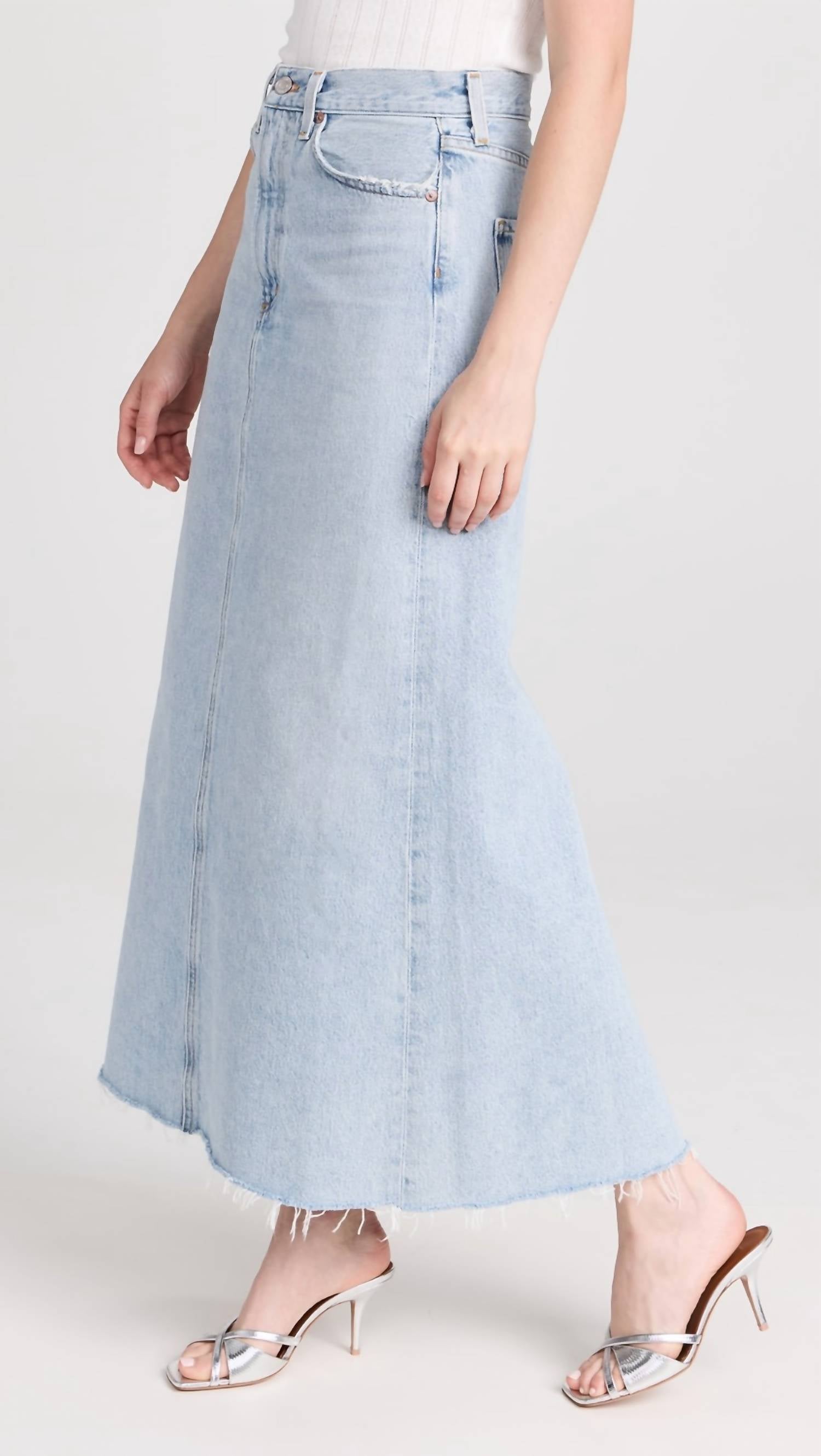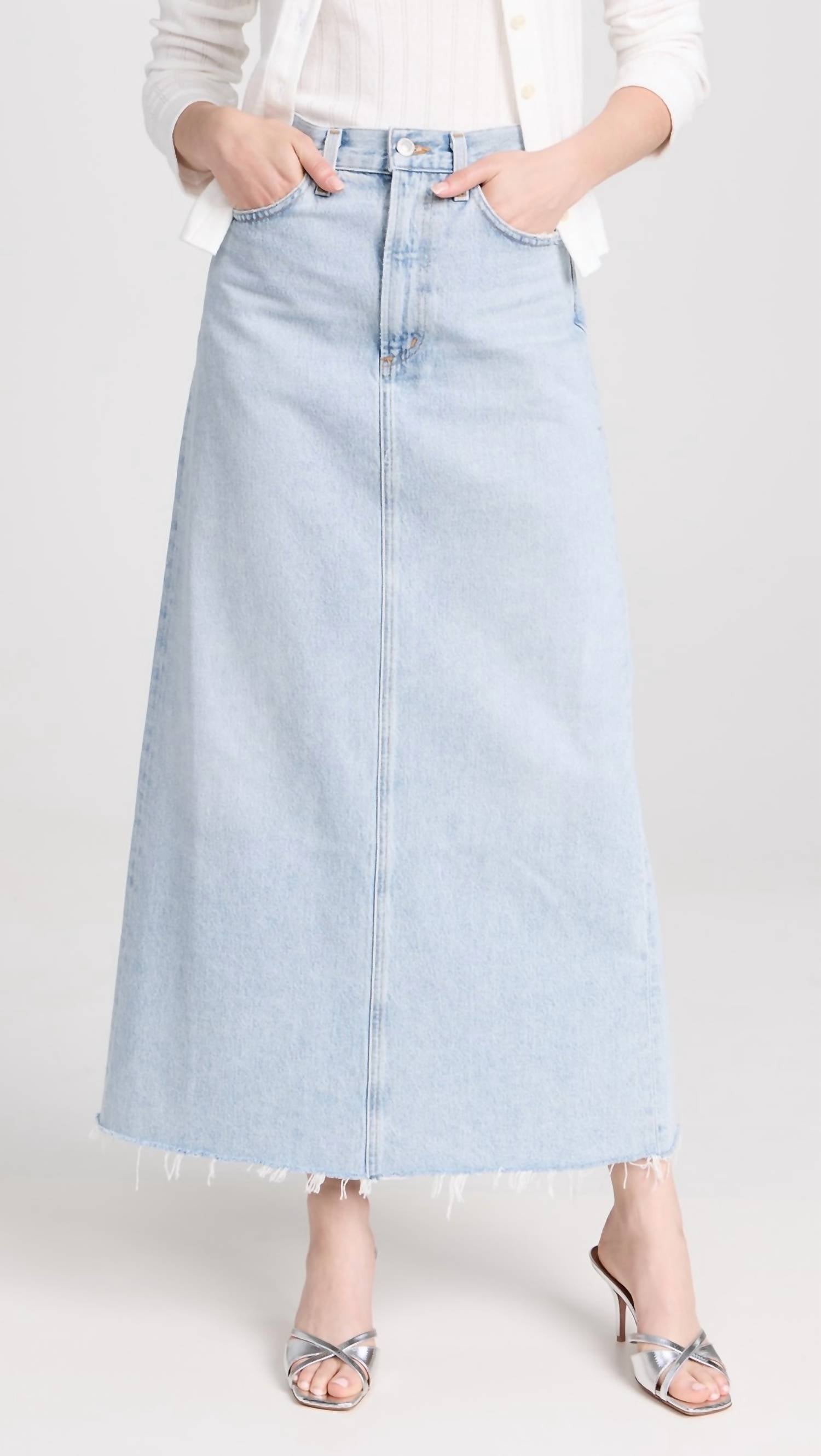 Flowy, comortable and stylish. This maxi skirt is a fan favorite. Discover the Hilla Longline Skirt by AGOLDE, a chic addition to your summer wardrobe. Crafted from textured cotton, this maxi skirt embodies a vintage charm perfect for vacation and Thanksgiving gatherings. It features convenient pockets and a button closure for easy wear. Care for this stylish piece with a simple machine wash.