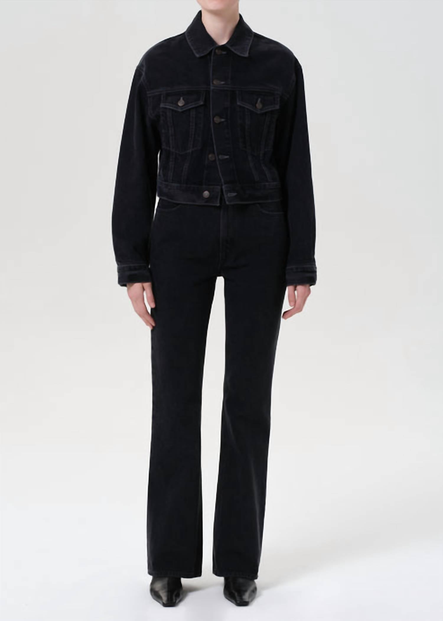 These must-have jeans are fit to perfection. Elevate your wardrobe with the AGOLDE Leena Jean, a high-rise flare designed for a flattering, elongated silhouette. Crafted from a sustainable cotton blend composed of 67% organic cotton, 22% recycled lyocell, and 11% post-consumer recycled cotton, these jeans offer a rigid, non-stretch feel paired with softness for all-day comfort. Originating from a timeless Forecast color with a washed-out black finish, the Leena features a 19" leg opening, an 11.75" rise, and a 33" inseam. The classic zip closure promises easy wear, and maintenance is simplified with machine wash cold and low tumble dry instructions. Model is 5'10" wearing size 27.