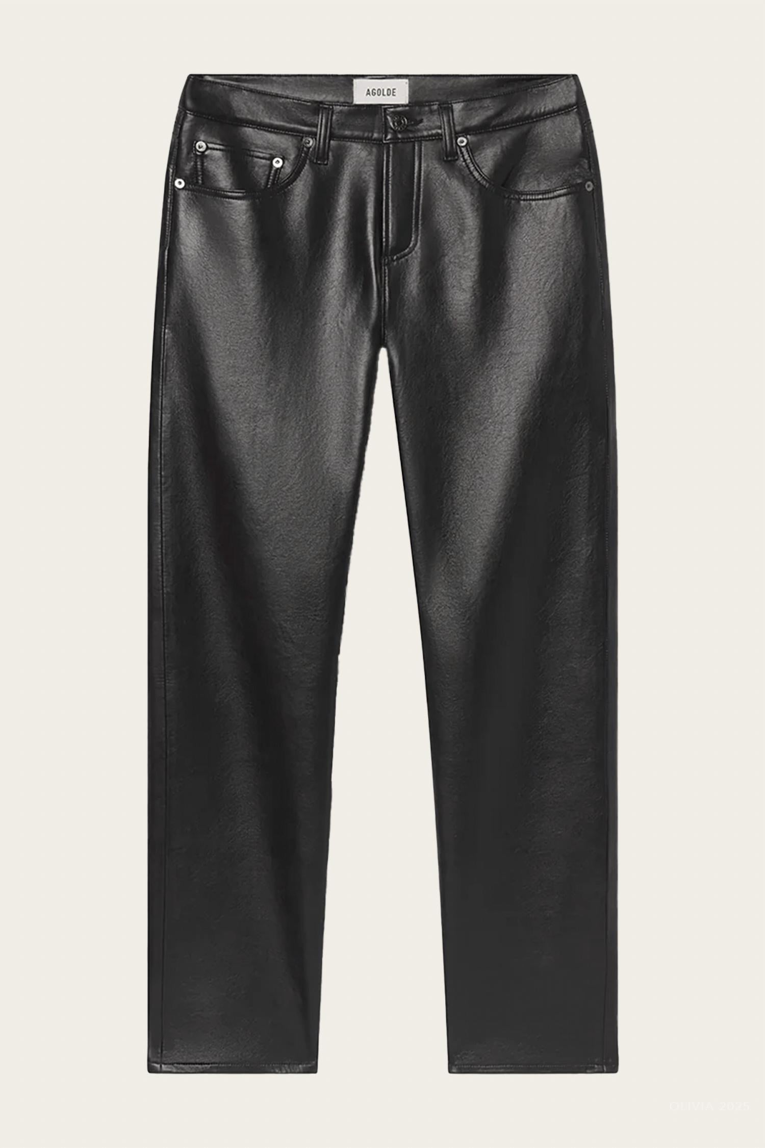 These must-have jeans are fit to perfection. Introducing the Low Rise Slim Fit Jeans by AGOLDE, a chic ensemble in Detox to elevate your fall wardrobe. This women's straight leg pair flaunts a solid pattern, crafted from 50% recycled leather, 30% polyurethane, 10% viscose, and 10% polyester for a sleek faux leather finish. Made in Turkey, these jeans feature a high-rise waist and a pull-on closure, offering a leg-lengthening inseam of 32 inches. Care: Machine wash and tumble dry for easy maintenance. Ideal for streetwear and special engagements, embodying modern elegance and sustainable fashion.