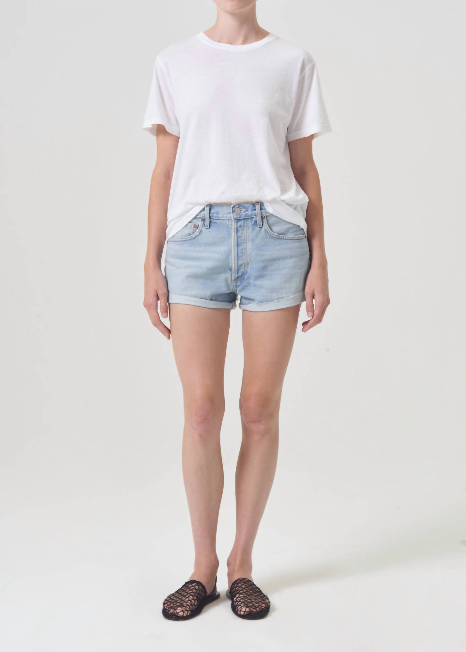 Jean shorts so versatile, you can literally wear them with anything. Meet the Parker Vintage Rolled Short by AGOLDE, a chic addition to any summer wardrobe. Designed in a high-rise fit, these Farewell-colored jean shorts boast a comfortable and flattering silhouette with a subtle rolled hem. Crafted from 100% regenerative cotton, they offer a solid pattern with practical pockets and a button closure. Made for ease, care involves machine washing inside out and tumble drying, making them ideal for vacation-ready streetwear.