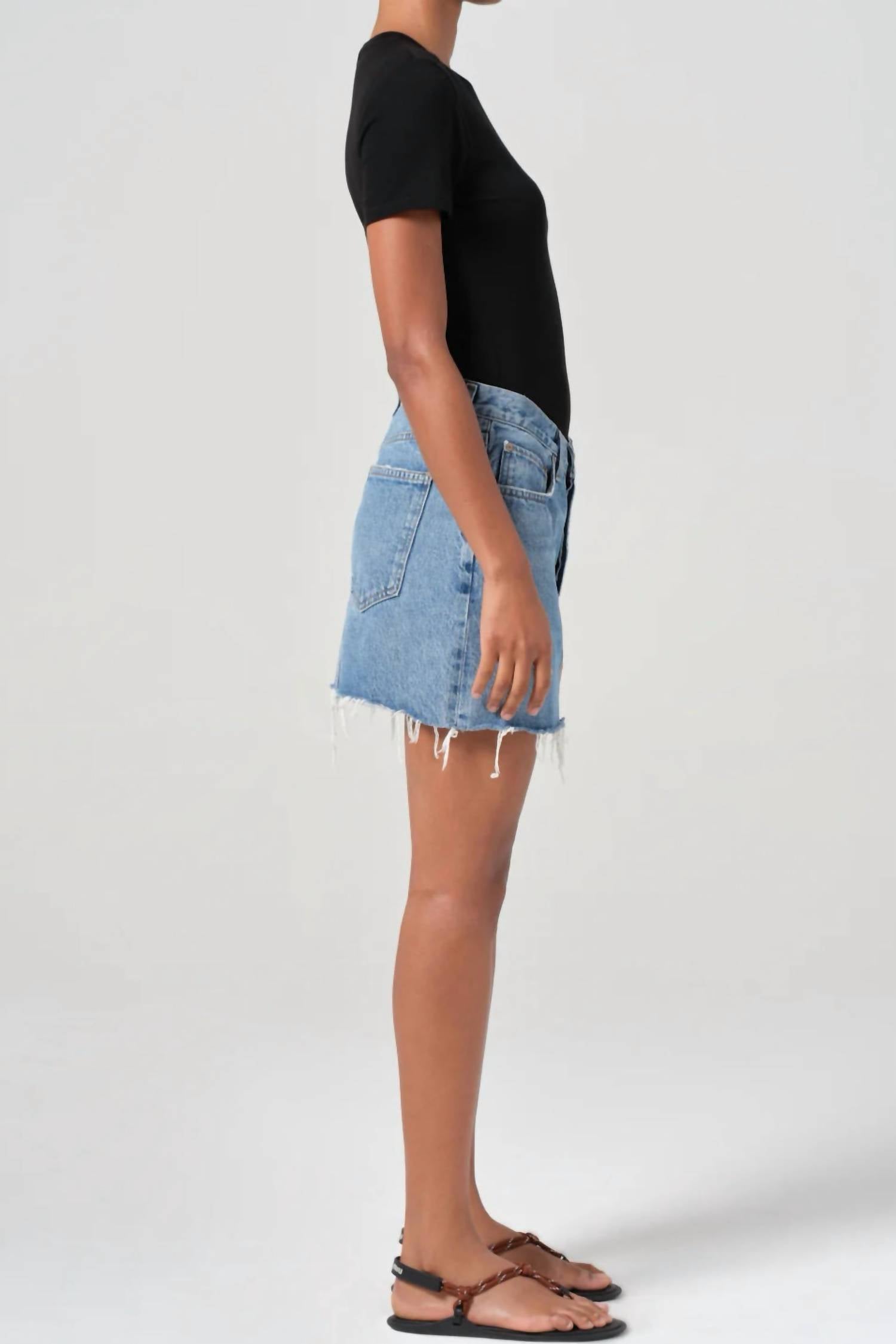 The perfect mini skirt does exist. Presenting the V-waist Mini Skirt by AGOLDE in the shade Fairway, a contemporary addition to any summer wardrobe. Featuring a flattering V-shaped waistband and a clean hem, this skirt boasts a relaxed fit for stylish comfort. Composition: 67% Regenerative Cotton, 22% Lyocell, 11% Post Consumer Recycled Cotton. Closure: Button closure. Care: Machine wash cold inside out with like colors, do not bleach, tumble dry low. Perfect for streetwear enthusiasts or back-to-school collections.