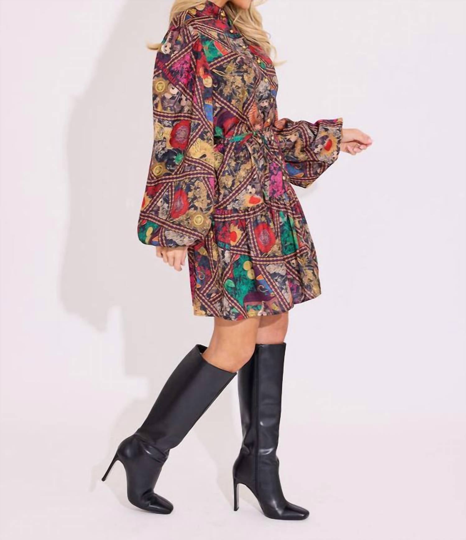 The kind of easy and flattering dress you'll be reaching for all season long. Discover the Alden Adair Adele Mini Dress, a captivating women's fit and flare piece in the exclusive Royalty pattern. Featuring long sleeves, this dress is crafted from smooth polyester for a luxurious look that fits engagement occasions perfectly. Designed with a mockneck and effortless button closure, its boho chic style embodies the essence of summer. Care: Machine wash and line dry.