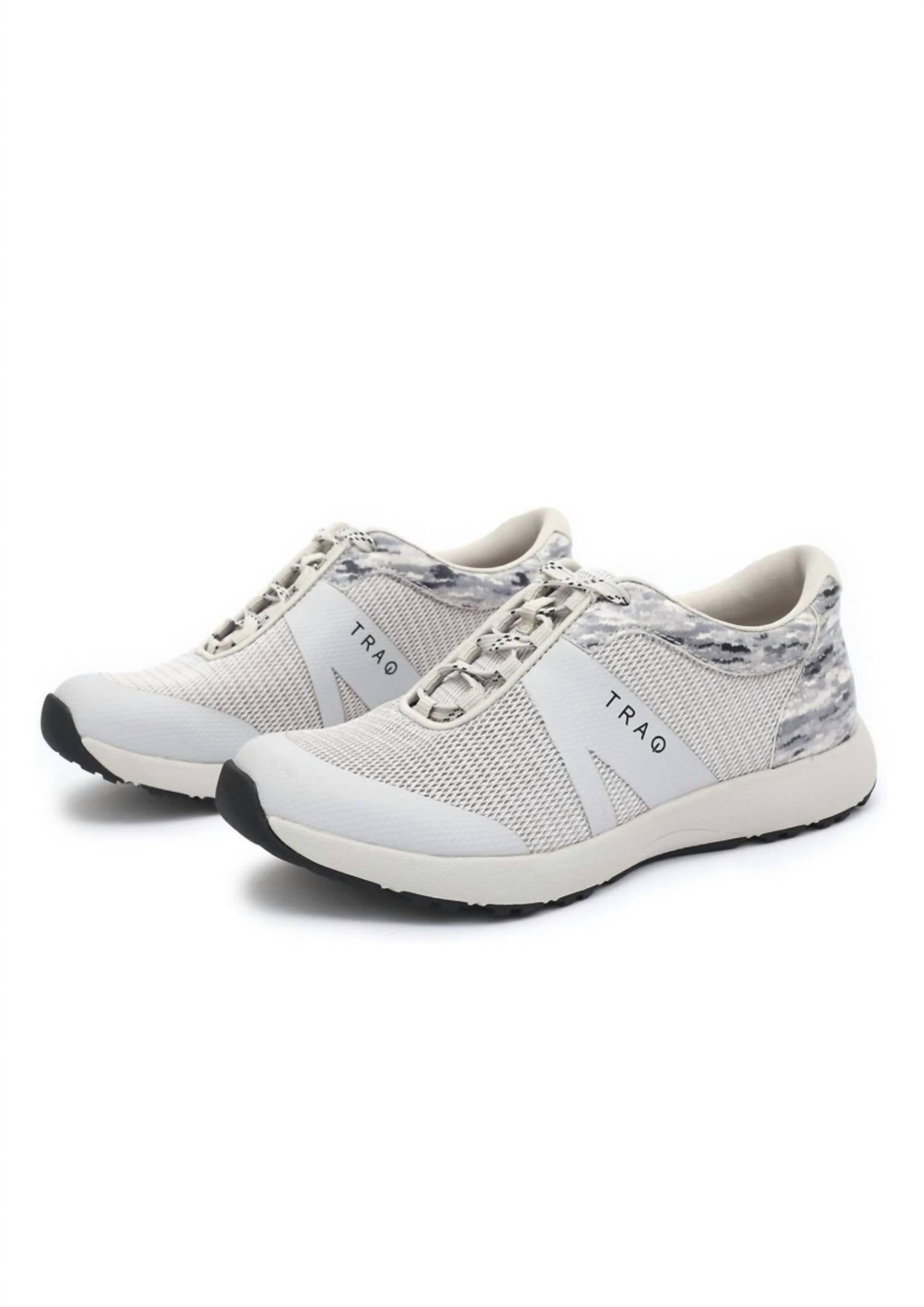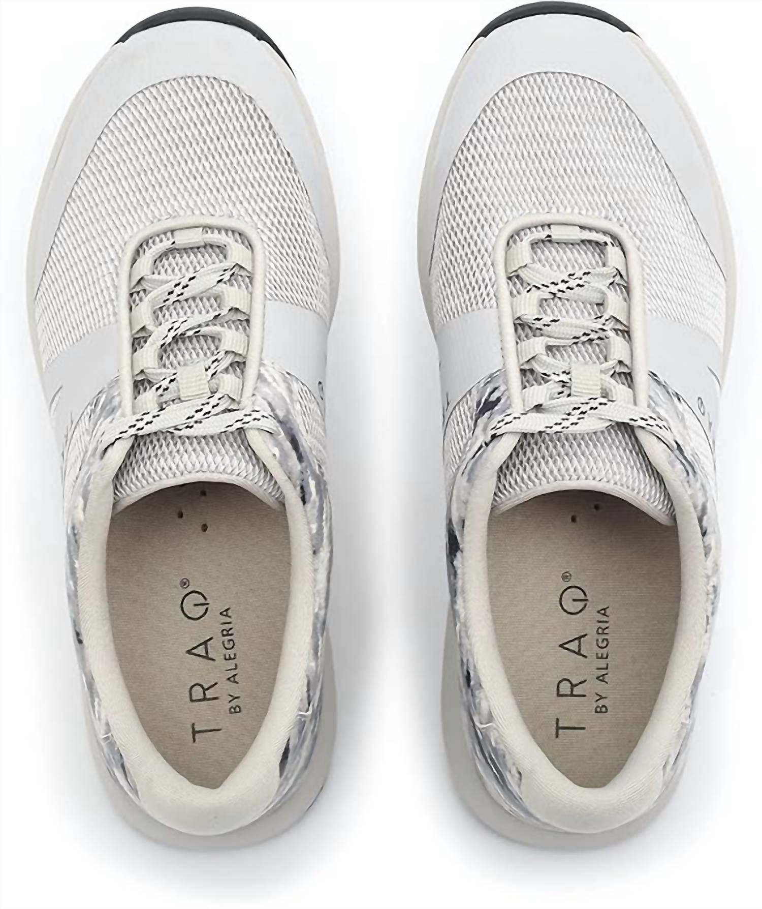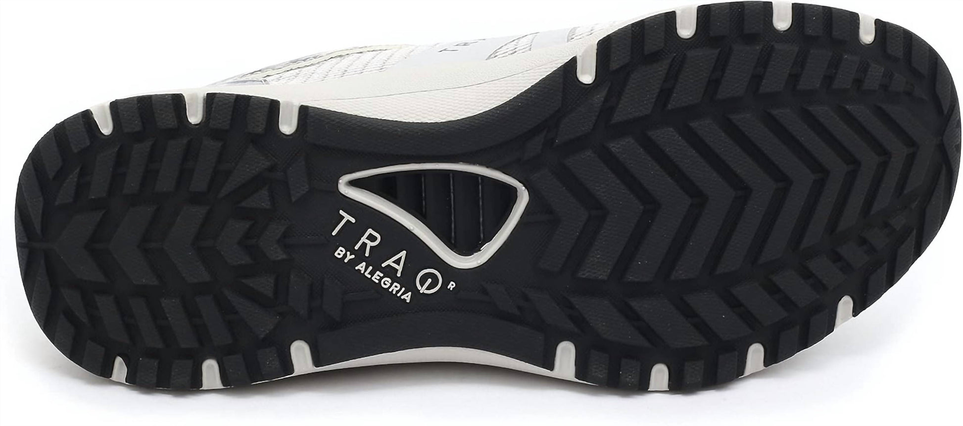 Stylish, comfortable and supportive. These athletic sneakers check all of the boxes. Step into comfort and style with the Women's Alegria Traq Intent 2 Athletic Shoes in white. Featuring a mesh upper and textile lining, these lace-up shoes are perfect for fitness and workout activities. The innovative Q-Chip technology syncs with the TRAQ by Alegria smartphone app for an accurate step count, while the enhanced high arch footbed and slip-resistant outsole provide all-day support and safety. Sole Material: Polyurethane. Toe Shape: Round Toe. Heel Style and Height: Low flat heel (1 1/4"-2"). Perfect for embracing the athleisure trend this summer.