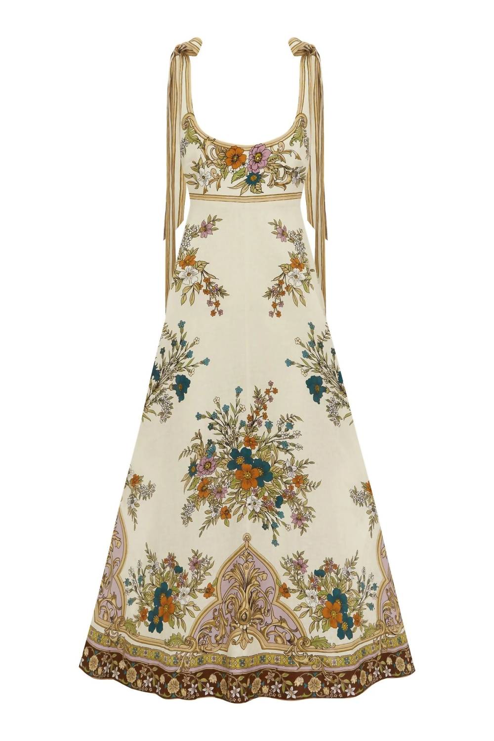 The perfect length dress does exist. Introducing the Antoinette Ballet Sundress by ALEMAIS, a breathtaking piece perfect for springtime elegance. This sleeveless sundress in a floral cream design features a midi length with adjustable self-tie straps and a shirred panel at the back bodice for a comfortable fit. With a composition of 100% European Linen, it also includes the convenience of inseam pockets and an invisible side zipper closure. Ideal for any spring outing, its scoop neckline and A-line silhouette ensure a timeless and flattering appearance.