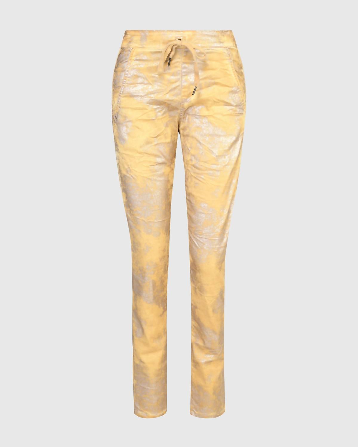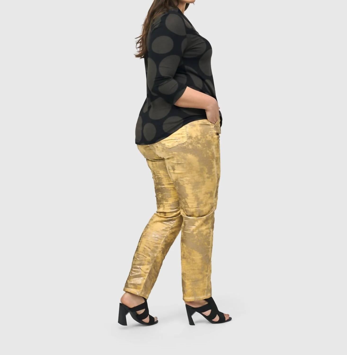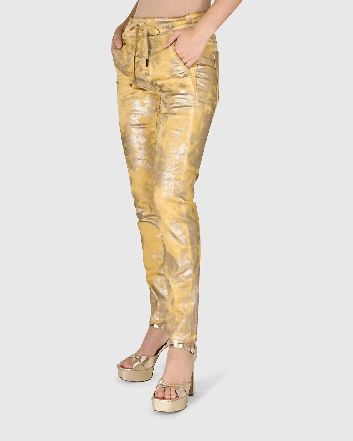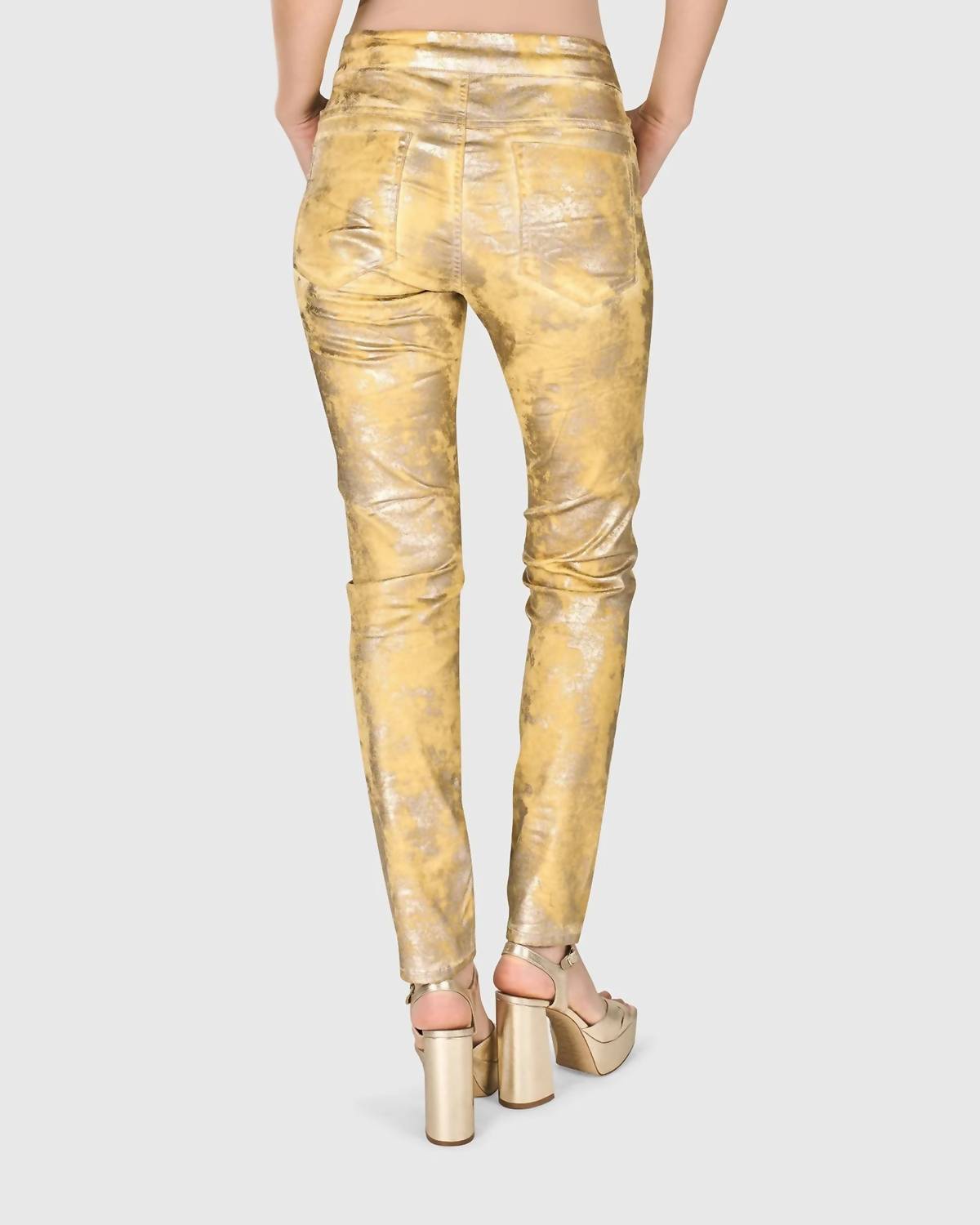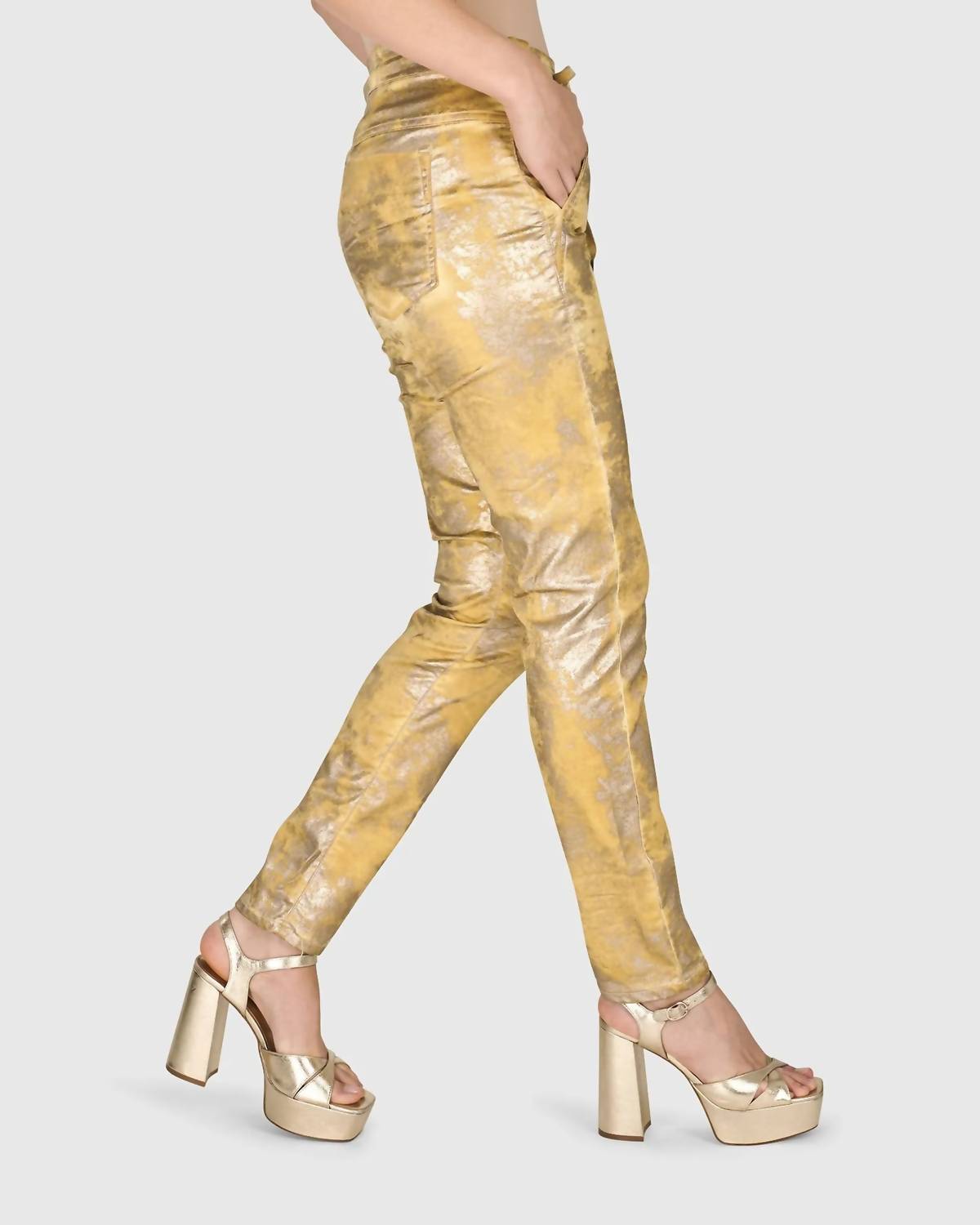 A skinny jean that is both flatering and comfortable. We love this style because it works great with boots, or without! Introducing the Iconic Stretch Jeans by ALEMBIKA, your new go-to for comfort and style. In a mesmerizing Honey Gold, these jeans boast a high-rise waist with a relaxed taper for a flattering fit, ensuring you never feel restricted. Made from a luxurious blend of 65% Cotton, 31% Polyester, and 4% Elastane, this woven masterpiece is designed and crafted in Israel. Featuring a pull-on closure, angled side pockets, and patch pockets, these jeans are perfect for a holiday party. Care: Machine wash for easy maintenance. Model Liel is 5'6" and wears size Alembika 6/L (US 16-18).