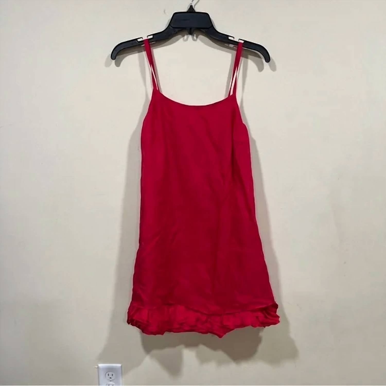 The perfect mini dress for those warmer months. Elevate your summer evening wardrobe with the Ruffle Hem Slip Dress by Alice + Olivia. Designed with delicate spaghetti straps and a flattering scoop neckline, this mini dress is crafted from luxurious silk in a striking red hue. Its pull-on style effortlessly complements its elegant slip silhouette, enhanced with a playful ruffle hem. Perfect for evening events, this solid-colored piece offers timeless sophistication.
